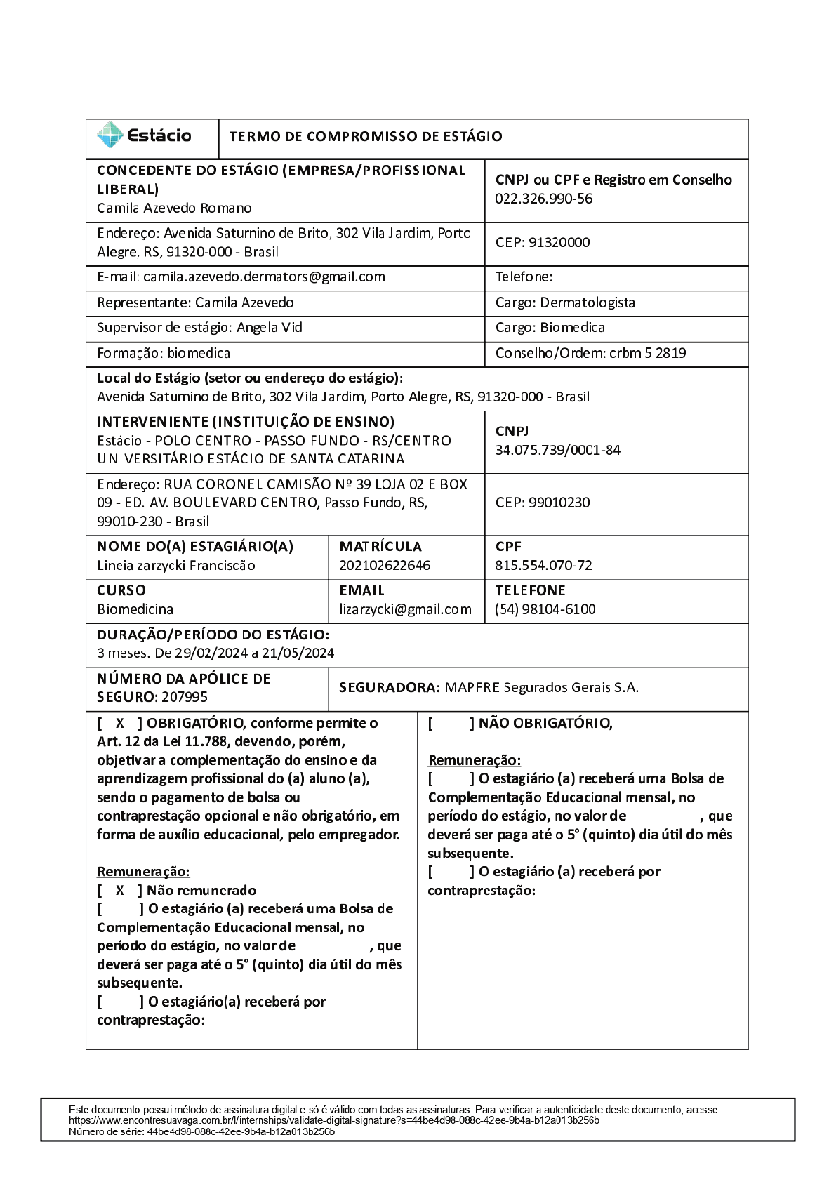 <p>1</p><p>Curso de Biomedicina</p><p>RELATóRIO FINAL DE ESTÁGIO SUPERVISIONADO CURRICULAR</p><p>Aluna: Lineia zarzycki Franciscão</p><p>Matrícula: 202102622646</p><p>Polo: Polo Centro - Passo Fundo - RS/Centro Universitário Estácio de Santa Catarina</p><p>E-Mail: lizarzycki@gmail.com</p><p>Porto Alegre, RS</p><p>21 de maio de 2024</p><p>2</p><p>Curso de Biomedicina</p><p>Professora orientadora Cássia Mariana Bronzon da Costa</p><p>Relatório de estágio obrigatório,</p><p>supervisionado por ngela Vid,</p><p>Biomédica, apresentado à Comissão</p><p>de curso de Biomedicina – ESTÁCIO</p><p>DE SÁ.</p><p>Porto Alegre, RS</p><p>21 de maio de 2024</p><p>3</p><p>Sumário</p><p>1.0 - Introdução........................................................................................................ 04</p><p>2.0 - Desenvolvimento.............................................................................................05</p><p>2.1 - Avaliação do Paciente............................................................................. 05</p><p>2.2 – Limpeza de Pele..................................................................................... 06</p><p>2.3 - Acompanhamento pacientes pós-procedimento...................................... 07</p><p>2.4 – Suporte com fornecedores ..................................................................... 08</p><p>2.5 - Estudo de casos clínicos ......................................................................... 08</p><p>2.6 - Grupo de Estudos em procedimentos estéticos .......................................09</p><p>3.0 - Conclusão.........................................................................................................10</p><p>4</p><p>1.0 - Introdução</p><p>Durante o período de estágio na renomada Clínica Camila Azevedo Romano,</p><p>localizada Avenida Saturnino de Brito, 302 Vila Jardim, Porto Alegre, RS, tive a</p><p>oportunidade única de mergulhar no universo da estética facial e aprimorar meus</p><p>conhecimentos teóricos e práticos na área. Sob a orientação e supervisão da</p><p>supervisora Angela Vid, uma profissional experiente no ramo da estética facial, pude</p><p>vivenciar uma imersão intensiva em protocolos e procedimentos estéticos de alta</p><p>qualidade.</p><p>O estágio representou um marco significativo em minha formação acadêmica,</p><p>proporcionando-me a oportunidade de aplicar na prática os conhecimentos adquiridos</p><p>ao longo do curso de Biomedicina (Estética). Durante os três meses de estágio, pude</p><p>não apenas aprimorar minhas habilidades técnicas, mas também desenvolver</p><p>competências essenciais para a minha futura atuação profissional, como o trabalho</p><p>em equipe, a comunicação eficaz com os pacientes e a capacidade de análise e</p><p>resolução de problemas.</p><p>A Clínica Camila Azevedo Romano se destaca no mercado pela excelência de</p><p>seus serviços e pela abordagem personalizada e humanizada no atendimento aos</p><p>pacientes. Ao longo do estágio, pude vivenciar de perto a filosofia da clínica, baseada</p><p>no compromisso com a qualidade, segurança e satisfação dos pacientes. A</p><p>supervisora Angela Vid e sua equipe demonstraram um profundo comprometimento</p><p>com a ética profissional e a busca constante pela atualização e inovação na área da</p><p>estética facial.</p><p>A experiência na Clínica Camila Azevedo Romano não se limitou apenas à</p><p>execução de procedimentos estéticos, mas também incluiu a participação em reuniões</p><p>clínicas, discussões de casos, estudos de novas técnicas e participação em eventos</p><p>da área. Essa imersão completa no universo da estética facial me proporcionou uma</p><p>visão abrangente e aprofundada sobre as diversas possibilidades de atuação do</p><p>biomédico esteta e a importância do constante aprimoramento profissional.</p><p>Ao longo deste relatório, apresentarei em detalhes as atividades desenvolvidas</p><p>durante o estágio na Clínica Camila Azevedo Romano, destacando os principais</p><p>protocolos e procedimentos estéticos aprendidos, os estudos de casos clínicos</p><p>acompanhados e a participação em grupo de estudos. A experiência adquirida durante</p><p>o estágio foi fundamental para o meu crescimento profissional e pessoal, consolidando</p><p>a minha paixão pela área da estética e fortalecendo a minha determinação em seguir</p><p>uma carreira de sucesso nesse segmento.</p><p>Agradeço imensamente à supervisora Angela Vid pela oportunidade de estagiar</p><p>na Clínica Camila Azevedo Romano e por todo o conhecimento compartilhado ao</p><p>longo desse período. Também expresso minha gratidão à minha orientadora</p><p>acadêmica, Camila dos Santos Alvim Theodoro de Oliveira, pelo apoio e incentivo</p><p>durante o estágio. Estou confiante de que os aprendizados e experiências adquiridos</p><p>na Clínica Camila Azevedo Romano serão fundamentais para a minha trajetória</p><p>profissional e contribuirão significativamente para o meu desenvolvimento como</p><p>biomédica esteta.</p><p>5</p><p>2.0 - Desenvolvimento</p><p>2.1 Protocolo de Limpeza de Pele</p><p>Durante o estágio na Clínica Camila Azevedo Romano, tive a oportunidade de</p><p>aprender e aprimorar o protocolo de limpeza de pele, um dos procedimentos mais</p><p>fundamentais e populares na área da estética facial. A limpeza de pele é essencial</p><p>para a manutenção da saúde e beleza da pele, pois remove impurezas, células</p><p>mortas, oleosidade excessiva e desobstrui os poros, promovendo uma pele mais</p><p>saudável e luminosa.</p><p>O protocolo de limpeza de pele na Clínica Camila Azevedo Romano segue um</p><p>processo cuidadoso e personalizado, adaptado às necessidades e características</p><p>individuais de cada paciente. Abaixo, descrevo as etapas principais desse protocolo,</p><p>com base na minha experiência durante o estágio:</p><p>1. Av