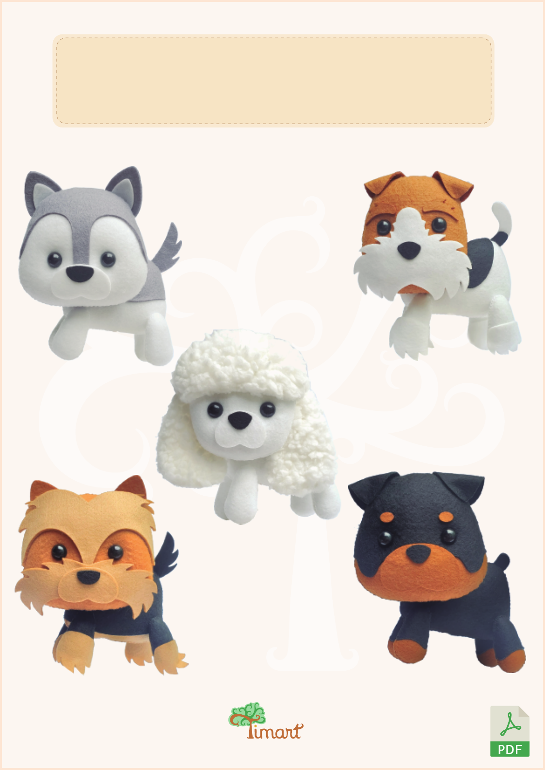 PACKET PAP Pronto para impressão em folha A4 www.timart.com.brwww.timart.com.br CONTEÚDO Pap em fotos e descrição Lista de materiais Molde em tamanho real Guia de cores ARQUIVO DIGITAL FORMATO Kit Cachorros 3 Contém 5 moldes - Tamanho aprox. 15 cm Passo a passo: D ob re a qu i D ob re a qu i Cole atrás Cole atrás Tamanho aproximado do boneco pronto: 15 cm www.timart.com.br PACKET PAP Sugestão: Corte no local indicado pela tesoura, dobre e cole nas indicações, formando um envelope para guardar o seu molde. Arquivo protegido e Registrado. Proibida a reprodução, revenda, compartilhamento ou edição desta apostila em qualquer mídia digital ou física, tanto parcial quanto na íntegra, sob pena prevista na Lei de Direitos Autorais nº 9610. Fox Terrier Lista de materiais Agulha de costura nº 7 / Linha branca e marrom / Enchimento / Cola quente / Feltro marrom caramelo, branco e preto / Meia Pérola preta 1 cm / Recorte o feltro nas cores e quantidades indicadas no molde. 1- Costure e encha cabeça, corpo e patas. 2- Cole os pêlos das patas. 3- Cole a mancha do rabinho, e a do corpo. Cole o rabo no corpo. 4- Cole as patas no corpo. 5- Cole o focinho e o nariz na cabeça. 6- Prenda os olhos e cole a sobrancelha. 7- Cole as orelhas. 8- Dobre a orelha e cole na pontinha. 9- Cole a cabeça no corpo. Veja mais dicas de confecção no nosso YouTube: youtube.com/timartartesanato G uia de cores (Feltros Santa Fé): 35 58 34 1x preto Focinho 1x branco Orelha 2x marrom caramelo Pata 8x branco Mancha corpo 1x preto Sobrancelha 2x marrom caramelo Mancha rabo 1x preto Rabo 1x branco Pêlo pata 4x branco Corpo 2xbranco Cabeça 2x marrom caramelo Passo a passo: D ob re a qu i D ob re a qu i Cole atrás Cole atrás Tamanho aproximado do boneco pronto: 15 cm www.timart.com.br PACKET PAP Sugestão: Corte no local indicado pela tesoura, dobre e cole nas indicações, formando um envelope para guardar o seu molde. Arquivo protegido e Registrado. Proibida a reprodução, revenda, compartilhamento ou edição desta apostila em qualquer mídia digital ou física, tanto parcial quanto na íntegra, sob pena prevista na Lei de Direitos Autorais nº 9610. Husk Siberiano Lista de materiais Agulha de costura nº 7 / Linha branca e cinza / Enchimento / Cola quente / Feltro branco, cinza e preto / Meia Pérola preta 1cm / Blush Recorte o feltro nas cores e quantidades indicadas no molde. 1- Cole o rosto cinza na parte branca da cabeça, ou costure. 2- Costure e encha cabeça, corpo e patas. 3- Costure a parte de cima da capinha cinza e cole no dorso do corpo. 4- Cole o focinho na cabeça e prenda os olhos. Cole as orelhas 5- Passe um pouco de blush nas bochechas. 6- Cole as patas, rabo e a cabeça no corpo. Dica: corte o rabinho duas vezes e cole um no outro para ficar mais durinho, com cola de silicone. Veja mais dicas de confecção no nosso YouTube: youtube.com/timartartesanato 36 G uia de cores (Feltros Santa Fé): 35 34 1x preto Fo ci nh o 1x br an co Orelha2x cinza Pa ta 8x b ra nc o Rosto 1x cinza Capinha corpo 2x cinza Rabo 1x cinza Orelha 2x branco Corpo 2x branco Cabeça 1x cinza 1x branco Passo a passo: D ob re a qu i D ob re a qu i Cole atrás Cole atrás Tamanho aproximado do boneco pronto: 15 cm www.timart.com.br PACKET PAP Sugestão: Corte no local indicado pela tesoura, dobre e cole nas indicações, formando um envelope para guardar o seu molde. Arquivo protegido e Registrado. Proibida a reprodução, revenda, compartilhamento ou edição desta apostila em qualquer mídia digital ou física, tanto parcial quanto na íntegra, sob pena prevista na Lei de Direitos Autorais nº 9610. Yorkshire Lista de materiais Agulha de costura nº 7 / Linha marrom claro e caramelo e preto / Enchimento / Cola quente / Feltro marrom claro, caramelo e preto / Meia Pérola preta 1 cm / Recorte o feltro nas cores e quantidades indicadas no molde. 1- Costure e encha cabeça, corpo e patas. 2- Costure a parte de cima da capinha do corpo, encaixe e cole no corpo. 3- Cole os pêlos das patinhas. 4- Cole o cabelinho na frente do rosto e o pelinho do nariz. 5- Cole o focinho e prenda os olhos. Cole os pelinhos na orelha e cole na parte de trás da cabeça. 6- Cole as patas no corpo e o rabo. Cole a cabeça no corpo. Dica: corte o rabinho duas vezes e cole um no outro para ficar mais durinho, com cola de silicone. Veja mais dicas de confecção no nosso YouTube: youtube.com/timartartesanato G uia de cores (Feltros Santa Fé): 56 58 34 Corpo 2x marrom claro Focinho 1x marrom claro 1x preto Capinha corpo 2x preto Pêlo nariz 1x marrom claro 2x marrom claro Cabeça 2x marrom caramelo Orelha 2x marrom caramelo Pata 8x preto Pêlo Rosto 1x marrom claro Rabo 1x preto Pêlo pata 4x marrom claro Arquivo protegido e Registrado. Proibida a reprodução, revenda, compartilhamento ou edição desta apostila em qualquer mídia digital ou física, tanto parcial quanto na íntegra, sob pena prevista na Lei de Direitos Autorais nº 9610. Passo a passo: D ob re a qu i D ob re a qu i Cole atrás Cole atrás Tamanho aproximado do boneco pronto: 15 cm www.timart.com.br PACKET PAP Sugestão: Corte no local indicado pela tesoura, dobre e cole nas indicações, formando um envelope para guardar o seu molde. Arquivo protegido e Registrado. Proibida a reprodução, revenda, compartilhamento ou edição desta apostila em qualquer mídia digital ou física, tanto parcial quanto na íntegra, sob pena prevista na Lei de Direitos Autorais nº 9610. Rottweiler Lista de materiais Agulha de costura nº 7 / Linha preta e marrom / Enchimento / Cola quente / Feltro preto e marrom caramelo / Meia Pérola preta 1 cm Recorte o feltro nas cores e quantidades indicadas no molde. 1- Cole o rosto preto na parte marrom da cabeça, ou costure. Costure e encha cabeça, corpo e patas. 2- Costure as manguinhas quase até o final, encaixe nas patinhas e termine de costurar. Cole se for preciso. 3- Cole as patas e o rabo no corpo. 4- Cole o focinho na cabeça e prenda o