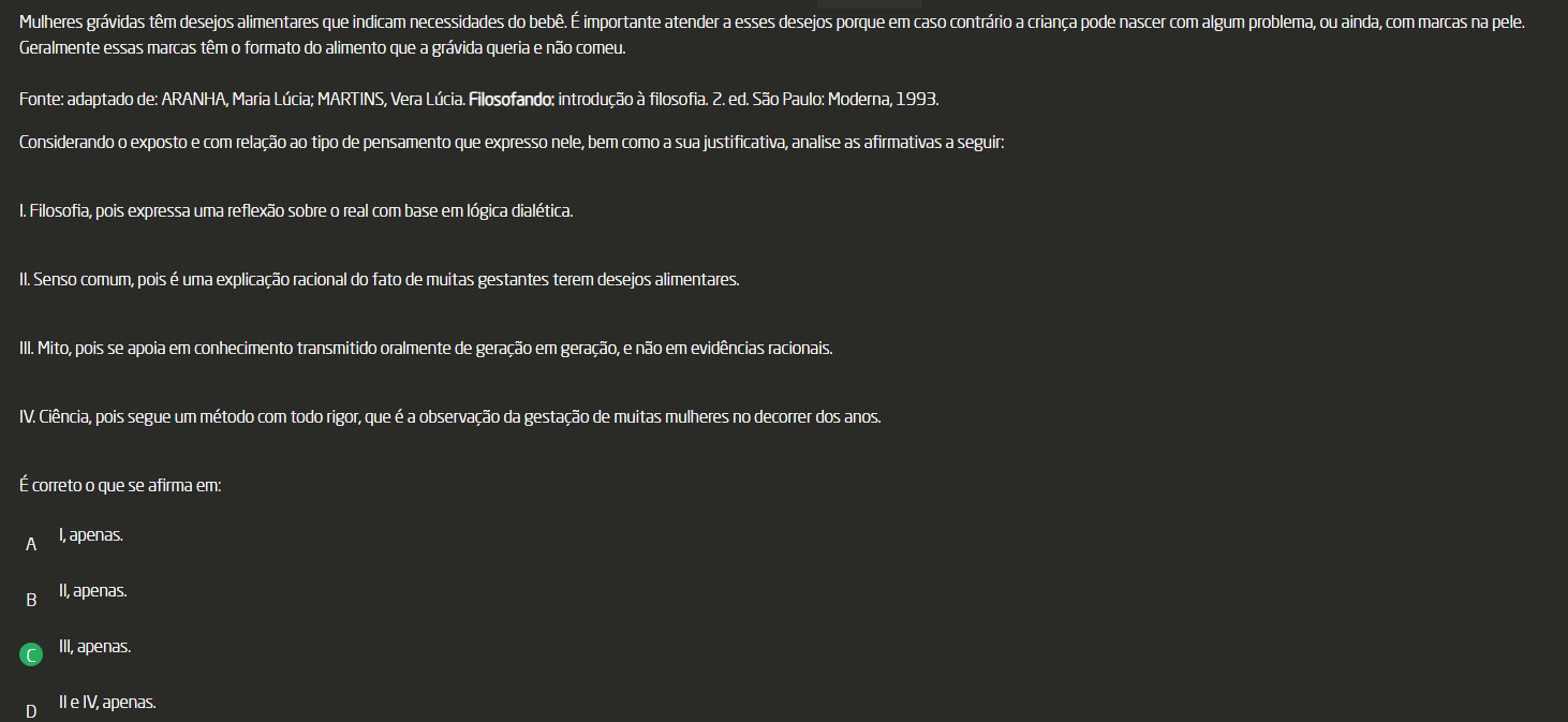 <p>Mulheres grávidas têm desejos alimentares que indicam necessidades do bebê. É importante atender a esses desejos porque em caso contrário a criança pode nascer com algum problema, ou ainda, com marcas na pele. Geralmente essas marcas têm formato do alimento que a grávida queria e não comeu. Fonte: adaptado de: Maria Lúcia; MARTINS, Vera Lúcia. Filosofando: introdução à filosofia. 2. ed. São Paulo: Moderna, 1993. Considerando exposto e com relação ao tipo de pensamento que expresso nele, bem como a sua justificativa, analise as afirmativas a seguir: Filosofia, pois expressa uma reflexão sobre real com base em lógica dialética. II. Senso comum, pois é uma explicação racional do fato de muitas gestantes terem desejos alimentares. III. Mito, pois se apoia em conhecimento transmitido oralmente de geração em geração, e não em evidências racionais. IV. Ciência, pois segue um método com todo rigor, que é a observação da gestação de muitas mulheres no decorrer dos anos. É correto que se afirma em: A I, apenas. B II, apenas. III, apenas. D II e IV, apenas.</p>