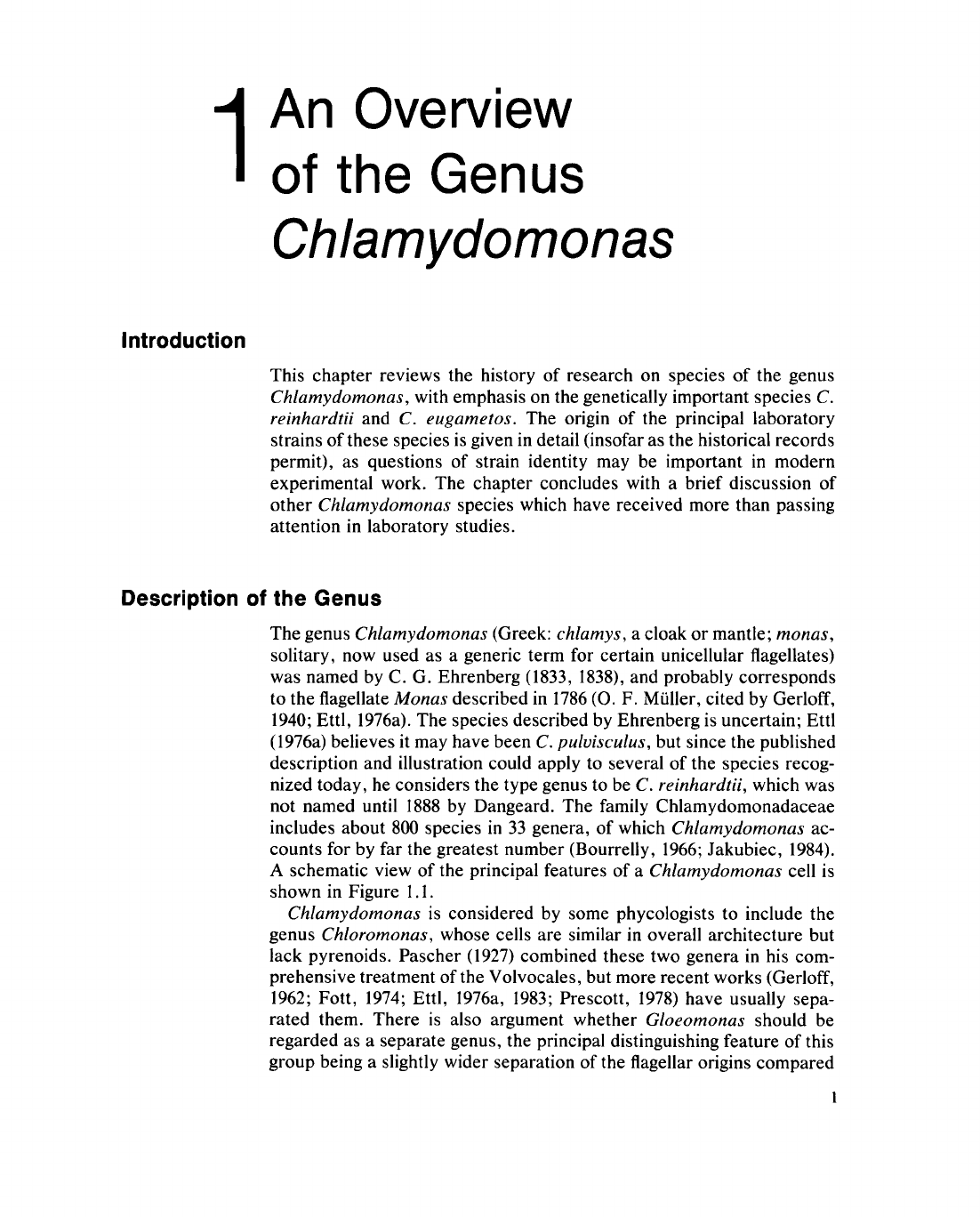 An Overview of the Genus Chlamydomonas Introduction This chapter reviews the history of research on species of the genus Chlamydomonas, with emphasis on the genetically important species C. reinhardtii and C. eugametos. The origin of the principal laboratory strains of these species is given in detail (insofar as the historical records permit), as questions of strain identity may be important in modern experimental work. The chapter concludes with a brief discussion of other Chlamydomonas species which have received more than passing attention in laboratory studies. Description of the Genus The genus Chlamydomonas (Greek: chlamys, a cloak or mantle; monas, solitary, now used as a generic term for certain unicellular flagellates) was named by C. G. Ehrenberg (1833, 1838), and probably corresponds to the flagellate Monas described in 1786 ( O . F. Müller, cited by Gerloff, 1940; Ettl, 1976a). The species described by Ehrenberg is uncertain; Ettl (1976a) believes it may have been C. pulvisculus, but since the published description and illustration could apply to several of the species recog- nized today, he considers the type genus to be C. reinhardtii, which was not named until 1888 by Dangeard. The family Chlamydomonadaceae includes about 800 species in 33 genera, of which Chlamydomonas ac- counts for by far the greatest number (Bourrelly, 1966; Jakubiec, 1984). A schematic view of the principal features of a Chlamydomonas cell is shown in Figure 1.1. Chlamydomonas is considered by some phycologists to include the genus Chloromonas, whose cells are similar in overall architecture but lack pyrenoids. Pascher (1927) combined these two genera in his com- prehensive treatment of the Vol vocales, but more recent works (Gerloff, 1962; Fott, 1974; Ettl, 1976a, 1983; Prescott, 1978) have usually sepa- rated them. There is also argument whether Gloeomonas should be regarded as a separate genus, the principal distinguishing feature of this group being a slightly wider separation of the flagellar origins compared 1 1 2 1. An Overview of the Genus Chlamydomonas Figure 1.1. Schematic diagram of a typical cell of Chlamydomonas reinhardtii. C, chlo- roplast; E, eyespot; F, flagella; FR, site of flagellar roots (see Figure 3.13 for detailed diagram); G, Golgi; M, mitochondria; N , nu- cleus with nucleolus; P, pyrenoid; V, vacu- ole; W, wall. to those of most Chlamydomonas species (see Ettl, 1965a,c; Fott, 1974). Another major genus of the same family is Carteria, whose cells have four rather than two flagella but otherwise look very much like those of Chlamydomonas. A t least one "Carteria" species has been demon- strated to be a long-lived quadriflagellate product of Chlamydomonas mating (Behlau, 1939; see Chapter 4) , and it is tempting to speculate that this may in fact be the evolutionary origin of this genus. Sphaerellopsis and Smithsonimonas have a wide, gelatinous sheath that differs from the shape of the protoplast, in contrast to Chlamydomonas and Chloro- monas, in which the sheath, if any, conforms closely to the protoplast shape. Polytoma is a genus of nonphotosynthetic flagellates that closely resemble Chlamydomonas in body structure and appear to retain some vestige of chloroplast nucleic acids and ribosomes (see Pringsheim, 1963a; Siu et al., 1976a-c). The genus Polytomella comprises another group of colorless species that differ from Polytoma in lacking cell walls. Dunaliella and related genera form an analogous group of wall-less green flagellates which in many respects appear very closely allied to the Chlamydomonadaceae. The evolutionary relationships of Chlamydo- monas to other genera, and particularly the position of the Volvocales as a side branch in the development of higher plants from green algae, have been explored in detail by investigators in several laboratories. The composition and organization of the cell wall, the morphology of the flagellar root system, and the structures involved in cytokinesis are the most significant features contributing to evolutionary schemes within Description of the Genus 3 the Chlorophyta (see Kochert, 1973; Pickett-Heaps, 1975; Ettl, 1981; see also Chapter 3 for further discussion). Although cell body shape and size vary among Chlamydomonas spe- cies (Figure 1.2), the overall polar structure, with paired apical flagella and basal chloroplast surrounding one or more pyrenoids, is constant. Cells are usually free-swimming in liquid media but on solid substrata may be nonflagellated and are often seen in gelatinous masses similar to those of the algae Palmella or Gloeocystis in the order Tetrasporales. This condition is referred to as a "palmelloid" state (Fott and N o v - akova, 1971). There is even some discussion that Gloeocystis may com- prise palmelloid Chlamydomonas species for which no motile stage has been identified (Badour et al., 1973). The Chlamydomonas wall is dis- tinct, with some variation in thickness among species, and some species secrete a mucilaginous polysaccharide coating. Most species have a prominent eyespot, usually red, and two or more contractile vacuoles. Asexual division occurs by lengthwise division of the protoplast. Usu- ally two successive divisions occur to form four daughter cells, which are then released from the mother cell wall. The forms of sexual repro- duction range from isogamy (fusion of morphologically similar gametes, the most prevalent form; Figure 1.3) to oogoniogamy or oogamy (forma- tion of clearly differentiated egg and sperm cells) and are not diagnostic of the genus (see Chapter 4 for further discussion). For many of the described species, no sexual cycle has been observed. Sexual fusion of whatever style leads to formation of a diploid zygospore with a hard, thick wall, which is resistant to adverse environmental conditions. Some species also form asexual resting spores, or akinetes. Dill (1895) listed 15 species of Chlamydomonas, of which six were new descriptions. By 1927 the list had grown to 
