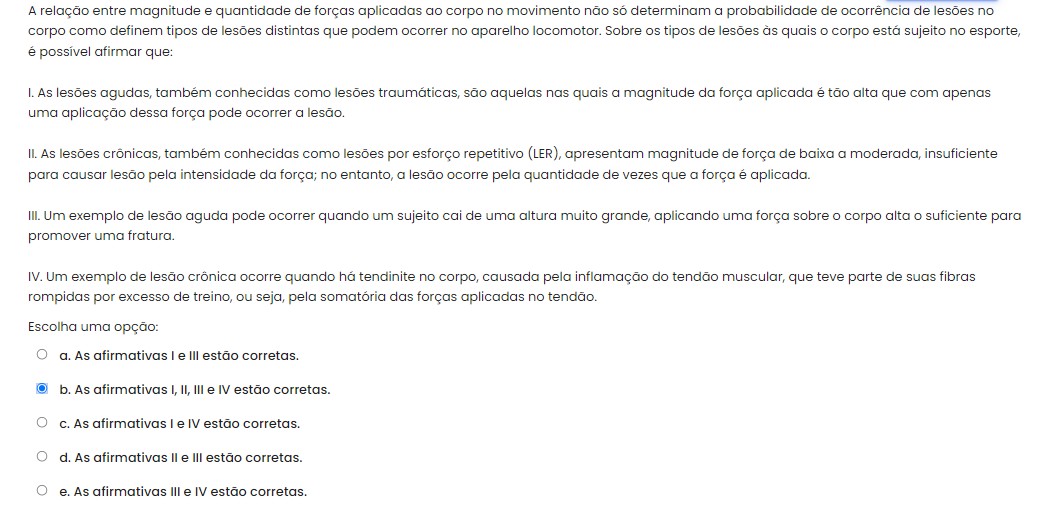<p>A relação entre magnitude e quantidade de forças aplicadas ao corpo no movimento não determinam a probabilidade de ocorrência de lesões no corpo como definem tipos de lesões distintas que podem ocorrer no aparelho Sobre os tipos de lesões às quais corpo está sujeito no esporte, é possível afirmar que: I. As lesões agudas, também conhecidas como lesões traumáticas, são aquelas nas quais a magnitude do força aplicada é tão alta que com apenas uma aplicação dessa força pode ocorrer a lesão. II. As lesões crônicas, também conhecidas como lesões por esforço repetitivo apresentam magnitude de força de baixa a moderada, insuficiente para causar lesão pelo intensidade do força; no entanto, a lesão ocorre pela quantidade de vezes que a força é aplicada. III. Um exemplo de lesão aguda pode ocorrer quando um sujeito cai de uma altura muito grande, aplicando uma força sobre corpo alta suficiente para promover uma IV. Um exemplo de lesão crônica ocorre quando há tendinite no corpo, causada pela inflamação do tendão muscular, que teve parte de suas fibras rompidas por excesso de treino, ou seja, somatória das forças aplicadas no Escolha uma opção: a. As afirmativas e III estão corretas. b. As afirmativas I, II, III e IV estão corretas. As afirmativas I e IV estão corretas. d. As afirmativas II e III estão corretas. e. As afirmativas III e IV estão</p>