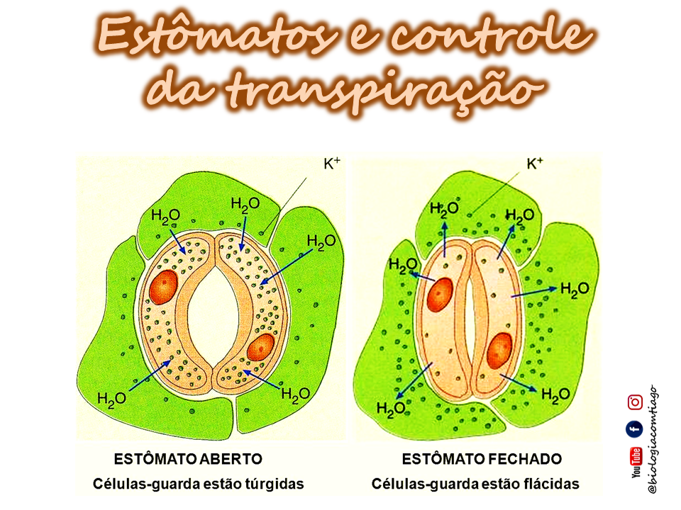 <p>e controle transpiração K+ K+ H2 2 2 H2O 2 2 H2O H2 ESTÔMATO ABERTO ESTÔMATO FECHADO Células-guarda estão túrgidas Células-guarda estão flácidas</p>
