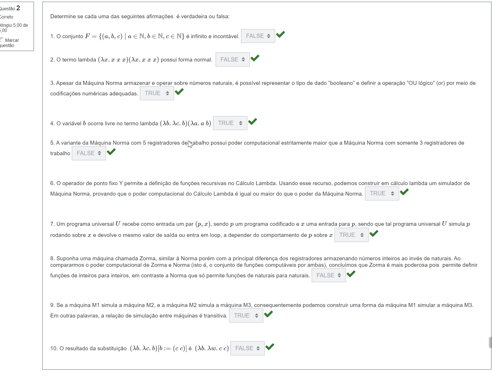 <p>Questão 2 Correto Determine se cada uma das seguintes afirmações é verdadeira ou falsa: Atingiu de ,00 1. conjunto a N, b E N, N} é infinito e FALSE Marcar 2. termo lambda possui forma normal. FALSE 3. Apesar da Máquina Norma armazenar e operar sobre números naturais, é possível representar o tipo de dado "booleano" e definir a operação "OU lógico" (or) por meio de codificações numéricas adequadas. TRUE 4. variável b ocorre livre no termo lambda TRUE 5. A variante da Máquina Norma com 5 registradores de trabalho possui poder computacional estritamente maior que a Máquina Norma com somente 3 registradores de trabalho FALSE 6. operador de ponto fixo Y permite a definição de funções recursivas no Cálculo Lambda. Usando esse recurso, podemos construir em cálculo lambda um simulador de Máquina Norma, provando que poder computacional do Cálculo Lambda é igual ou maior do que poder da Máquina Norma. TRUE 7. Um programa universal U recebe como entrada um par (p,x), sendo um programa codificado e x uma entrada para p, sendo que tal programa universal U simula rodando sobre x e devolve mesmo valor de saída ou entra em loop, a depender do comportamento de p sobre x TRUE 8. Suponha uma máquina chamada Zorma, similar à Norma porém com a principal diferença dos registradores armazenando números inteiros ao invés de naturais. Ao compararmos poder computacional de Zorma e Norma (isto é, conjunto de funções computáveis por ambas), concluímos que Zorma é mais poderosa pois permite definir funções de inteiros para inteiros, em contraste a Norma que só permite funções de naturais para naturais. FALSE 9. Se a máquina M1 simula a máquina M2, e a máquina M2 simula a máquina M3, consequentemente podemos construir uma forma da máquina M1 simular a máquina M3. Em outras palavras, a relação de simulação entre máquinas é transitiva. TRUE 10. resultado da FALSE</p>