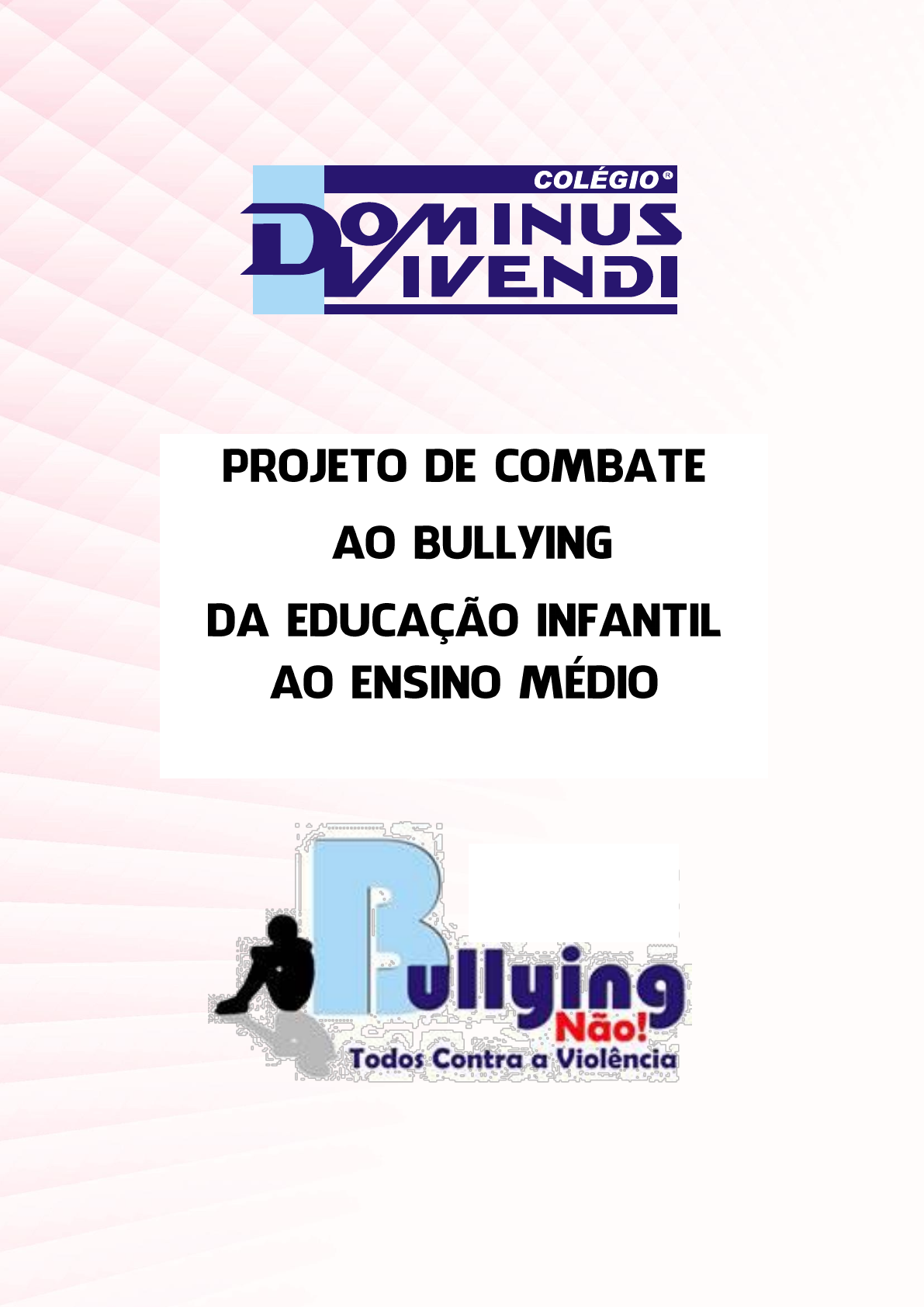 PROJETO DE COMBATE AO BULLYING DA EDUCAÇÃO INFANTIL AO ENSINO MÉDIO Introdução Atualmente o bullying é um dos principais desafios da rotina escolar. A palavra bullying não tem tradução exata para o português, é um tipo de agressão de caráter físico ou psicológico ocorrendo repetidamente e intencionalmente, ridicularizando, humilhando e intimidando suas vítimas. O Colégio Dominus Vivendi tem e sempre teve um olhar especial para essas questões, acreditando que esse tipo de agressão pode e deve ser cuidado – e prevenido – nas escolas, com conscientização dos professores, alunos e pais. Afinal, um ambiente escolar saudável é aquele em que a criança consegue aprender, se desenvolver, se expressar. Diante desse contexto, o Colégio Dominus realizará o referido projeto, uma vez que é também dever da escola incentivar a solidariedade, a generosidade, o respeito às diferenças por meio do diálogo e campanhas de incentivo à paz e à tolerância, educando para vida. É importante ressaltar que o bullying não se trata de pequenas brincadeiras próprias da infância e da adolescência, mas de casos de agressão e violências morais ou até físicas, podendo causar danos psicológicos sérios, comprometendo o processo de socialização e de aprendizagem, bem como, a saúde física e emocional das vítimas. Sabemos que tanto a escola como a família podem estabelecer regras para evitar a violência escolar. Em nossa escola as normas e regras que visam um bom convívio fazem parte do Manual da Família, à disposição no site do colégio. Lutar contra o abuso é uma responsabilidade de todos! Dentro do ambiente familiar deve existir a transmissão de valores humanos, normas e comportamentos essenciais à socialização das crianças no âmbito educacional. Desta forma é imprescindível que ESCOLA e FAMÍLIA caminhem juntas, no combate e prevenção à prática do bullying. Justificativa A partir dessa definição, o Colégio Dominus Vivendi vem desenvolvendo atividades escolares de conscientização, combate e prevenção à prática de bullying, visto que esta é uma das formas de violência que mais cresce no mundo. O bullying pode ocorrer em qualquer contexto social, como escolas, condomínios, clubes, universidades, famílias, vizinhanças e locais de trabalho. O que pode parecer um apelido simples e inofensivo pode afetar emocionalmente e fisicamente um indivíduo, acarretando possível isolamento ou queda do rendimento escolar. Essa manifestação de violência nas instituições de ensino vem preocupando educadores em geral, pois autores de bullying, denominados “bullies”, perseguem e hostilizam suas vítimas, desferindo-lhes uma série de maus tratos, com apelidos pejorativos, humilhações, zoações, exclusões, perseguições, difamações. As agressões podem ser verbais, morais, sexuais, físicas, materiais, psicológicas e virtuais, com o intuito de ferir o outro de forma ameaçadora. Temos em mente que a prevenção ao bullying escolar começa pelo conhecimento, orientação e que a escola deve propiciar um ambiente agradável, acolhedor e seguro, para que o aluno, impossibilitado de defesa, possa recorrer à ajuda de nossos profissionais adequadamente. Não podemos ser coniventes, omissos e permissivos a esta violência! O comprometimento da comunidade escolar no desenvolvimento de programas antibullying, em parceria com a família e membros da sociedade, orientando e conscientizando seus alunos sobre a gravidade desse tipo de comportamento, certamente resultará em benefícios a todos. A lei federal nº 13.185 de 6 de novembro de 2015 instituiu o programa de combate à intimidação sistemática (Bullying) em todo o território nacional, portanto determinados comportamentos são passíveis de punição em Lei. Essa lei que entrou em vigor em 6 de fevereiro de 2016 é de fundamental importância, pois é dever da escola e direito da criança e do adolescente assegurado no Estatuto da Criança e do Adolescente o respeito, a prevenção a ocorrências, a proteção, a educação e a permanência na escola. E imprescindível que todos tenhamos em mente, enquanto educadores, a responsabilidade com nossas crianças e jovens de acordo com as Leis a seguir: - Artigo 146 do Código Penal: Constranger alguém, mediante violência ou grave ameaça, ou depois de lhe haver reduzido, por qualquer outro meio, a capacidade de resistência, é crime de constrangimento ilegal. - Artigo 147 do Código Penal: Ameaçar alguém, por palavra, escrita ou gesto, ou qualquer outro meio simbólico, também é crime e o autor deverá responder na justiça. - Artigo 5º - Lei 8.069/90 Estatuto da Criança e do Adolescente: Nenhuma criança ou adolescente será objeto de qualquer forma de negligência, discriminação, exploração, violência, crueldade e opressão, punido na forma da lei qualquer atentado, por ação ou omissão, aos seus direitos fundamentais. - Artigo 17 - Lei 8.069/90 Estatuto da Criança e do Adolescente: O direito ao respeito consiste na inviolabilidade da integridade física, psíquica e moral da criança e do adolescente, abrangendo a preservação da imagem, da identidade, da autonomia, dos valores, ideias e crenças, dos espaços e objetos pessoais. Nossas ações _ Orientar a comunidade escolar acerca da prevenção e combate a prática de bullying na escola, através de campanhas e atividades educativas, informativas e de conscientização. _ Prevenir e combater a prática de bullying. _ Orientar docentes e equipe pedagógica para a implementação de ações de discussão, prevenção e solução de problemas. _ Esclarecer e informar às leis que punem a prática do bullying. _ Reconhecer os possíveis casos de bullying no âmbito educacional, identificando os alunos praticantes e as vítimas. _ Distinguir o que é brincadeira e o que é bullying. _ Realizar atividades educativas e de conscientização através da construção e exposição de c