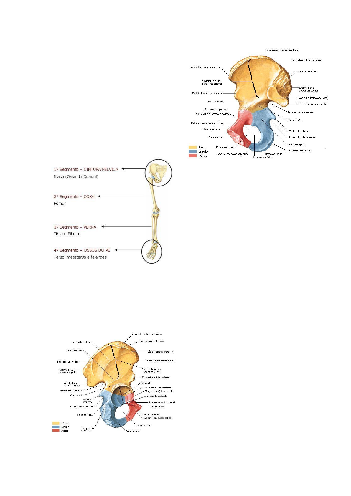 Osso do membro Inferior os ossos dos membros inferiores podem ser divididos em quatro segmentos: cintura pélvica- ilíaco (osso do quadril) coxa- fêmur e patela perna- tíbia e fíbula pé- ossos do pé Ilíaco (osso do quadril) -Osso ilíaco, um dos dois ossos que formam a cintura pélvica, resultante da soldadura do ílio, do ísquio e do púbis. Acetábulo- Relativo ao acetábulo ou cavidade do osso ilíaco, onde encaixa e se articula a cabeça do fémur. Forame abturado- é uma abertura (forame) existente no osso do quadril. É formado pelo ísquio e pelo púbis, que são partes desse osso. Face auricular- se articula com o sacro Face sinfisial- sínfise púbica (é uma articulação semimóvel que une o púbis formando a bacia (cintura pélvica), que é composta pelo sacro e cóccix, e dois ossos do quadril, que por sua vez, cada osso, é composto por três ossos compactados: ílio, ísquio e o osso púbico.) Fêmur- é o mais longo e pesado osso do corpo. O fêmur consiste em uma diáfise e duas epífises. Articula-se Osso do membro Inferior proximalmente com o osso do quadril e distalmente com a patela e a tíbia. Epífise proximal- cabeça do fêmur Colo do fêmur- Ele fica localizado na região da coxa, ligando-se ao joelho na extremidade inferior e à pelve na extremidade superior. Nesta extremidade superior, o fêmur apresenta uma projeção óssea, dividida em 3 partes: cabeça do fêmur, pescoço do fêmur (também chamada colo do fêmur) e trocante maior. Trocânter maior- O trocânter maior é o ponto mais proeminente do osso do fêmur e está associado a uma condição de dor chamada bursite trocantérica, mais comum em mulheres, mas também está associado a um tipo de fratura comum em ortopedia, a fratura transtrocantérica. Trocânter menor- Pequena proeminência arredondada, que se projeta posteriormente ao limite entre o colo e o corpo do fêmur, em direção ântero-medial, para a fixaçāo do músculo iliopsoas Epífise distal- epicôndilos laterais e medial Face patelar- A patela é um osso tipo sesamóide (que fica no meio de um conjunto tendinoso), com formato Osso do membro Inferior triangular, e localizado na frente do joelho Tíbia- Exceto pelo fêmur, a tíbia é o maior osso no corpo que suporta peso. Está localizada no lado ântero-medial da perna. Apresenta duas epífises e uma diáfise. Articula-se proximalmente com o fêmur e a fíbula e distalmente com o tálus e a fíbula. Epífise proximal- tuberosidade da tíbia (A tuberosidade da tíbia é uma proeminência óssea localizada na parte da frente do joelho, no local de fixação do tendão patelar.) Epífise distal- maléolo medial (Maléolos são proeminências ósseas que existem nos ossos da tíbia e da fíbula. Cada maléolo possui um sulco maleolar e uma face articular maleolar. A tíbia possui o maléolo medial que se articula com o osso tálus na sua face maleolar medial.) Fíbula- A fina fíbula situa-se póstero-lateralmente à titia e serve principalmente para fixação de músculos. Não possui função de sustentação de peso. Articula-se com a titia (proximalmente e distalmente) e o tálus distalmente. Epífise proximal- cabeça Epífise distal- maléolo lateral Osso do membro Inferior Ossos do pé- contagem do dedão para o dedo mínimo. Dedão chamado de Hálux Medial- lateral