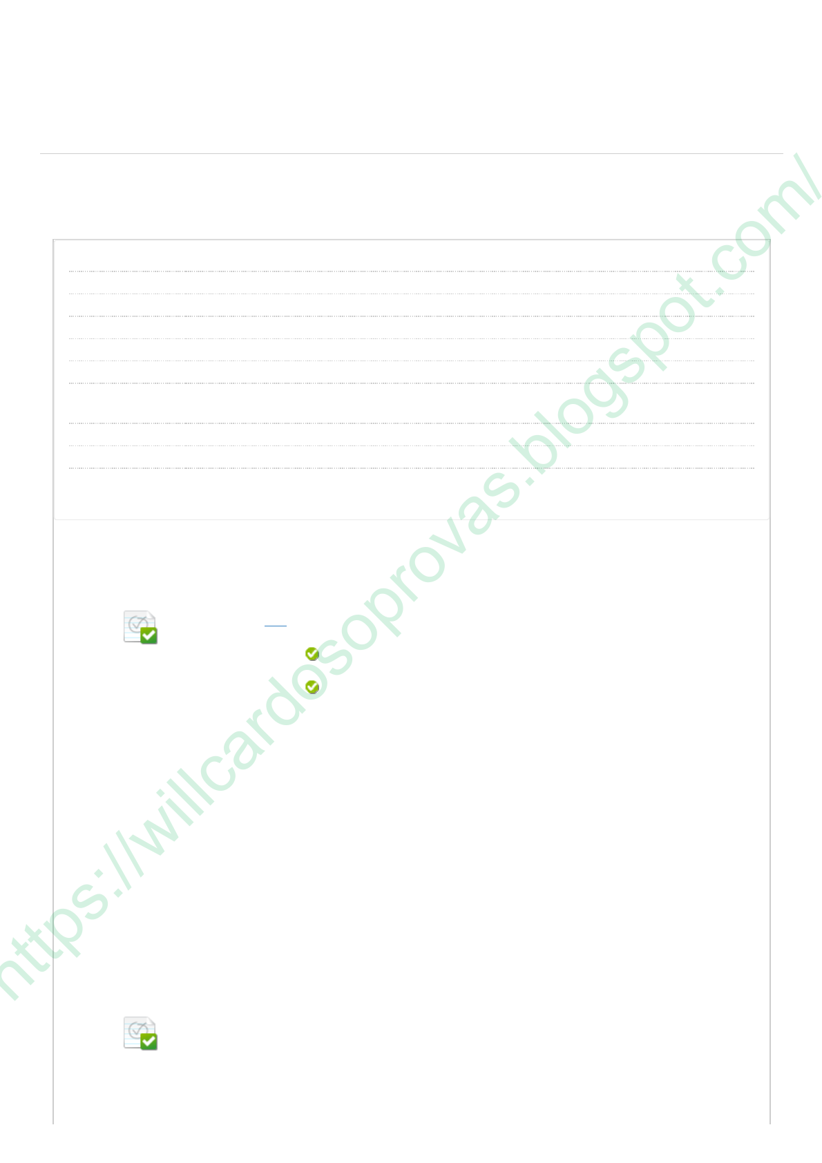 22/02/2022 18:53 Revisar envio do teste: ATIVIDADE TELEAULA II – SISTEMAS... https://ava.ead.unip.br/webapps/assessment/review/review.jsp?attempt_id=_75275065_1&course_id=_208378_1&content_id=_2564525_1&retur… 1/3 Revisar envio do teste: ATIVIDADE TELEAULA II SISTEMAS DE INFORMAÇÃO EM COMÉRCIO E SERVIÇOS 7121-60_55819_R_E1_20221 CONTEÚDO Usuário Curso SISTEMAS DE INFORMAÇÃO EM COMÉRCIO E SERVIÇOS Teste ATIVIDADE TELEAULA II Iniciado 22/02/22 18:51 Enviado 22/02/22 18:53 Status Completada Resultado da tentativa 0 em 0 pontos Tempo decorrido 1 minuto Autoteste O aluno responde e o resultado do aluno não é visível ao professor. Resultados exibidos Todas as respostas, Respostas enviadas, Respostas corretas, Comentários, Perguntas respondidas incorretamente Pergunta 1 Resposta Selecionada: a. Respostas: a. b. c. d. e. Comentário da resposta: A alternativa que não corresponde à forma como o conhecimento pode ser classi�cado é: Sociológico. Sociológico. Teológico. Popular. Intuitivo. Cientí�co. Resposta: a) Pergunta 2 Citamos vários benefícios que os SGBD trazem para o mundo corporativos, dentre eles: I. Rapidez na manipulação e no acesso à informação. II. Aumento do esforço humano (desenvolvimento e utilização). III. Disponibilização da informação no tempo necessário. Está correto: UNIP EAD BIBLIOTECAS MURAL DO ALUNO TUTORIAISCONTEÚDOS ACADÊMICOS 0 em 0 pontos 0 em 0 pontoshtt ps ://w illc ard os op rov as .bl og sp ot. co m/ http://company.blackboard.com/ https://ava.ead.unip.br/webapps/blackboard/execute/courseMain?course_id=_208378_1 https://ava.ead.unip.br/webapps/blackboard/content/listContent.jsp?course_id=_208378_1&content_id=_2564304_1&mode=reset https://ava.ead.unip.br/webapps/portal/execute/tabs/tabAction?tab_tab_group_id=_10_1 https://ava.ead.unip.br/webapps/portal/execute/tabs/tabAction?tab_tab_group_id=_27_1 https://ava.ead.unip.br/webapps/portal/execute/tabs/tabAction?tab_tab_group_id=_47_1 https://ava.ead.unip.br/webapps/portal/execute/tabs/tabAction?tab_tab_group_id=_29_1 https://ava.ead.unip.br/webapps/portal/execute/tabs/tabAction?tab_tab_group_id=_25_1 https://ava.ead.unip.br/webapps/login/?action=logout 22/02/2022 18:53 Revisar envio do teste: ATIVIDADE TELEAULA II – SISTEMAS... https://ava.ead.unip.br/webapps/assessment/review/review.jsp?attempt_id=_75275065_1&course_id=_208378_1&content_id=_2564525_1&retur… 2/3 Resposta Selecionada: c. Respostas: a. b. c. d. e. Comentário da resposta: I e III, apenas. I, apenas. II, apenas. I e III, apenas. II e III, apenas. I, II e III. Resposta: c) Pergunta 3 Resposta Selecionada: e. Respostas: a. b. c. d. e. Comentário da resposta: Na etapa do desenvolvimento de um sistema de Gestão do Conhecimento, é importante decidir quais os conhecimentos que deverão ser armazenados na rede. Stewart (1998), apud Lacombe (2011), recomenda: I. Páginas Amarelas da Empresa II. Lições aprendidas III. Inteligência do concorrente Está correto: I, II e III. I, apenas II, apenas III, apenas I e II, apenas I, II e III. Resposta: e) Pergunta 4 Resposta Selecionada: b. Os aspectos que devem ser considerados no processo de Gestão do Conhecimento são: I. Utilização do conhecimento. II. Retenção do conhecimento. III. Descarte do conhecimento. Está correto: I e II, apenas. 0 em 0 pontos 0 em 0 pontos htt ps ://w illc ard os op rov as .bl og sp ot. co m/ 22/02/2022 18:53 Revisar envio do teste: ATIVIDADE TELEAULA II – SISTEMAS... https://ava.ead.unip.br/webapps/assessment/review/review.jsp?attempt_id=_75275065_1&course_id=_208378_1&content_id=_2564525_1&retur… 3/3 Terça-feira, 22 de Fevereiro de 2022 18h53min16s BRT Respostas: a. b. c. d. e. Comentário da resposta: I, apenas. I e II, apenas. II, apenas. III, apenas. I, II e III. Resposta: b) ← OK htt ps ://w illc ard os op rov as .bl og sp ot. co m/