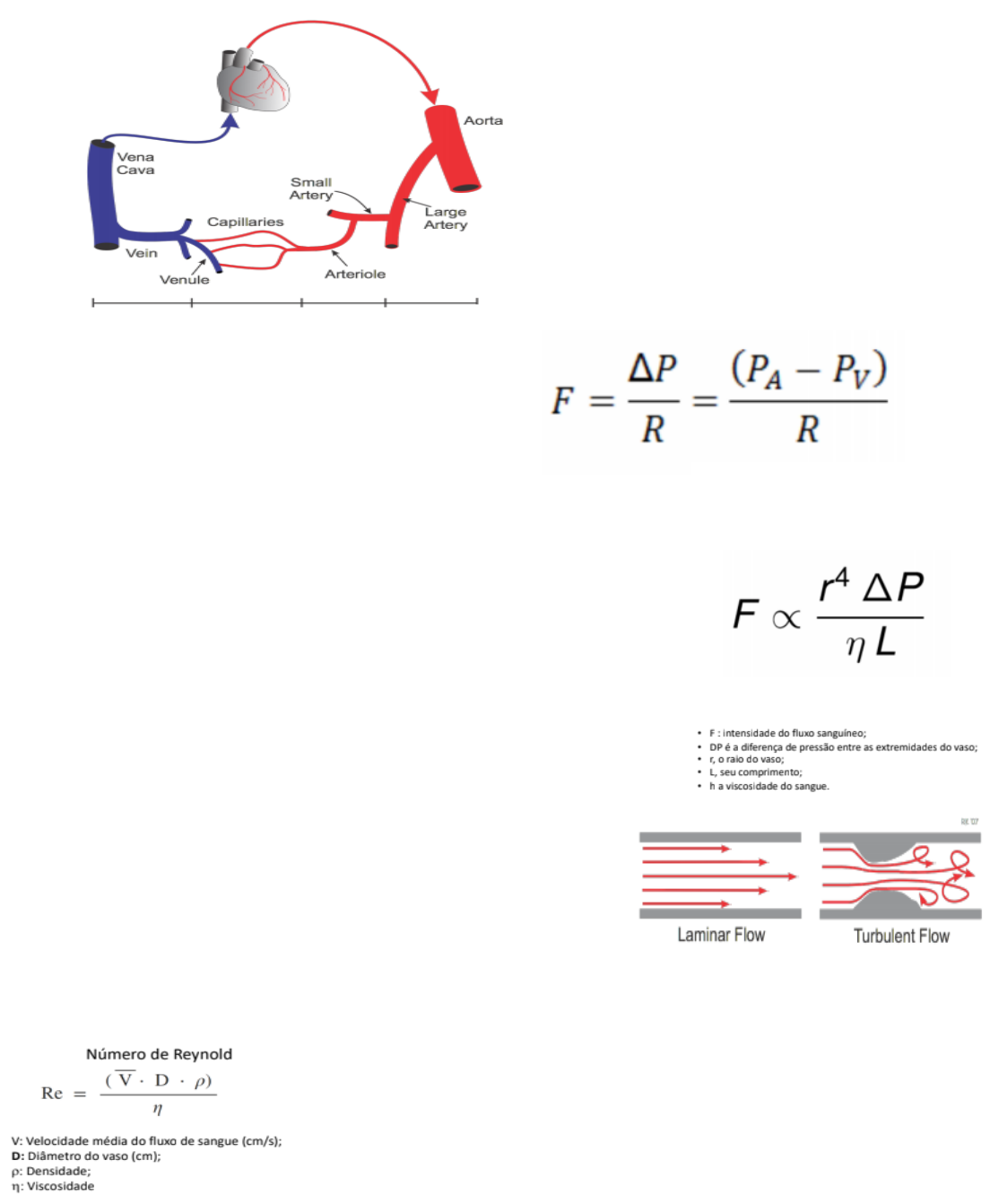 <p>Hemodinâmica</p><p>Rede vascular:</p><p>- Rede responsável pelo fluxo</p><p>sanguíneo.</p><p>- Arteríolas – são conhecidos como</p><p>vasos da resistência, pois alteram</p><p>demais a resistência.</p><p>- Veia cava – vasos da capacitância</p><p>Relação entre pressão, fluxo e</p><p>resistência:</p><p>Onde:</p><p> F = fluxo</p><p> DP = diferença de pressão (dá a direção</p><p>do fluxo)</p><p> R = resistências.</p><p>Fluxo: o fluxo sanguíneo total na circulação de adulto em</p><p>repouso é cerca de 5.000ml/min. Isso é referido como débito</p><p>cardíaco, por ser a quantidade de sangue bombeada pelo</p><p>coração para a aorta, a cada minuto.</p><p>- Quantidade de líquido por tempo, ou ar, nesse caso, sangue.</p><p>- É diretamente proporcional ao tamanho do raio, quanto</p><p>maior o raio, maior o fluxo.</p><p>- O fluxo pode ser dividido em:</p><p> Fluxo laminar: é um tipo de fluxo onde existe um</p><p>mínimo de agitações. Flui de forma estável</p><p> Fluxo turbulento: é um tipo de fluxo em que as</p><p>partículas se misturam de forma não linear.</p><p>Número de Reynold: equação que mede a tendência à ocorrência de fluxo turbulento de</p><p>modo direto proporcional à velocidade do fluxo sanguíneo. O número de Reynold é a</p><p>medida da tendência para a ocorrência de turbilhonamento</p><p>. – Quando o número de reynold aumenta acima de 200 a</p><p>400, ocorre o fluxo turbulento em alguns ramos como as</p><p>grandes artérias. Acima de 2000 ocorre em vasos retos e</p><p>lisos. Em pequenos vasos o número nunca é suficiente para</p><p>causar turbulência.</p><p>Velocidade do fluxo no sistema cardiovascular:</p><p>Quanto maior for a área, menor será a velocidade</p><p>do sangue. .</p><p>- Vaorta = 33 cm/s</p><p>- Vcapilares = 0,3 mm/s.</p><p>Pressão: representa a força exercida pelo sangue contra qualquer unidade de área da</p><p>parede vascular.</p><p>Pressão arterial média (PAM): é medida por um terço da pressão sistólica + dois terços</p><p>da pressão diastólica.</p><p>Resistência ao fluxo: é o impedimento ao fluxo</p><p>sanguíneo pelo vaso.</p><p>Onde:</p><p> N = viscosidade (maior viscosidade – maior</p><p>resistência)</p><p> L = comprimento do vaso (maior comprimento</p><p>– maior resistência)</p><p> R = raio do vaso.</p><p>Resistência da rede vascular: pode ser tanto paralelo quanto em série.</p><p>- A resistência de toda a circulação sistêmica é chamada de resistência periférica total</p><p>(RPT).</p>
