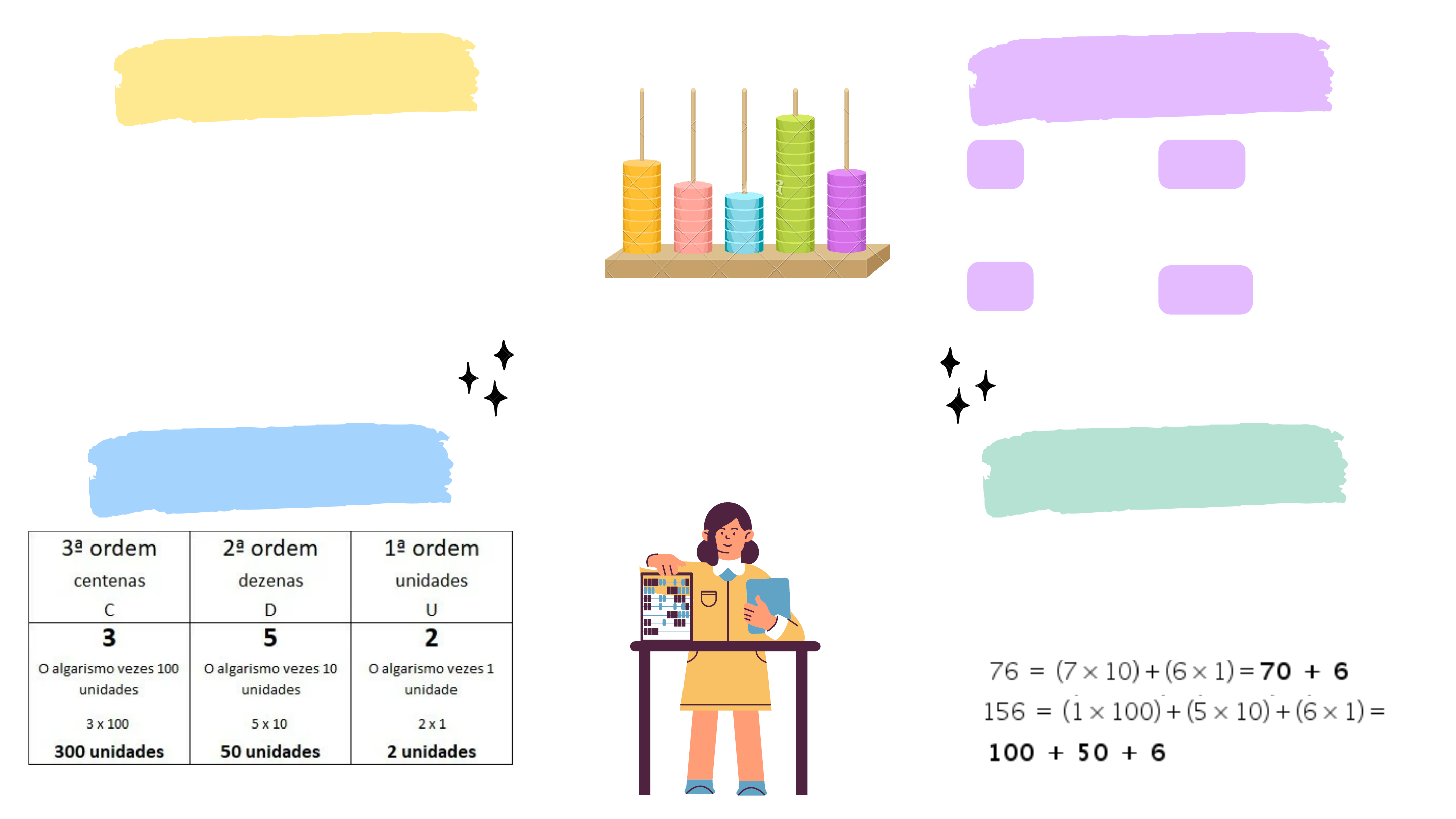 <p>multiplicamos cada algarismo pelo valor de sua</p><p>posição.</p><p>Os resultados são apresentados como uma soma.</p><p>exemplos</p><p>564</p><p>sistema de numeração como decompor</p><p>o que é?</p><p>é representar seus algarismos com o valor posicional.</p><p>cada algarismo representa uma quantidade de</p><p>unidades. Ao escrever a soma das unidades dos</p><p>algarismos, estamos decompondo o número.</p><p>Decomposição</p><p>de números</p><p>500 + 60 + 4</p><p>87 785</p><p>80 000 + 7 000 + 700 + 80 + 5</p><p>2034</p><p>2000 + 0 + 30 + 4</p><p>201 654</p><p>200 000 + 0 + 1 000 + 600 + 50 + 4</p>