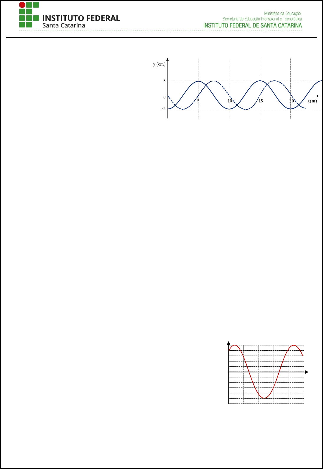 5. A equação de uma onda transversal de uma onda progressiva numa corda vibrante é dada por: y=5,0 sen (0,4πx+8,0πt), onde x e y são expressos em cm e t em s. Calcule: a) a amplitude; b) o comprimento de onda; c) a frequência; d) o módulo da velocidade de propagação da onda; e) o sentido de propagação da onda.