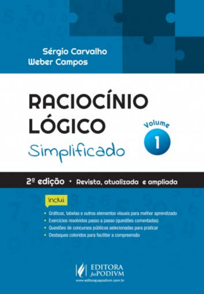 <p>"Oxalá a bondade e a fidelidade não se afastem de ti!</p><p>Ata-as ao teu pescoço, grava-as em teu coração!"</p><p>Provérbios 3,3</p><p>Sérgio Carvalho</p><p>Weber Campos</p><p>;</p><p>~ACIOCINIO</p><p>;</p><p>LOGICO</p><p>S\mpn-r~cado</p><p>2!! edição • Revisto, atualizado e ampliado</p><p>IJnclu.i I</p><p>• Gráficos, tabelas e outros elementos visuais para melhor aprendizado</p><p>• Exercícios resolvidos passo a passo (questões comentadas)</p><p>• Questões de concursos públicos selecionadas para praticar</p><p>• Destaques coloridos para facilitar a compreensão</p><p>2016</p><p>EDITORA</p><p>JusPODIVM</p><p>www.editorajuspodivm.com.br</p><p>"Oxalá a bondade e a fidelidade não se afastem de ti!</p><p>Ata-as ao teu pescoço, grava-as em teu coração!"</p><p>Provérbios 3,3</p><p>Sérgio Carvalho</p><p>Weber Campos</p><p>;</p><p>~ACIOCINIO</p><p>;</p><p>LOGICO</p><p>S\mpn-r~cado</p><p>2!! edição • Revisto, atualizado e ampliado</p><p>IJnclu.i I</p><p>• Gráficos, tabelas e outros elementos visuais para melhor aprendizado</p><p>• Exercícios resolvidos passo a passo (questões comentadas)</p><p>• Questões de concursos públicos selecionadas para praticar</p><p>• Destaques coloridos para facilitar a compreensão</p><p>2016</p><p>EDITORA</p><p>JusPODIVM</p><p>www.editorajuspodivm.com.br</p><p>I );I EDITORA f fosPODIVM</p><p>www.editorajuspodivm.com.br</p><p>Rua Mato Grosso, 175- Pituba, CEP: 41830-151 -Salvador- Bahia</p><p>Tel: (71) 3363-8617 I Fax; (71) 3363-5050</p><p>• E-mail: tale@editorajuspodivm.com.br</p><p>Copyright: Edições JusPODIVM</p><p>Conselho Editorial: Eduardo Viana Portela Neves, Dirley da Cunha Jr., Leonardo de Medeiros Garcia, Fredie</p><p>Didier Jr., José Henrique Mouta, José Marcelo Vigliar, Marcos Ehrhardt Júnior, Nestor Távora, Robério Nunes</p><p>Filho, Roberval Rocha Ferreira Filho, Rodolfo Pamplona Filho, Rodrigo Reis Mazzei e Rogério Sanches Cunha.</p><p>, J Dlagramaçio: SBNlgrl Artes e Textcjs ltda. (sbnigri@centroin.com.brr ·=:·."·"'"-··</p><p>'J Capa: Marcelo 5. Brandão (Santibl'tiitdo@gmall.com)</p><p>( ·A Editora JusPDDIVM p~ssou ~ublicar esta obra a partir da 2_;<t'edição. -</p><p>f</p><p>C328r</p><p>v.l Carvalho, Sérgio.</p><p>Raciocínio lógico simplificado, volume I Sérgio CarValho, Weber</p><p>Campos. 2. ed. rev. ompl. e atual.- Salvador: JusPODIVM, 2016.</p><p>480 p.</p><p>Bibliografia</p><p>ISBN 978-85-442-0491-7.</p><p>1. Lógico simbólico e matemófica. 2. Matemática. 3. Serviço público</p><p>Brasil- Concursos. L Campos, Weber. 11. Título. IJI. Série.</p><p>10-0616.</p><p>Todos os direitos desta edição reservados à EdiçõesJusPODIVM.</p><p>CDD: 511.3</p><p>CDU: 510.6</p><p>></p><p>!</p><p>;</p><p>É"ferminantemente proibida a reprodução total ou parcial desta obra, por qualquer meio ou processo,</p><p>sem a expressa autorização do autor e da EdiçõesJusPODIVM. A violaçao dos direitos autorais caracteriza</p><p>crime descrito na legislação em vigor. sem prejufzo das sanções civis cabíveis,</p><p>2.~ ed., 2." tir.: marJ2016; 3.d tir.: janJ2017.</p><p>Dedicatórias</p><p>À Sílvia meu amor e à Maria Óara e Ana Carolina, nossas princesinhas,</p><p>> ></p><p>que me fazem acreditar, dia após dia, que há felicidade neste mundo!</p><p>À Marilúcia, minha mãe querida, eterna professora das lições</p><p>mais belas que há nesta vidal</p><p>A Sérgio, meu pai querido, meu modelo de otimismo, fé e doação.</p><p>Sérgio Carvalho</p><p>À Regina Célia, minha amada esposa, que me faz muito feliz.</p><p>À Beatriz, minha filha adorável, maior alegria da minha vida.</p><p>Aos meus pais, Campos e Terezinha, pela dedicação</p><p>na criação dos filhos e pela educação cristã.</p><p>Às minhas irmãs, Mary Anne, Magda e Mirislãndia, e ao meu</p><p>irmão Railson, pelo carinho e amizade.</p><p>Weber Campos</p><p>I );I EDITORA f fosPODIVM</p><p>www.editorajuspodivm.com.br</p><p>Rua Mato Grosso, 175- Pituba, CEP: 41830-151 -Salvador- Bahia</p><p>Tel: (71) 3363-8617 I Fax; (71) 3363-5050</p><p>• E-mail: tale@editorajuspodivm.com.br</p><p>Copyright: Edições JusPODIVM</p><p>Conselho Editorial: Eduardo Viana Portela Neves, Dirley da Cunha Jr., Leonardo de Medeiros Garcia, Fredie</p><p>Didier Jr., José Henrique Mouta, José Marcelo Vigliar, Marcos Ehrhardt Júnior, Nestor Távora, Robério Nunes</p><p>Filho, Roberval Rocha Ferreira Filho, Rodolfo Pamplona Filho, Rodrigo Reis Mazzei e Rogério Sanches Cunha.</p><p>, J Dlagramaçio: SBNlgrl Artes e Textcjs ltda. (sbnigri@centroin.com.brr ·=:·."·"'"-··</p><p>'J Capa: Marcelo 5. Brandão (Santibl'tiitdo@gmall.com)</p><p>( ·A Editora JusPDDIVM p~ssou ~ublicar esta obra a partir da 2_;<t'edição. -</p><p>f</p><p>C328r</p><p>v.l Carvalho, Sérgio.</p><p>Raciocínio lógico simplificado, volume I Sérgio CarValho, Weber</p><p>Campos. 2. ed. rev. ompl. e atual.- Salvador: JusPODIVM, 2016.</p><p>480 p.</p><p>Bibliografia</p><p>ISBN 978-85-442-0491-7.</p><p>1. Lógico simbólico e matemófica. 2. Matemática. 3. Serviço público</p><p>Brasil- Concursos. L Campos, Weber. 11. Título. IJI. Série.</p><p>10-0616.</p><p>Todos os direitos desta edição reservados à EdiçõesJusPODIVM.</p><p>CDD: 511.3</p><p>CDU: 510.6</p><p>></p><p>!</p><p>;</p><p>É"ferminantemente proibida a reprodução total ou parcial desta obra, por qualquer meio ou processo,</p><p>sem a expressa autorização do autor e da EdiçõesJusPODIVM. A violaçao dos direitos autorais caracteriza</p><p>crime descrito na legislação em vigor. sem prejufzo das sanções civis cabíveis,</p><p>2.~ ed., 2." tir.: marJ2016; 3.d tir.: janJ2017.</p><p>Dedicatórias</p><p>À Sílvia meu amor e à Maria Óara e Ana Carolina, nossas princesinhas,</p><p>> ></p><p>que me fazem acreditar, dia após dia, que há felicidade neste mundo!</p><p>À Marilúcia, minha mãe querida, eterna professora das lições</p><p>mais belas que há nesta vidal</p><p>A Sérgio, meu pai quer