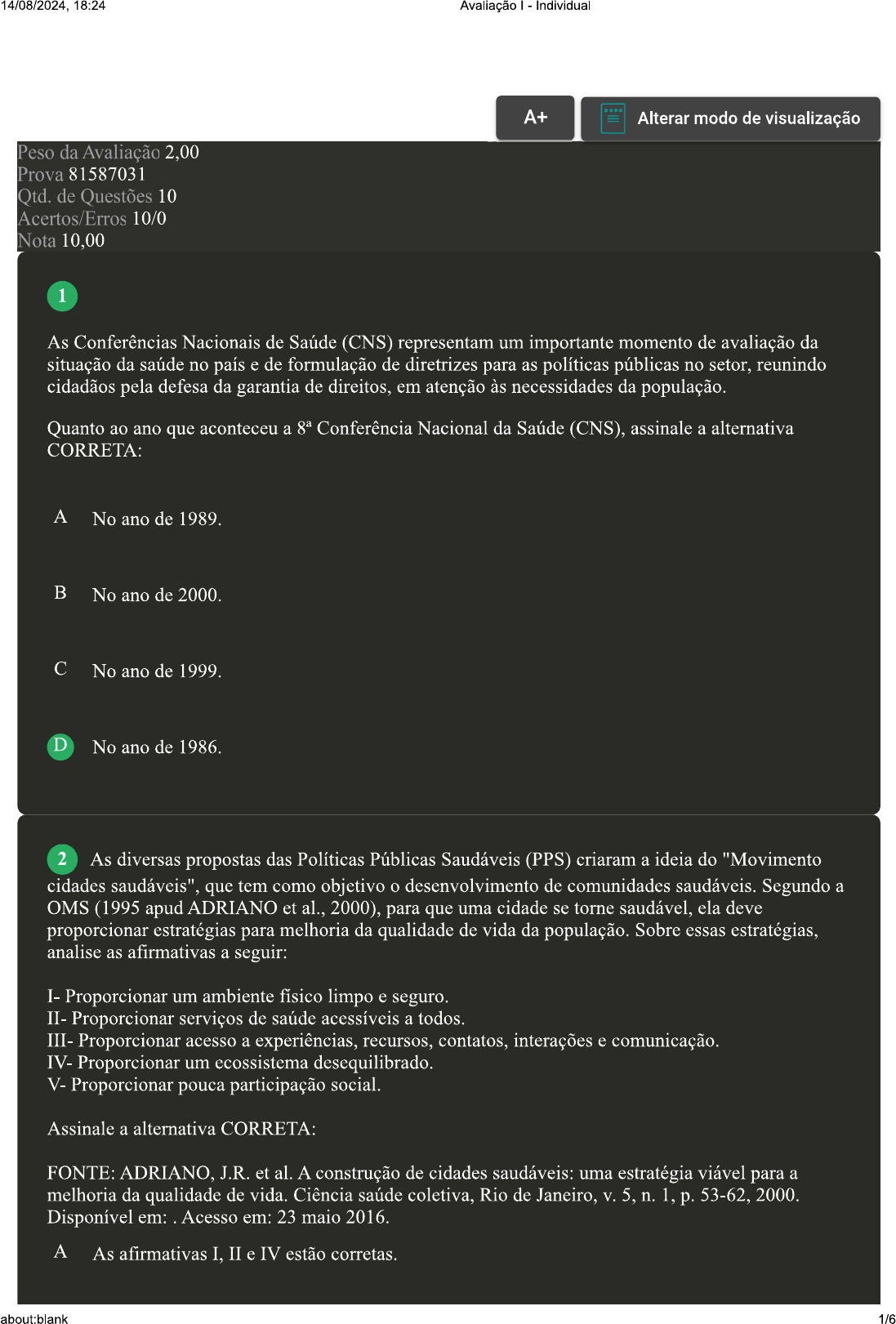 <p>14/08/2024, 18:24 Avaliação - Individual A+ Alterar modo de visualização Peso da Avaliação 2,00 Prova 81587031 Qtd. de Questões 10 Acertos/Erros 10/0 Nota 10,00 1 As Conferências Nacionais de Saúde (CNS) representam um importante momento de avaliação da situação da saúde no país e de formulação de diretrizes para as políticas públicas no setor, reunindo cidadãos pela defesa da garantia de direitos, em atenção às necessidades da população. Quanto ao ano que aconteceu a Conferência Nacional da Saúde (CNS), assinale a alternativa CORRETA: A No ano de 1989. B No ano de 2000. C No ano de 1999. D No ano de 1986. 2 As diversas propostas das Políticas Públicas Saudáveis (PPS) criaram a ideia do "Movimento cidades saudáveis", que tem como objetivo desenvolvimento de comunidades saudáveis. Segundo a OMS (1995 apud ADRIANO et al., 2000), para que uma cidade se torne saudável, ela deve proporcionar estratégias para melhoria da qualidade de vida da população. Sobre essas estratégias, analise as afirmativas a seguir: I- Proporcionar um ambiente físico limpo e seguro. II- Proporcionar serviços de saúde acessíveis a todos. III- Proporcionar acesso a experiências, recursos, contatos, interações e comunicação. IV- Proporcionar um ecossistema desequilibrado. V- Proporcionar pouca participação social. Assinale a alternativa CORRETA: FONTE: ADRIANO, J.R. et al. A construção de cidades saudáveis: uma estratégia viável para a melhoria da qualidade de vida. Ciência saúde coletiva, Rio de Janeiro, V. 5, n. 1, p. 53-62, Disponível em: Acesso em: 23 maio 2016. A As afirmativas I, II e IV estão corretas. about:blank 1/6</p><p>18:24 Avaliação Individual B As afirmativas II e V estão corretas. C As afirmativas I, III e V estão corretas. D As afirmativas I. II e III estão corretas. 3 A Conferência Nacional da Saúde (CNS) firmou-se um novo conceito que traduz mudanças consideráveis na saúde e ficou estabelecido que a Saúde é: Assinale a alternativa CORRETA: A Responsabilidade exclusiva dos médicos. B Não estar doente. C Direito dos cidadãos e dever do Estado. D Responsabilidade exclusiva do indivíduo. 4 Ao conjunto articulado e contínuo das ações e serviços preventivos e curativos, individuais e coletivos, exigidos em todos os níveis de complexidade do sistema, podemos chamar de: Assinale a alternativa CORRETA: A Integralidade da Assistência. B Integralidade da Sociedade. C Integralização Universal. D Sustentabilidade da Assistência. about:blank 2/6</p><p>14/08/2024. 18:24 Avaliação Individual 5 Referente a Saúde Coletiva. Classifique V para as sentenças verdadeiras e F para as falsas: ( ) Atua em três dimensões: Planejamento de gestões política, epidemiologia social e ciências de forma ( ) É assistencial, curativa. ( ) Foco na diversidade e especificidade dos grupos populacionais. ( ) É planejada de acordo com as necessidades de cada região. Assinale a alternativa que apresenta a sequência CORRETA: A B F-F-V-V C D 6 A ação intersetorial se efetiva nas ações coletivas e se dá como um processo, já que envolve a articulação de distintos setores sociais, possibilitando a descoberta de caminhos para a ação e assim possui diversos eixos de atuação. Com relação aos eixos de atuação que compõem a integralidade e suas classifique V para as sentenças verdadeiras e F para as falsas: ( ) Fomenta estabelecimento de políticas públicas integradas em favor da qualidade de vida. ( ) Não incentiva a participação social no processo de decisão e gestão das políticas públicas em saúde, pois isso é competência do governo. ( ) Não tem a missão de monitorar as políticas públicas ligadas aos diversos setores que causem impacto na saúde dos sujeitos e coletivos. ( ) Estimula, fortalece e subsidia a criação de redes que levem os indivíduos a ter autonomia individual, fragmentado dos aspectos sociais. Assinale a alternativa que apresenta a sequência CORRETA: A V F F - F. B about:blank 3/6</p><p>14/08/2024, 18:24 Avaliação - Individual C D 7 A principal diferença encontrada entre prevenção e promoção está no olhar sobre conceito de saúde, na prevenção a saúde é vista simplesmente como ausência de doenças, enquanto na promoção a saúde é encarada como um conceito positivo e multidimensional resultando desta maneira em um modelo participativo de saúde na promoção em oposição ao modelo médico de intervenção. Sobre diferenças entre prevenção de doenças e promoção da saúde, assinale a alternativa CORRETA: A A promoção da saúde é direcionada principalmente à grupos de alto risco da população enquanto a prevenção de doenças envolve toda a população no seu ambiente total. B A promoção da saúde se caracteriza por intervenções que objetivam a eliminação permanente, ou pelo menos, duradoura, da doença porque busca atingir suas causas básicas. C Na prevenção em saúde são realizadas ações preventivas cujo objetivo é aumentar a incidência e prevalência das D A prevenção de doenças constitui-se integração entre os diversos setores do governo municipal, estadual e federal. 8 Durante muito tempo, a saúde foi entendida simplesmente como estado de ausência de doença. Considerada insatisfatória, esta definição de saúde foi substituída por outra, que engloba bem-estar físico, mental e social. De acorodo com os eixos de atuação que compõem a educação em saúde, assinale a alternativa CORRETA: A Diminuir os saberes e as práticas desenvolvidos pelas comunidades para melhoria da qualidade de vida. B Investir em educação nas redes privadas. about:blank 4/6</p><p>14/08/2024, 18:24 Avaliação Individual C Pesquisar as ações da promoção da saúde de modo a construir estratégias menos eficazes. Investir em metodologias de educação a distância voltadas para a formação dos profissionais de saúde dentro da perspectiva promocional de modo a facilitar
