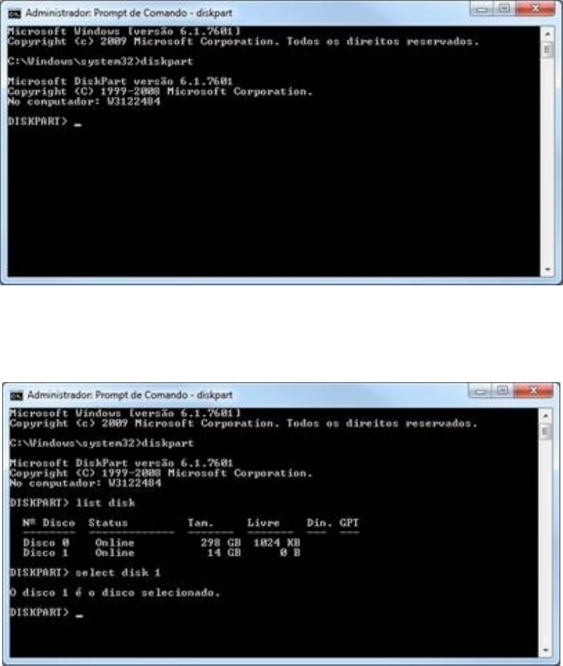 <p>Formatar pendrive</p><p>Com a aplicação do SP1, a criação do pendrive stand-alone através da console passou a funcionar, como na versão 2007. Mas a ferramenta de formatação de pendrive não está funcionando corretamente. Ao criar um pendrive de boot pela rede, ou stand-alone, a console informa que o processo foi concluído com êxito, mas ao usar o pendrive para iniciar o equipamento, a partição de boot do pendrive não é encontrada e o equipamento inicia normalmente.</p><p>Este problema foi identificado ao utilizar um pendrive novo, ou seja, um pendrive que nunca foi formatado pelo SCCM 2007. Para corrigir este problema, é necessário formata-lo utilizando o DISKPART .</p><p>Execute o prompt de comando como administrador, digite diskpart e pressione enter.</p><p>Digite list disk e pressione enter. Em seguida, escreva select disk seguido do número do disco que será formatado e pressione enter. ATENÇÃO! Cuidado ao selecionar o disco!</p><p>Digite clean e pressione enter. Em seguida digite create partition primary e pressione enter. Depois digite list partition e pressione enter.</p><p>Selecione a partição escrevendo select partition 1 e pressione enter. Em seguida digite format fs=fat32 quick e pressione enter. Após alguns segundos a tela seguinte será exibida.</p><p>Digite active e pressione enter. Em seguida escreva exit e pressione enter. Digite exit novamente e pressione enter para fechar o prompt de comando. O pendrive foi formatado e está pronto para uso.</p><p>image4.jpeg</p><p>image5.jpeg</p><p>image1.jpeg</p><p>image2.jpeg</p><p>image3.jpeg</p>