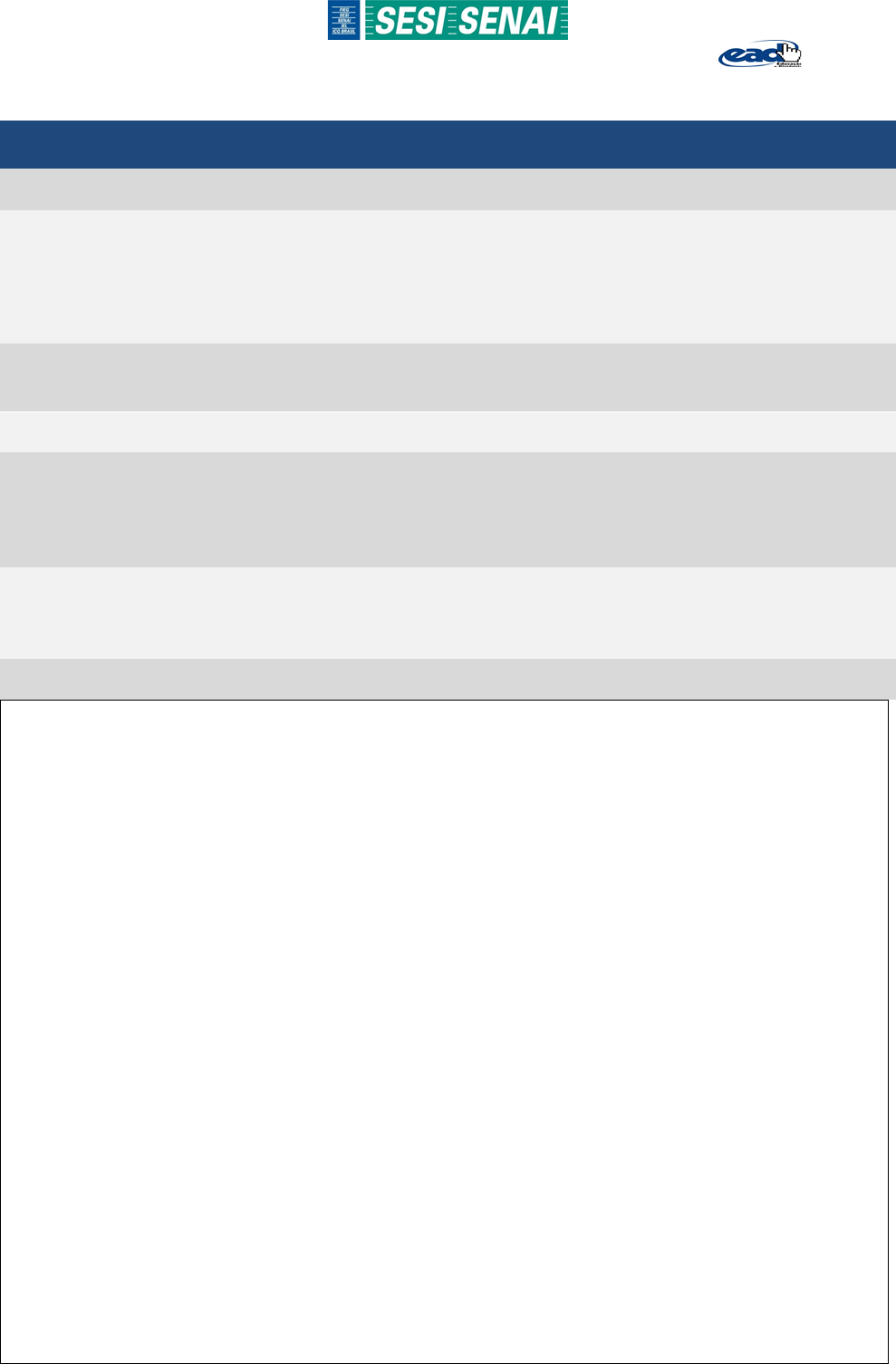 <p>Núcleo Integrado SESI/SENAI de Educação a Distância – NiEAD</p><p>PLANO DA SITUAÇÃO DE APRENDIZAGEM (SAP) 02</p><p>Curso: Técnico em Segurança do Trabalho Modalidade: Educação a Distância</p><p>Unidade Curricular 7: Planejamento e Execução de Ações Educativas</p><p>Módulos:</p><p>( ) Básico ( ) Específico I ( X ) Específico II ( ) Específico III ( ) Específico IV</p><p>Estratégia da situação de aprendizagem:</p><p>(X) Situação - Problema ( ) Projeto ( ) Pesquisa ( ) Estudo de Caso</p><p>Título da situação de aprendizagem: Situações de risco! O que fazer? (parte 2).</p><p>Capacidades Técnicas: Identificar os programas de treinamento estabelecidos pela empresa;</p><p>estabelecer treinamentos e metodologias apropriadas ao perfil educacional dos trabalhadores da</p><p>empresa; correlacionar os itens exigidos na legislação, normas e notas técnicas com as</p><p>capacitações a serem planejadas; reconhecer legislação, normas e notas técnicas aplicáveis ao</p><p>ramo de atuação e ou atividade do local.</p><p>Objetivo: Esta situação de aprendizagem foi construída para compreender sobre registros das</p><p>ações educativas, também realizar uma prática do Diálogo Diário de Segurança. Ainda conhecer</p><p>várias Normas Regulamentadores, especificamente, aquelas que apresentam os conteúdos</p><p>programáticos para a capacitação e elaborar um certificado.</p><p>Descritivo da atividade desafiadora, contextualizada, com suas especificações técnicas:</p><p>Prezado aluno!</p><p>Você é o Técnico de Segurança do Trabalho na empresa Alimentos Alu e tem conhecimento</p><p>de todas as atividades a serem desenvolvidas pela área de saúde e segurança do trabalho</p><p>precisam ser devidamente registradas, monitoradas e arquivadas, como também, precisam</p><p>ser coerentes e de acordo com os objetivos traçados. Na SAP 1 foi elaborado o</p><p>planejamento para as ações educativas, agora é importante que você estabeleça de que</p><p>forma conduzirá a ação educativa planejada.</p><p>A partir disso, você elaborará um registro de capacitações, em seguida, o certificado de</p><p>participação e por fim desenvolverá materiais de ações educativas diferentes. Isso será</p><p>realizado nas etapas 1, 2 e 3.</p><p>Bons estudos!</p><p>Etapa 01</p><p>Elaborar uma planilha para registros de capacitações, contendo as seguintes informações:</p><p>as ações tomadas, quando foram desenvolvidas, quem participou, qual foi a duração e</p><p>quem foram os instrutores. Para isso, poderá utilizar o modelo de Planilha de Registro das</p><p>Capacitações abaixo (Figura 1) ou criar esse registro desde que contenha as informações</p><p>solicitadas.</p><p>Além da ação educativa planejada na SAP 1, pesquise, pense e reflita em temas que</p><p>poderia realizar um Diálogo Diário de Segurança (DDS). Defina um ou dois temas,</p><p>Núcleo Integrado SESI/SENAI de Educação a Distância – NiEAD</p><p>organize e implemente durante o encontro presencial. Após isso, faça o registro na planilha</p><p>de capacitações.</p><p>Esta etapa será realizada em grupo e no momento presencial.</p><p>Etapa 02</p><p>Após ter realizado o registro de capacitações, você desenvolverá o seu próprio material</p><p>usando a sua criatividade, por exemplo: cartilha, cartaz e/ou folheto, os quais você poderá</p><p>utilizar na realização das três ações educativas diferentes. Em seguida, sortear grupos para</p><p>realizar apresentações.</p><p>Esta etapa será realizada em grupo e no momento presencial.</p><p>Etapa 03</p><p>Quando é implementado as capacitações, deve-se elaborar o certificado das capacitações.</p><p>Nessa etapa você elaborará dois certificados, podendo ser das seguintes Normas</p><p>Regulamentadoras (NRs) : NR 05 (item 5.7), NR 10 (anexo III), NR 11, NR 12, NR 13, NR</p><p>18 (Anexo I e item 18.14), NR 20, NR 22, NR 29 (item 29.27), NR 30 (item 30.17), NR 31</p><p>(item 31.2.6), NR 33 (item 33.3.5), NR 34 (item 34.3), NR 35 (item 35.3), NR 36 (item 36.16),</p><p>NR 37 (item 37.9).</p><p>Para isso, você deverá escolher duas NRs para elaborar os certificados. Você poderá</p><p>pesquisar na internet modelos de certificados, lembrando-se que deve conter todas as</p><p>informações no certificado relacionadas as capacitações/treinamentos que constam na NR</p><p>escolhida por você.</p><p>Ainda deverá acessar o site: https://www.gov.br/trabalho-e-previdencia/pt-</p><p>br/composicao/orgaos-especificos/secretaria-de-trabalho/inspecao/seguranca-e-saude-no-</p><p>trabalho/ctpp-nrs/normas-regulamentadoras-nrs para acessar as Normas</p><p>Regulamentadoras citadas anteriormente e verificar a parte referente de capacitação,</p><p>treinamento. Você procurará informações que devem ser inclusos no certificado.</p><p>Após a elaboração do certificado, faça um breve resumo de até 10 linhas explicando sobre</p><p>o que você aprendeu sobre esse assunto.</p><p>Esta etapa será realizada e postada no AVA.</p><p>Bons estudos!</p><p>https://www.gov.br/trabalho-e-previdencia/pt-br/composicao/orgaos-especificos/secretaria-de-trabalho/inspecao/seguranca-e-saude-no-trabalho/ctpp-nrs/normas-regulamentadoras-nrs</p><p>https://www.gov.br/trabalho-e-previdencia/pt-br/composicao/orgaos-especificos/secretaria-de-trabalho/inspecao/seguranca-e-saude-no-trabalho/ctpp-nrs/normas-regulamentadoras-nrs</p><p>https://www.gov.br/trabalho-e-previdencia/pt-br/composicao/orgaos-especificos/secretaria-de-trabalho/inspecao/seguranca-e-saude-no-trabalho/ctpp-nrs/normas-regulamentadoras-nrs</p>