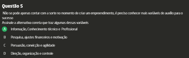 <p>Questão 5 Não se pode apenas contar com a sorte no momento de criar um empreendimento, é preciso conhecer mais variáveis de auxílio para sucesso Assinale a alternativa correta que traz algumas dessas variáveis A Informação, Conhecimento técnico e Profissional B Pesquisa, ajustes financeiros e motivação Persuasão, convicção e agilidade D Direção, organização e controle</p>