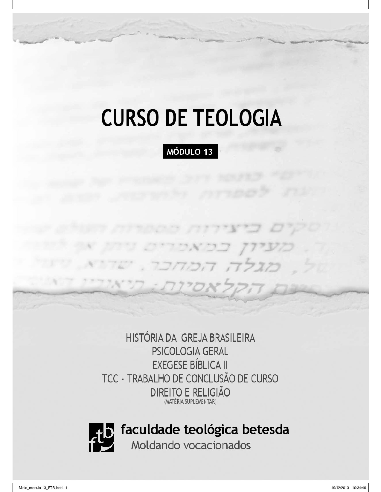 <p>CURSO DE TEOLOGIA MÓDULO 13 HISTÓRIA DA IGREJA BRASILEIRA PSICOLOGIA GERAL EXEGESE BÍBLICA II TCC - - TRABALHO DE CONCLUSÃO DE CURSO DIREITO E RELIGIÃO (MATÉRIA SUPLEMENTAR) faculdade betesda Moldando vocacionados</p><p>Copyright © 2007 by Editora Betesda faculdade teológica betesda Moldando vocacionados Presidente: Sezar Cavalcante Diretor Danilo Moraes Diretor Pedagógico: Vanessa Cavalcante Secretaria Executiva: Proietti Corpo docente SEZAR CAVALCANTE Th.B Em Teologia DANILO MORAES Mestre em teologia, concentração em Antigo Testamento MARCIO FALCÃO Th.B em Teologia e Bacharel em Direito ZEEV HASHALOM Mestrado Em Letras, Grego e Hebraico RICARDO MAIOLINI Th.B Em Teologia, Especialista em Mística FRANCISCA DA SILVA Th.B Em Teologia ADRIANO LIMA Th.B em Teologia IZAIAS COUTINHO Th.B em Teologia ALESSANDRO VIEIRA Th.B em Teologia Professores convidados LUIZ Ph.D em Estudos Interculturais e Pós-doutor em Teologia Prática e Práxis Religiosa GABRIELE Ph.D em Filosofia e Pós-doutora em História das Mentalidades MARIA LEONARDO, Ph.D em Teologia e Antropologia Cultural BÁRBARA BURNS, Doutora em Missiologia CÉSAR Mestre em Teologia Prática e Ph.D em Eclesiologia MÁRCIO REDONDO, Ph.D em História e Doutor em Teologia Todas as referências bíblicas foram extraídas da Versão Almeida Revista e Atualizada, Edição de 1995 da Sociedade Bíblica do Proibida a reprodução por quaisquer meios, salvo em breves citações, com indicação da fonte. Coordenação editorial Danilo Moraes Projeto gráfico de capa e miolo Valdinei Gomes Revisão Danilo Moraes Todos os direitos desta obra em língua portuguesa reservados por: editora betesda Rua Azir Antonio Salto, 92- Jd. São Paulo São Paulo/SP CEP: 02046-010 Fone: (11) www.faculdadebetesda.com.br Miolo_modulo 13_FTB.indd 2 19/12/2013 10:34:46</p><p>APRESENTAÇÃO E INSTRUÇÕES Manual simplificado de uso do material didático FTB e prossigamos em conhecer ao Senhor" (Oseias 6.3). conhecimento sobre Deus não é apenas uma possibilidade, mas também um direito de todos os homens. A Bíblia Sagrada nos ensina que Deus, graciosamente, revela-se ao homem, convidando a todos para experimenta- rem sua bendita graça. É com essa visão, e sob o lema "Moldando que a FTB FACULDADE TEOLÓGICA BETESDA, uma instituição interdenominacional filiada às principais entidades da classe, oferece todos os seus cursos. Para que o seu aproveitamento como estudante FTB seja o melhor possível, e para que nós consigamos dar a você o suporte e apoio em sua jornada de estudos, é necessário que você SIGA EXATAMENTE as orientações que daremos a seguir, pois desta maneira você terá uma maior fixação do conteúdo e nos ajudará a atendê-lo sempre da melhor maneira MODALIDADES DE ENSINO Ensino à Distância: Frequentados por mais de 12 mil alunos, nossos cursos EAD têm sido recomendados por diversas lideranças e denominações evangélicas. Quando se trata de ensino à distância, a FTB é a mais completa do Brasil, oferecendo um suporte acadêmico inigualável. Além disso, todo o material didático necessário é pró- prio e já se encontra incluído no preço final. Ensino Presencial: AFTB mantém várias UNIDADES na Capital e na Grande São Paulo ministrando teologia do nível Básico até a com aulas semanais em sala de aula, inclusive aos sábados, e com profes- sores altamente qualificados, todos com formação superior e/ou pós-graduações. Ensino Semipresencial: Completando nossa atuação educacional, ainda oferecemos essa modalidade que cha- mamos de NÚCLEOS Numa parceria com a igreja local, instalamos uma sala de aula nas suas próprias dependências, onde uma nova turma de alunos estudará com a ajuda da FTB e do ministério local. Encontros presenciais: Com o objetivo de criar uma interação entre alunos de todas as modalidades, profes- sores e a diretoria, a FTB promove uma aula especial (INTENSIVÃO TEOLÓGICO) por mês, com renomados teólogos brasileiros e internacionais. Acesse nosso portal para conhecer a agenda e o local dessas aulas. REGRAS GERAIS Material didático: Ao receber seu material, confira-o. Se tiver alguma dúvida, entre em contato com o nosso SAA: Prazo de estudo: aluno deve estudar cada módulo por um tempo mínimo de 2 ME SES e no máxi- mo de 4 MESES, por isso planeje seus estudos dentro desse prazo, evitando transtornos administra- tivos com a escola. Plantão teológico: Alunos devidamente matriculados e em dia com seus pagamentos têm direito ao PLANTÃO 13_FTB.indd 3 19/12/2013 10:34:46</p><p>que funciona de segunda a sexta-feira no horário comercial. Ligue: (11) 2976-0899. Diplomação: Em todos os seus cursos a FTB fornece gratuitamente aos alunos aprovados Diploma e/ou Certificado, em cerimônias de formaturas programadas ao longo do ano letivo. Portal do Aluno: Por meio de nosso site www.faculdadebetesda.com.br o aluno dispõe de rico material acadêmico e serviços exclusivos, tais como: rádio on-line; bate-papo com convidados; estudos bíblicos; reportagens, etc. Visite-o ainda hoje! SOBRE os MÓDULOS O Curso Básico possui 05 MÓDULOS, o Curso Médio 09 MÓDULOS e o Curso Bacharel 13 Cada módulo corresponde a um livro de alta qualidade gráfica e de conteúdo, com 05 matérias cada um, sendo quatro tradicionais e uma especial, voltada à prática da teologia e da vida cristã, totalizando 65 ma- térias (ver grade na p. 6 e 7). Ao longo de cada uma das matérias, em todos os módulos, há vários exercícios que chamamos de Verifi- cação de Aprendizagem, que são questões que o ajudarão a fixar melhor o capítulo Você deve copiar e responder essas questões em um caderno à parte e depois conferir no capítulo para certificar se estão corretas ou não. No final de cada matéria há uma Avaliação com 10 questões. Você só deve fazer essa avaliação depois que terminar de estudar todos os capítulos da matéria. A última matéria, identificada como Matéria Suplemen- tar, con