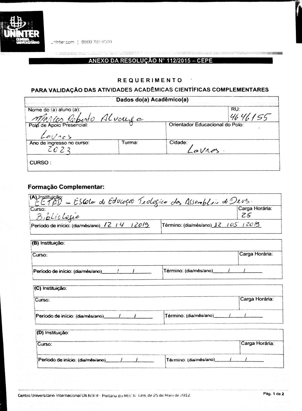 <p>UNINTER 0800 702 0500 ANEXO DA RESOLUÇÃO 112/2015 - CEPE REQUERIMENTO PARA VALIDAÇÃO DAS ATIVIDADES ACADÊMICAS CIENTÍFICAS COMPLEMENTARES Dados do(a) Acadêmico(a) Nome do (a) aluno (a): RU: Marcos Roberto 4646155 Polo de Apoio Presencial: Orientador Educacional do Polo: Ano de ingresso no curso: Turma: Cidade: 2023 CURSO : Formação Complementar: (A) Unstituição: - Teologico Assemblein Deus Curso: Carga Horária: Bibliologic 25 Período de início: 1214 12019 Término: (dia/mês/ano) (B) Instituição: Curso: Carga Horária: Período de / Término: (dia/mês/ano) / / Instituição: Curso: Carga Horária: Período de início: (dia/mês/ano) / / Término: (dia/mês/ano) / / (D) Instituição: Curso: Carga Horária: Período de início: / / Término: (dia/mês/ano) / / Centro UN Portaria do MECN de 25 de Main de Pág. 1 de 2</p><p>UNINTER CENTRO uninter.com 0800 702 0500 (E) Instituição: Carga Horária: Curso: Período de início: (dia/mês/ano) / / Término: (dia/mês/ano) / / (F) Instituição: Carga Horária: Curso: Período de início: (dia/mês/ano) / / Término: (dia/mês/ano) / / (G) Instituição: Carga Horária: Curso: Período de início: (dia/mês/ano) / / Término: (dia/mês/ano) / / (H) Instituição: Carga Horária: Curso: Período de início: (dia/mês/ano) / / Término: (dia/mês/ano) / / Documentação apresentada: ( Requerimento preenchido; ( ) Documentos comprobatórios do curso Local: data: Nome: CPF: Assinatura do aluno: Pág. 2 de 2 Centro Universitário Internacional UN NTER Portaria do de 25 de Main de 2012.</p>