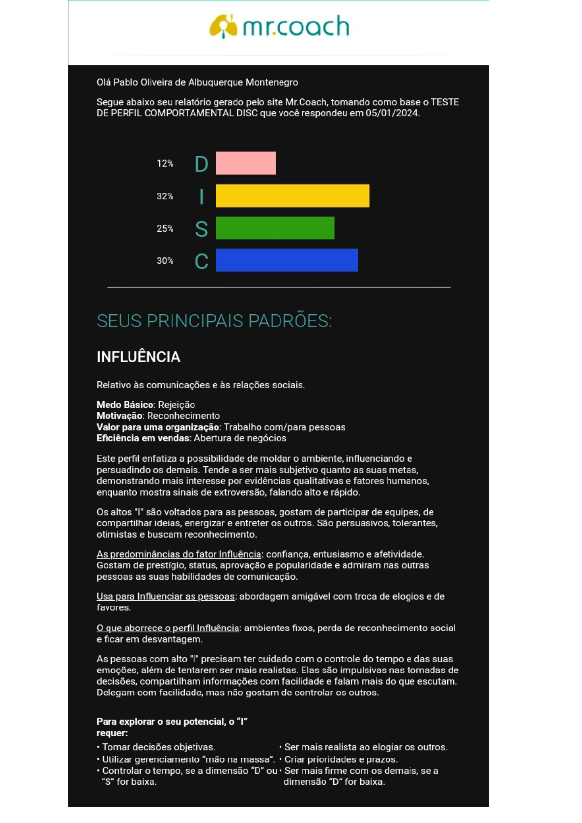 <p>mr.coach Olá Pablo Oliveira de Albuquerque Montenegro Segue abaixo seu relatório gerado pelo site Mr.Coach, tomando como base TESTE DE PERFIL COMPORTAMENTAL DISC que você respondeu em 05/01/2024. 12% D 32% 25% S 30% C SEUS PRINCIPAIS PADRÕES: INFLUÊNCIA Relativo às comunicações e às relações sociais. Medo Rejeição Motivação: Reconhecimento Valor para uma organização: Trabalho com/para pessoas Eficiência em vendas: Abertura de negócios Este perfil enfatiza a possibilidade de moldar ambiente, influenciando e persuadindo os demais. Tende a ser mais subjetivo quanto as suas metas, demonstrando mais interesse por evidências qualitativas e fatores humanos, enquanto mostra sinais de extroversão, falando alto e rápido. Os altos "I" são voltados para as pessoas, gostam de participar de equipes, de compartilhar ideias, energizar e entreter os outros. São persuasivos, tolerantes, otimistas e buscam reconhecimento. As predominâncias do fator Influência: confiança, entusiasmo e afetividade. Gostam de prestígio, status, aprovação e popularidade e admiram nas outras pessoas as suas habilidades de comunicação. Usa para Influenciar as pessoas: abordagem amigável com troca de elogios e de favores. que aborrece perfil Influência: ambientes fixos, perda de reconhecimento social e ficar em desvantagem. As pessoas com alto "I" precisam ter cuidado com controle do tempo e das suas emoções, além de tentarem ser mais Elas são impulsivas nas tomadas de decisões, compartilham informações com facilidade e falam mais do que escutam. Delegam com facilidade, mas não gostam de controlar os outros. Para explorar seu potencial, "I" requer: Tomar decisões objetivas. Ser mais realista ao elogiar os outros. Utilizar gerenciamento "mão na massa". Criar prioridades e prazos. Controlar tempo, se a dimensão "D" ou Ser mais firme com os demais, se a "S" for baixa. dimensão "D" for baixa.</p><p>CONFORMIDADE Relativo a estrutura e organização. Medo Básico: Conflitos Motivação: Regras e procedimentos Valor para uma organização: Áreas técnicas e de qualidade Eficácia em vendas: Contratos e aspectos técnicos da venda Este perfil enfatiza a possibilidade de trabalhar conscientemente dentro das circunstâncias existentes para assegurar qualidade e precisão. Tende a ser mais objetivo quanto às suas metas, demonstrando mais interesse por evidências quantitativas e raciocínio lógico, enquanto mostra sinais de introversão, falando baixo e pausadamente. Os altos "C" são defensores da qualidade e gostam de pensar à frente. Possuem abordagens mais sistemáticas, conferindo e reconferindo dados para maior precisão. São detalhistas, cuidadosos, interessados e corretos. As predominâncias do fator Conformidade: mostram-se na defensiva, evitam confronto e costumam ser muito críticas. Elas gostam de controle e de apresentar resultados exatos e sem erros. admiram nas outras pessoas o raciocínio lógico e a atenção aos detalhes. Usa para Influenciar as pessoas: argumentos lógicos e estabelecimento do ritmo de trabalho. que aborrece o perfil Conformidade: perder numa discussão. As pessoas com alto "C" são lentas na tomada de decisões porque precisam de muitas evidências e não querem correr riscos. São pessoas fechadas e desconfiadas. Observam à distância na tentativa de preservar seu conhecimento. Falam pouco e não se envolvem em conversar informais. Relutam em delegar e precisam sempre da aprovação dos outros. Para explorar o seu potencial, o "C" requer: Conhecer exatamente suas atribuições. Receber feedback de desempenho. Conhecer as metas de desempenho. Desenvolver tolerâncias aos conflitos. Programar avaliações de desempenho. Respeitar os valores das outras pessoas Planejar cuidadosamente. e que elas realizam.</p>