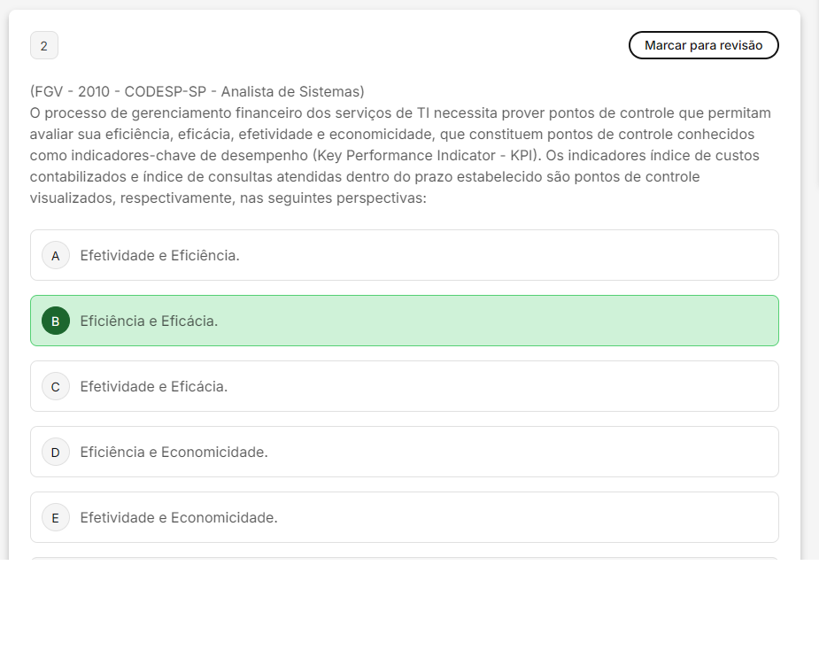 (FGV - 2010 - CODESP-SP - Analista de Sistemas) O processo de gerenciamento financeiro dos serviços de TI necessita prover pontos de controle que permitam avaliar sua eficiência, eficácia, efetividade