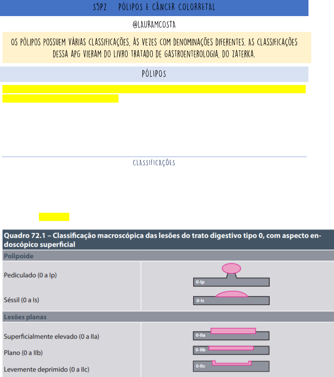 <p>–</p><p>Define-se como pólipo do aparelho digestivo: “Toda estrutura com origem na sua parede, que se projeta em</p><p>direção a sua luz, de forma circunscrita.” Em boa parte do reto, não se tem a serosa, restando apenas três</p><p>camadas de onde se originam verdadeiramente os pólipos: mucosa, submucosa e muscular própria.</p><p>O que confere maior importância clínica a essas estruturas é que algumas delas são neoplásicas e, portanto,</p><p>podem se transformar em malignas, e sua remoção, endoscópica ou cirúrgica, pode prevenir ou tratar esta</p><p>transformação.</p><p>A classificação dos pólipos colorretais pode ser feita de várias formas, observando-se algumas de suas</p><p>características, como aspecto morfológico (e macroscópico), abertura das glândulas de sua superfície, origem</p><p>histológica e, por fim, seu tamanho.</p><p>Em relação à morfologia, os pólipos passaram a ser classificados conforme a tabela:</p><p>Classificação segundo as aberturas das criptas da superfície mucosa do pólipo:</p><p>Em relação à natureza histológica, classificam-se os pólipos em epiteliais e não epiteliais. Os pólipos epiteliais</p><p>são subdivididos em dois grupos:</p><p>Os adenomas são os mais frequentes e de maior relevância clínica. São, na maior parte das vezes, os</p><p>precursores do adenocarcinoma, que é o câncer mais comum do cólon e reto (> 90% dos tumores malignos</p><p>desses segmentos). Quando removidos, propicia-se uma queda dramática no aparecimento desse tipo de câncer</p><p>(adenocarcinoma).</p><p>Nos adenocarcinomas, os fatores de pior prognóstico são: indiferenciação celular; presença de invasão vascular</p><p>linfática ou venosa; margem de ressecção, lateral e/ou profunda, comprometida; presença de brotamento.</p><p>Os pólipos infamatórios formam-se após ter ocorrido algum tipo de agressão à mucosa, como crises de</p><p>diverticulite, na retocolite ulcerativa inespecífica (RCUI) e na doença de Crohn (DC), após algumas infecções (p.</p><p>ex., na salmonelose crônica) ou infestações (na esquistossomose ou amebíase, entre outras) etc. Habitualmente,</p><p>não necessitam ser removidos.</p><p>As lesões hiperplásicas distais, que geralmente são diminutas (< 1 cm), róseas e abobadais, não têm relevância</p><p>clínica. São achados frequentes na população geral, principalmente na terceira idade. Durante muitos anos se</p><p>acreditou que lesões hiperplásicas não poderiam se transformar em malignas. Na última década, no entanto,</p><p>alguns autores descobriram que essas lesões têm uma rota própria para tal transformação. Assim foi</p><p>estabelecida e confirmada a rota CIMP – positiva. Seu tratamento de escolha é sua total ressecção endoscópica,</p><p>sempre que possível. Nos casos em que esse tratamento não é eficaz, com lesão residual ou recidiva, deve-se</p><p>propor um segmento endoscópico anual desses pacientes, com biópsias e, se houver progressão da displasia,</p><p>indica-se o tratamento cirúrgico.</p><p>Os hamartomas são lesões epiteliais caracterizadas por uma desorganização tecidual. Raras vezes são únicos e</p><p>quase sempre estão associados a síndromes genéticas.</p><p>Por fim, os pólipos não epiteliais podem ser divididos em mesenquimais, neurogênicos e outros. São lesões</p><p>oriundas das camadas mais profundas da parede do cólon, como da camada submucosa ou da camada muscular.</p><p>Podem ser benignos ou malignos. Essas lesões são subepiteliais e caracterizam-se por ter, habitualmente, bordas</p><p>bem delimitadas e suaves, além de serem recobertas por uma superfície mucosa de aspecto endoscópico normal.</p><p>TAMANHO: a mensuração adequada dos pólipos permite classificá-los, segundo seu tamanho, como: gigantes</p><p>(> 30 mm), grandes (20 a 30 mm), pequenos (5 a 10 mm) e diminutos (de 1 a 5 mm). Os pólipos colorretais são</p><p>relativamente pequenos, em sua maioria, tendo até 1 cm de diâmetro. Apenas 20% dos pólipos têm mais de 1</p><p>cm. Os pólipos grandes, isto é, maiores de 2 cm, habitualmente se localizam no cólon direito e no reto. Os pólipos</p><p>menores de 5 mm localizados no reto são, quase sempre, não neoplásicos (geralmente hiperplásicos), mas 60 a</p><p>70% daqueles que se localizam nos segmentos mais proximais são adenomas.</p><p>Habitualmente, os pólipos do cólon e do reto são assintomáticos. Quando são volumosos, podem ocasionar</p><p>quadros de suboclusão ou obstrução intestinal. Também podem ser sítio de algumas hemorragias, de relevante</p><p>impacto clínico, quando ulceram ou necrosam. Lesões vilosas do reto podem se manifestar com mucorreia, às</p><p>vezes causando perdas hidroeletrolíticas substanciais. Os pólipos mais distais, principalmente os pólipos juvenis</p><p>em crianças, podem se manifestar com sua exteriorização pelo ânus durante as manobras de esforço físico ou</p><p>evacuatório, além de causarem sintomas como puxo e/ou tenesmo.</p><p>Exames físico e proctológico: os exames físico e proctológico são pobres quando se investiga a possibilidade de</p><p>pólipos do cólon. No entanto, nas lesões do reto e sigmoide distal, uma adequada inspeção da região perianal e</p><p>o toque retal, seguidos de anorretoscopia ou sigmoidoscopia rígidas, são fundamentais para o seu diagnóstico.</p><p>Exames complementares: os primeiros exames utilizados para o seu diagnóstico foram os exames radiológicos</p><p>contrastados, por exemplo, o enema opaco, que ainda tem seu valor. Com o rápido desenvolvimento</p><p>tecnológico, outros exames de imagem menos invasivos, como a ultrassonografia abdominal e pélvica (US), a</p><p>tomografia abdominal computadorizada (TAC) e, mais recentemente, a colonografia por TC (CTC) – além da</p><p>ressonância nuclear magnética (RNM) –, trouxeram mais informações que colaboram para o diagnóstico.</p><p>A colonoscopia ó