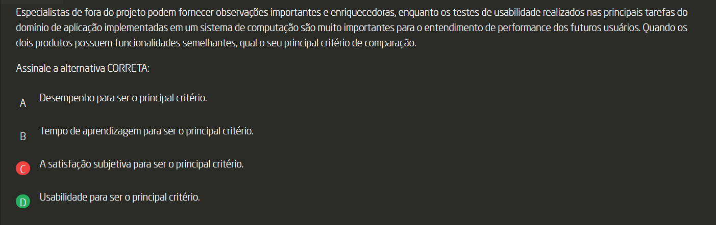 <p>Especialistas de fora do projeto podem fornecer observações importantes e enriquecedoras, enquanto os testes de usabilidade realizados nas principais tarefas do domínio de aplicação implementadas em um sistema de computação são muito importantes para entendimento de performance dos futuros usuários. Quando os dois produtos possuem funcionalidades semelhantes, qual seu principal critério de comparação. Assinale a alternativa CORRETA: A Desempenho para ser principal critério. B Tempo de aprendizagem para ser principal critério. A satisfação subjetiva para ser principal critério. D Usabilidade para ser principal critério.</p>
