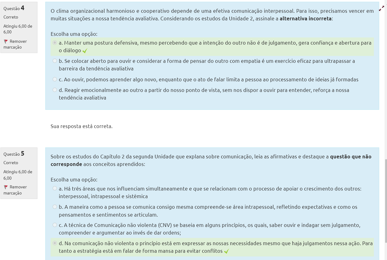 <p>Questão 4 clima organizacional harmonioso e cooperativo depende de uma efetiva comunicação interpessoal. Para isso, precisamos vencer em Correto muitas situações a nossa tendência avaliativa. Considerando os estudos da Unidade 2, assinale a alternativa incorreta: Atingiu 6,00 de 6,00 Escolha uma opção: Remover a. Manter uma postura defensiva, mesmo percebendo que a intenção do outro não é de julgamento, gera confiança e abertura para marcação o diálogo b. Se colocar aberto para ouvir e considerar a forma de pensar do outro com empatia é um exercício eficaz para ultrapassar a barreira da tendência avaliativa C. Ao ouvir, podemos aprender algo novo, enquanto que ato de falar limita a pessoa ao processamento de ideias já formadas d. emocionalmente ao outro a partir do nosso ponto de vista, sem nos dispor a ouvir para entender, reforça a nossa tendência avaliativa Sua resposta está correta. Questão 5 Sobre os estudos do Capítulo 2 da segunda Unidade que explana sobre comunicação, leia as afirmativas e destaque a questão que não Correto corresponde aos conceitos aprendidos: Atingiu 6,00 de 6,00 Escolha uma opção: Remover a. Há três áreas que nos influenciam simultaneamente e que se relacionam com o processo de apoiar o crescimento dos outros: marcação interpessoal, intrapessoal e sistêmica b. A maneira como a pessoa se comunica consigo mesma compreende-se área intrapessoal, refletindo expectativas e como os pensamentos e sentimentos se articulam. A técnica de Comunicação não violenta (CNV) se baseia em alguns princípios, os quais, saber ouvir e indagar sem julgamento, compreender e argumentar ao invés de dar ordens; d. Na comunicação não violenta o princípio está em expressar as nossas necessidades mesmo que haja julgamentos nessa ação. Para tanto a estratégia está em falar de forma mansa para evitar conflitos</p>