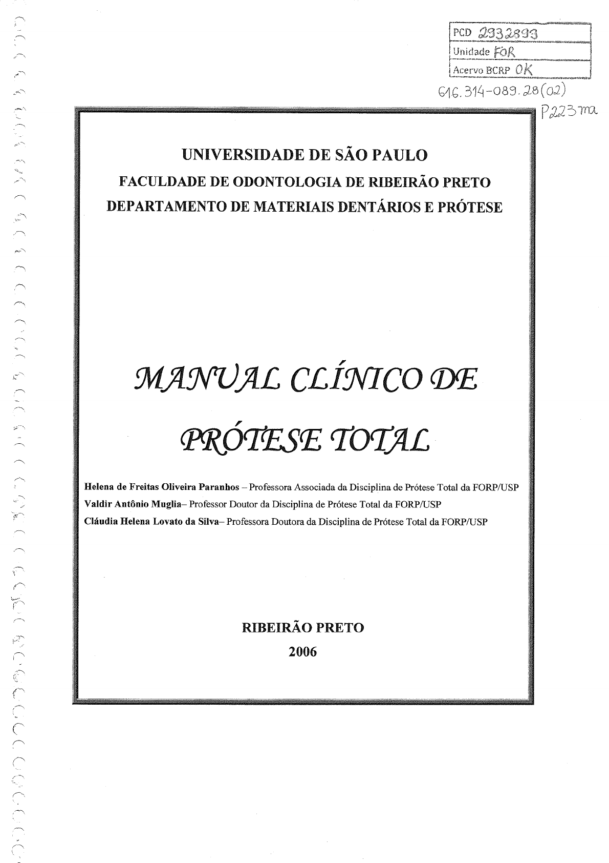 <p>PCD 2932893 Unidade FOR Acervo BCRP OK 616.314-089.28 (02) P223ma UNIVERSIDADE DE SÃO PAULO FACULDADE DE ODONTOLOGIA DE RIBEIRÃO PRETO DEPARTAMENTO DE MATERIAIS DENTÁRIOS E PRÓTESE MANUAL CLÍNICO DE TOTAL Helena de Freitas Oliveira Paranhos - Professora Associada da Disciplina de Prótese Total da FORP/USP Valdir Antônio Muglia- Professor Doutor da Disciplina de Prótese Total da FORP/USP Cláudia Helena Lovato da Silva- Professora Doutora da Disciplina de Prótese Total da FORP/USP RIBEIRÃO PRETO 2006</p><p>UNIDADE TÍTULO P. UNIDADE 1 Introdução ao estudo da Prótese Total 1 UNIDADE 2 Exame do paciente 9 UNIDADE 3 Moldagem inicial 42 UNIDADE 4 Anatomia paraprotética 68 UNIDADE 5 Ajuste clínico das moldeiras individuais 95 UNIDADE 6 Moldagem final superior 107 UNIDADE 7 Moldagem final inferior 124 UNIDADE 8 Fatores de retenção protética 139 UNIDADE 9 Relações maxilomandibulares - Dimensão vertical 157 UNIDADE 10 Relações maxilomandibulares - Relação cêntrica 181 UNIDADE 11 Seleção dos dentes artificiais 191 UNIDADE 12 Variação na montagem dos dentes artificiais 207 UNIDADE 13 Prova dos dentes em cera 216 UNIDADE 14 Instalação das próteses totais e instruções aos pacientes 222 UNIDADE 15 Reajustes em prótese total 244 UNIDADE 16 Reembasamento das próteses totais 254 UNIDADE 17 Overdenture e Prótese Total mediata 258</p><p>Introdução ao Estudo da Prótese Total 1 UNIDADE 1 1 TEMA: INTRODUÇÃO AO ESTUDO DA PRÓTESE TOTAL 2 CARGA HORÁRIA: Teórica: 1 hora; Prática: 2 horas 3 OBJETIVO GERAL: Ao final da aula, o aluno deverá ser capaz de conhecer o plano da Disciplina, bem como conceituar PRÓTESE TOTAL e conhecer a seqüência de confecção de uma prótese total convencional. 4 OBJETIVOS ESPECÍFICOS: 4.1 Situar a disciplina de Prótese Total I dentro do programa do Curso de Graduação em Odontologia da FORP-USP. 4.2 Conhecer o Plano da Disciplina e o seu Cronograma. 4.3 Conceituar Prótese Dentária. 4.4 Conhecer a classificação dos aparelhos protéticos quanto ao aspecto de fixação e transmissão dos esforços mastigatórios. 4.5 Conceituar Prótese Total 4.6 Conhecer a seqüência de confecção de uma Prótese Total Convencional, segundo a técnica indicada pela Disciplina. 5 CONTEÚDO PROGRAMÁTICO: 5.1 Apresentação da Disciplina 5.2 Posição da Disciplina dentro do curso de graduação em Odontologia da FORP- USP. 5.3 - Discussão do funcionamento e sistema de avaliação adotado pela Disciplina 5.4- Introdução ao Estudo da Prótese Total Considerações Iniciais 5.4 1 - Prótese Dentária Definição 5.4.2 Classificação dos aparelhos protéticos a) Aspecto Fixação: Próteses Fixas Próteses Removíveis: Prótese Total e Prótese Parcial b) Aspecto Transmissão dos Esforços Mastigatórios: Dento-Suportadas (Próteses Fixa) Dento-Muco-Suportadas (Prótese Parcial Removível) Mucoso-Suportada (Prótese Total) 5.4.3 Prótese Total Definição Aspecto Fixação Aspecto Transmissão dos Esforços Mastigatórios Apresentação de um caso clínico 6 ATIVIDADE DE ENSINO: Teórica: Aula Expositiva e Grupos de Discussão Prática: Atividade em Laboratório 7 SISTEMA DE AVALIAÇÃO: Prova Dissertativa Semanal e Bimestral 8 REFERÊNCIA BIBLIOGRÁFICA: 8.1 SAIZAR, P. Protesis a Placa. Buenos Aires, Progrental, 1958. Cap. I</p><p>Introdução ao Estudo da Prótese Total 2 8.2 - BORDENAVE, J. D.; PEREIRA,A. M. Estratégias do Ensino e Aprendizagem. Petrópolis, Vozes, 1991. p. 23-56. 8.3 - TAMAKI, T. Dentaduras Completas. São Paulo, Sarvier, 1979. Cap.III: Considerações Gerais sobre Dentaduras Completas. 8.4 - PHILLIPS, R. W. Skinner Materiais Dentários. Rio de Janeiro, Guanabara Koogan, 1993. Caps. 5 e 8: Gessos e Hidrocolóides Irreversíveis. 9 - DOCENTE RESPONSÁVEL: Profa. Dra. Helena de Freitas Oliveira Paranhos</p><p>Introdução ao Estudo da Prótese Total 3 DEFINIÇÃO DE PRÓTESE Segundo Ewing (1954), a palavra "PRÓTESE" veio dos radicais gregos PRÓS e THENI que significam respectivamente PARA e LUGAR. Assim, etimologicamente, Prótese indica a colocação de alguma coisa em algum lugar. Segundo o GLOSSÁRIO DE TERMOS PROTÉTICOS edição (The Journal of Prosthetic Dentistry, V. 81, n.1, Jan., 1999), a palavra "prótese" pode ser definida como "uma substituição artificial para uma parte ausente do corpo humano ou "um aparelho terapêutico para melhorar ou alterar a função" Uma prótese é a reposição de porções do corpo humano por partes artificiais, tais como um olho, uma perna ou dentição. Prótese é, portanto, a arte ou ciência da confecção das partes faltantes do corpo humano. Quando aplicada à odontologia, a ciência Prótese toma o nome particular de Prótese Dental e é o ramo da odontologia que trata especialmente da reposição de elementos dentais e tecidos orais ausentes. Segundo o GLOSSÁRIO, pode ser definida como "a substituição artificial de um ou mais dentes e/ou estruturas associadas". Ela consiste no ramo da odontologia responsável pela restauração e preservação da função oral, conforto, aparência e saúde do paciente por meio da reposição de dentes e tecidos adjacentes utilizando elementos artificiais. A prótese é uma especialidade que resulta da harmoniosa combinação das leis científicas com os princípios estéticos da arte. Este importantíssimo ramo da odontologia em questão, sob o ponto de vista científico, é regido pelas complexas leis biomecânicas, cujas causas e efeitos se entrelaçam com as demais ciências afins para formar as teorias e os princípios. E, artificialmente falando, a prótese obedece aos princípios canônicos da beleza para dar vida aos aparelhos inanimados que substituem os órgãos dentais perdidos. Os objetivos da substituição dos elementos ausentes é de restituir a função, a estética e a saúde do órgão mastigatório, favorecendo a manutenção desse órgão em condições normais, por maior tempo possível.</p><p>Introdução ao Estud