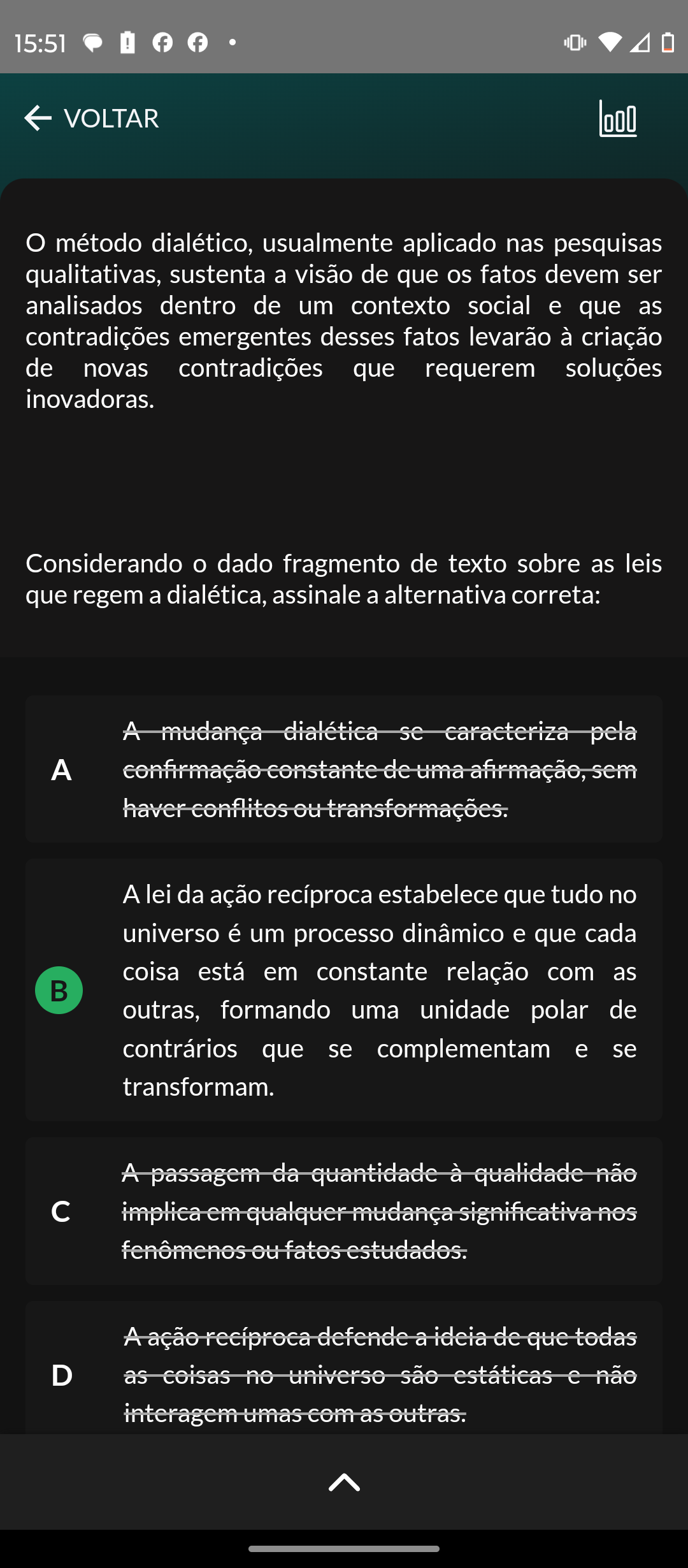 <p>15:51 VOLTAR O método dialético, usualmente aplicado nas pesquisas qualitativas, sustenta a visão de que os fatos devem ser analisados dentro de um contexto social e que as contradições emergentes desses fatos levarão à criação de novas contradições que requerem soluções inovadoras. Considerando O dado fragmento de texto sobre as leis que regem a dialética, assinale a alternativa correta: A mudança dialética se caracteriza pela A confirmação constante de uma sem haver conflitos ou transformações. A lei da ação recíproca estabelece que tudo no universo é um processo dinâmico e que cada coisa está em constante relação com as outras, formando uma unidade polar de contrários que se complementam e se transformam. A passagem da quantidade à qualidade não C implica em qualquer mudança significativa nos fenômenos ou fatos A ação recíproca defende a ideia de que todas D as coisas universe são estáticas e não interagem umas com as outras.</p>