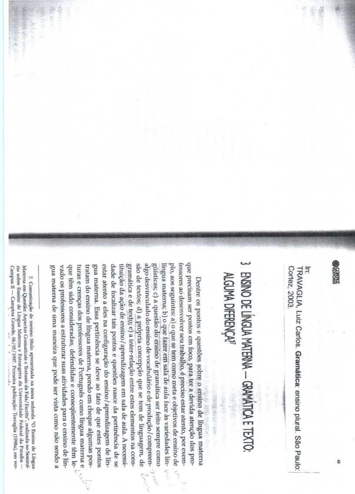 <p>CORTEZ 43 EDITORA In: TRAVAGLIA, Luiz Carlos. Gramática: ensino plural. São Paulo: Cortez, 2003. 3 ENSINO DE LÍNGUA MATERNA - GRAMÁTICA E TEXTO: ALGUMA DIFERENÇA? Dentre os pontos e questões sobre o ensino de língua materna que precisam ser postos em foco, para ter a devida atenção dos pro- fessores ao desenvolver seu trabalho, é preciso estar atento, por exem- plo, aos seguintes: a) o que se tem como meta e objetivos de ensino de língua materna; b) o que fazer em sala de aula face às variedades lin- c) a questão do ensino de gramática ser feito sempre como algo desvinculado do ensino de vocabulário e de produção / compreen- são de textos; d) a própria concepção que se tem de linguagem, de gramática e de texto; e) a inter-relação entre estes elementos na cons- tituição da ação de ensino/aprendizagem em sala de aula. A necessi- dade de focalizar tais pontos e questões nasce da pertinência de se estar atento a eles na configuração do ensino / aprendizagem de gua materna. Essa pertinência se deve ao fato de que estes pontos tratam do ensino de língua materna, pondo em cheque algumas pos- turas e crenças dos professores de Português como língua materna e que têm sido consideradas, defendidas e têm le- vado os professores a estruturar suas atividades para o ensino de gua materna de úma maneira que pode ser vista como não sendo a 7. Comunicação de mesmo título apresentada na mesa redonda "O Ensino de Língua Materna em Questão: Aspectos Gramaticais e Textuais da Fala/Escrita", realizada no rio sobre Ensino de Língua Materna e Estrangeira da Universidade Federal da Campus II - Campina Grande, 06/05/1997. Primeira publicação: Travaglia em ver-</p><p>LUIZ CARLOS TRAVAGLIA GRAMATICA ENSINO mais desejável em termos de uma formação que se pretende dar aos Sabe-se também que o sentido que uma faz alunos. Estas afirmações criam o compromisso de propor alternati- (e que a transforma em texto) depende de uma série de recursos, me- vas, que temos buscado levar a efeito em vários trabalhos e que canismos, fatores e princípios internos e externos à língua. Todos es- pretendemos fazer tes elementos estão de alguma forma inscritos e regularizados na Evidentemente pode ser visto como muito pretensioso fazer tan- gua, constituindo a sua gramática. Por isto é que se pode afirmar que to num espaço tão pequeno quanto o deste capítulo, mas parece pos- a gramática de uma língua é o conjunto de condições para sível fazê-lo atendo-se a alguns pontos fundamentais que represen- a significação. Portanto, o conjunto desses recursos, mecanismos, fa- tam a base para a configuração de um tipo de trabalho com a língua tores e princípios que usamos para produzir efeitos de sentido é a materna em sala de aula que parece mais pertinente para os alunos gramática de uma língua. em sua vida social e mesmo para nós, professores, porque mais grati- Todos os recursos da língua em todos os seus planos ficante em seus resultados. (fonológico, morfológico, sintático, semântico, pragmático) e níveis Em primeiro lugar, é preciso questionar a dicotomia posta quan- (lexical, frasal, textual-discursivo) em termos de unidades e estru- do se diz "aspectos gramaticais e textuais da fala/escrita", pois dizer turas (sejam elas fonológicas, morfológicas, sintáticas, textuais), fun- assim faz pensar que o que é textual não é gramatical e que que é cionam como pistas e instruções de sentidos que são coadjuvados nesta gramatical não é textual, posição com a qual não podemos concordar. função por mecanismos, fatores e Dessa ação conjunta Tal crença um problema para o que se faz em sala de aula, pois faz surgem os efeitos de sentido possíveis para uma dada lin- supor uma separação entre as atividades de ensino de gramática e de usada como texto numa dada situação de produção/compreensão de que inexiste, mas passa a existir por força da verbalização da mesma, o que acaba prejudicando em que se disse anteriormente autoriza afirmar que tudo o que é muito o trabalho que se poderia fazer e que em linhas básicas se pre- gramatical é textual e, vice-versa, que tudo o que é textual é gramati- tende esboçar aqui. cal. Assim, quando se estudam aspectos gramaticais de uma língua, estão sendo estudados os recursos de que a língua dispõe para que o Antes de mais nada é preciso acreditar que o homem se comuni- falante/escritor constitua seus textos para produzir o(s) efeito(s) de ca por meio de textos. Assim, comunicar-se significa de alguma forma ou não) produzir um efeito de sentido entre o(s) sentido que pretende sejam percebidos pelo ouvinte/leitor e o que produtor(es) de um texto e o(s) receptor(es) desse mesmo texto. Esse afeta esta percepção. E quando são estudados aspectos textuais da efeito de sentido é que faz com que algo seja um texto. Se nos restrin- língua estamos estudando como esses recursos funcionam na intera- girmos aos textos podemos dizer que uma lin- ção comunicativa. güística só se transforma em texto quando produz um efeito de senti- do entre seu produtor e seu receptor, ou seja, quando sentido para Caso contrário, o que temos é só um amontoado de ele- 9. Embora a distinção entre mecanismos, fatores e não seja fácil nem de um modo geral podemos dizer que mecanismos seriam alguns da língua que permi- mentos da língua, mas não um texto. Esta é a lição que aprendemos tem os efeitos de sentido produzidos no texto como, por exemplo, as chamadas figuras de com a Textual ao tratar de coerência (cf. Koch & Travaglia linguagem, a pressuposição, as implicaturas princípios seriam certas regras gerais a se- (1989 e 1990)). rem seguidas porque na comunicação a forma como falantes constituem textos como, por exemplo, os princípios conversacionais e os de preservação das faces e fatores se- riam elementos que interferem de alguma forma na constituição dos textos e no sentido que eles fazer