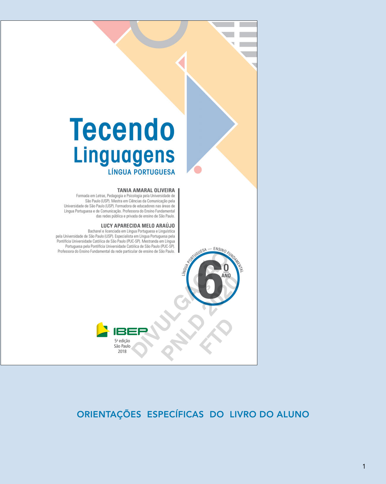 <p>1</p><p>ORIENTAÇÕES ESPECÍFICAS DO LIVRO DO ALUNO</p><p>1</p><p>P20LP6_professor.indb 1 30/10/18 15:00</p><p>22</p><p>P20LP6_professor.indb 2 30/10/18 15:00</p><p>33</p><p>P20LP6_professor.indb 3 30/10/18 15:00</p><p>44</p><p>P20LP6_professor.indb 4 30/10/18 15:00</p><p>55</p><p>P20LP6_professor.indb 5 30/10/18 15:00</p><p>6</p><p>P20LP6_professor.indb 6 30/10/18 15:00</p><p>7</p><p>P20LP6_professor.indb 7 30/10/18 15:00</p><p>8</p><p>P20LP6_professor.indb 8 30/10/18 15:00</p><p>9</p><p>P20LP6_professor.indb 9 30/10/18 15:00</p><p>10</p><p>P20LP6_professor.indb 10 30/10/18 15:00</p><p>11</p><p>P20LP6_professor.indb 11 30/10/18 15:00</p><p>1212</p><p>LEIA ANTES</p><p>O aluno, entre 11 e 12 anos, passa por</p><p>transformações que o fazem pensar sobre</p><p>a própria identidade e sobre seu lugar nos</p><p>espaços em que transita.</p><p>A escolha da temática desta unidade tem</p><p>por finalidade contribuir para a socializa-</p><p>ção, ou seja, para que o aluno conheça o</p><p>outro e também a si mesmo.</p><p>A formação da identidade recebe a in-</p><p>fluência de fatores intrapessoais (as capa-</p><p>cidades inatas do indivíduo e as caracte-</p><p>rísticas adquiridas da personalidade), de</p><p>fatores interpessoais (identificações com</p><p>outras pessoas) e de fatores culturais (va-</p><p>lores sociais a que uma pessoa está expos-</p><p>ta, tanto globais como comunitários).</p><p>A adolescência é uma fase de mudanças</p><p>que se refletem no corpo físico e no as-</p><p>pecto psicológico. A construção da iden-</p><p>tidade na adolescência acontece a partir</p><p>da imagem que o aluno tem de si e suas</p><p>percepções acerca da estrutura corporal,</p><p>da aparência, dos valores e de como os</p><p>outros o veem. A formação da identidade</p><p>implica em definir quem a pessoa é, quais</p><p>seus valores e quais direções que deseja</p><p>seguir pela vida. A imagem corporal é um</p><p>dos fatores que influencia nessa formação.</p><p>A satisfação com o corpo também sofre</p><p>influências da família, dos amigos, da mí-</p><p>dia e da sociedade em geral.</p><p>• DOLTO, F. A causa dos adolescentes. Trad. Orlando Reis. 2. ed. São Paulo: Ideias e Letras, 2004.</p><p>• MARTINS, Ana Rita. A busca da identidade na adolescência. Nova Escola. São Paulo, 1o mar.</p><p>2010. Disponível em: <https://bit.ly/2njGgXZ>. Acesso em: 23 set. 2018.</p><p>• SCHOEN-FERREIRA, Teresa Helena; AZNAR-FARIAS, Maria; MATTOS, Edwiges Ferreira de Mat-</p><p>tos Silvares. A construção da identidade em adolescentes: um estudo exploratório. Disponível</p><p>em: <https://bit.ly/2q9SsON>. Acesso em: 23 set. 2018.</p><p>PARA SABER MAIS</p><p>P20LP6_professor.indb 12 30/10/18 15:00</p><p>1313</p><p>ANOTAÇÕES</p><p>P20LP6_professor.indb 13 30/10/18 15:00</p><p>14</p><p>PARA COMEÇO DE CONVERSA</p><p>Habilidade</p><p>(EF67LP28)</p><p>A seção Para começo de conversa pro-</p><p>põe uma discussão prévia sobre questões</p><p>relacionadas à identidade, tema do capí-</p><p>tulo, que contribuem para a socialização,</p><p>ou seja, para que o aluno conheça o outro</p><p>e também a si mesmo.</p><p>Sugerimos que as atividades sejam res-</p><p>pondidas pelos alunos organizados em</p><p>duplas ou em pequenos grupos.</p><p>Atividades</p><p>1 a 6. Se necessário, informe aos alunos</p><p>que o Menino Maluquinho é um per-</p><p>sonagem criado em 1980 pelo escritor</p><p>e cartunista Ziraldo Alves Pinto. Ele é</p><p>um menino alegre e sapeca que caiu no</p><p>gosto dos brasileiros e serviu de inspira-</p><p>ção para vários livros, uma peça teatral,</p><p>filmes, histórias em quadrinhos e uma</p><p>série de TV. Uma das principais carac-</p><p>terísticas desse personagem é usar uma</p><p>panela como chapéu.</p><p>5. Sugestão de resposta: Sim, pois, ape-</p><p>sar de querer inovar um pouco o visual,</p><p>não deixou de lado aquilo que já é sua</p><p>marca, que já faz parte de sua identida-</p><p>de, ou seja, aquilo que também o torna o</p><p>Menino Maluquinho.</p><p>Durante a exploração da HQ, é importan-</p><p>te ter em mente que as respostas pessoais</p><p>podem estar relacionadas à questão da</p><p>autoestima dos alunos, pois no período da</p><p>adolescência eles associam o uso de rou-</p><p>Competências gerais</p><p>1, 3, 9 e 10</p><p>Competências específicas de</p><p>Língua Portuguesa</p><p>1 e 8</p><p>Habilidades</p><p>(EF06LP04), (EF67LP08), (EF67LP14),</p><p>(EF67LP20), (EF67LP21), (EF67LP23),</p><p>(EF67LP24), (EF67LP27), (EF67LP28),</p><p>(EF67LP35), (EF69LP07), (EF69LP10),</p><p>(EF69LP13), (EF69LP15), (EF69LP25),</p><p>(EF69LP39), (EF69LP44), (EF69LP47)</p><p>e (EF69LP49).</p><p>COMPETÊNCIAS E HABILIDADES</p><p>TRABALHADAS NO CAPÍTULO 1</p><p>pas e acessórios à beleza e à autoconfiança.</p><p>O Menino Maluquinho, assim como a</p><p>maioria dos adolescentes, usa o boné para</p><p>ajudá-lo a representar um papel socialmen-</p><p>te. Entretanto, no final da HQ, ao usar a</p><p>panela na cabeça embaixo do boné, ele de-</p><p>monstra quem é, pois a panela faz parte de</p><p>sua identidade.</p><p>ANOTAÇÕES</p><p>P20LP6_professor.indb 14 30/10/18 15:00</p><p>15</p><p>Atividades</p><p>7. Sugestão de resposta: Apenas as falas</p><p>dos personagens não alcançariam o sen-</p><p>tido que a história completa transmite.</p><p>Por exemplo, quando Maluquinho se</p><p>refere ao visual, dizendo que não está</p><p>bom, não seria possível saber a que vi-</p><p>sual o personagem da história se refere</p><p>sem ver a imagem.</p><p>8. Estimule a turma a compartilhar suas</p><p>vivências. Aproveite o momento para</p><p>conversar com os alunos sobre questões</p><p>relacionadas à transição da infância para</p><p>a adolescência e sobre a passagem do 5o</p><p>para o 6o ano, que costuma ser uma fase</p><p>bastante delicada para alguns deles.</p><p>PRÁTICA DE LEITURA</p><p>Competência geral</p><p>3</p><p>Habilidade</p><p>(EF67LP27)</p>