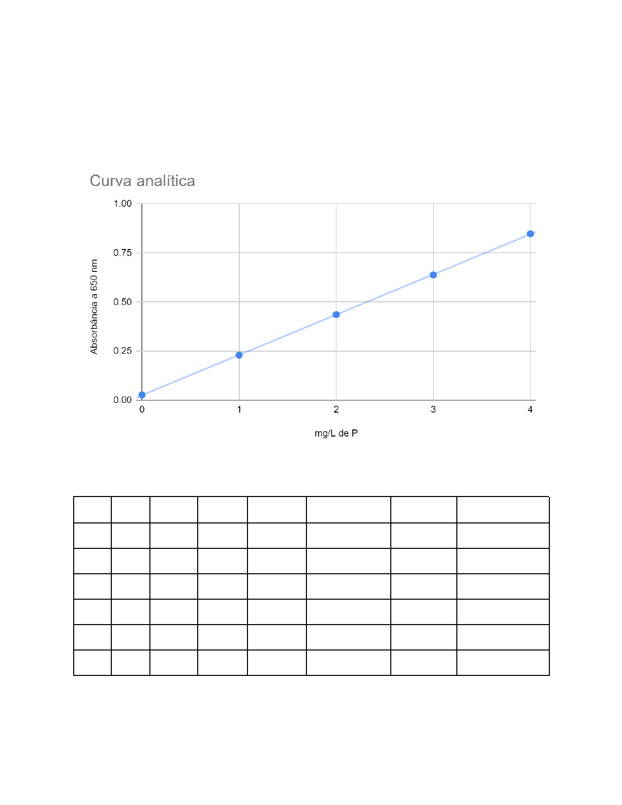 <p>Questão 2</p><p>A.</p><p>Com os dados de concentração (x) e absorbância (y), montamos a curva analítica:</p><p>Para encontrar a equação, começamos montando a tabela:</p><p>i xi yi xi - x̄ yi - ȳ (xi - x̄)(yi - ȳ) (xi - x̄)2 (yi - ȳ)2</p><p>1 0 0.027 -2 -0.4088 0.8176 4 0.16711744</p><p>2 1 0.230 -1 -0.2058 0.2058 1 0.04235364</p><p>3 2 0.436 0 0.0002 0 0 0.00000004</p><p>4 3 0.638 1 0.20202 0.2022 1 0.04088484</p><p>5 4 0.848 2 0.4122 0.8244 4 0.16990884</p><p>Σ 10 2.179 — — 2.0500 10 0.4202648</p><p>As médias de x e y (usadas nas colunas 4, 5, 6 e 7) são:</p><p>Então, podemos obter a equação da curva analítica y = a + bx com:</p><p>Ou seja, a curva analítica tem equação: y = 0.0258 + 0.2050x.</p><p>Para determinar a sensibilidade do método, precisamos do desvio padrão das</p><p>absorbâncias:</p><p>A sensibilidade é a razão entre a inclinação da curva analítica (b = 0.2050, encontrado</p><p>anteriormente) e o desvio padrão das medidas dos sinais (Sy = 0.3241, encontrado</p><p>agora), isto é:</p><p>B.</p><p>Conhecendo a absorbância (y) da amostra, podemos encontrar sua concentração (x),</p><p>isto é:</p><p>Esta concentração, entretanto, é da amostra diluída de 1 mL a 50 mL, portanto a</p><p>concentração da amostra original é:</p><p>C.</p><p>Assumindo que a concentração seja constante e uniforme, se ao longod e 24h o</p><p>volume de urina produzido foi 1.25 L, então:</p>