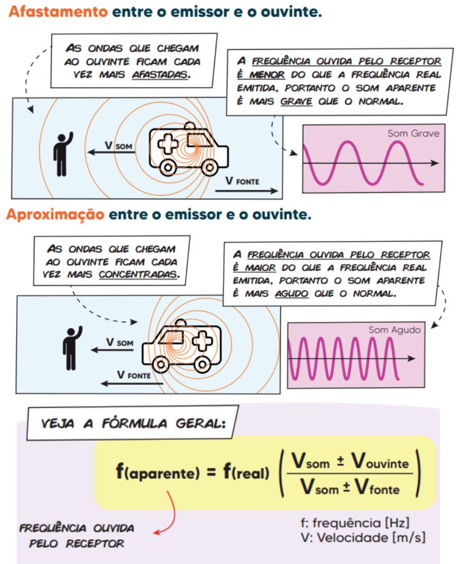<p>Capítulo 5 – Efeito Doppler (páginas 203 a 211)</p><p>Quando uma fonte sonora está em movimento em relação ao ouvinte, a frequência ouvida pelo</p><p>receptor é diferente daquela frequência real emitida, a distorção desse som é explicada pelo</p><p>Efeito Doppler.</p><p>Exercícios</p><p>1. Um caixa do som emite uma frequência de 500 Hz. Determine a frequência ouvida por um</p><p>corredor que se aproxima dessa caixa com uma velocidade constante de 2 m/s.</p><p>2. Um caixa do som emite uma frequência de 800 Hz. Determine:</p><p>a) A frequência ouvida por um corredor que se aproxima dessa caixa com velocidade</p><p>constante de 3 m/s.</p><p>b) A frequência ouvida por um corredor que se afasta dessa caixa com velocidade</p><p>constante de 3 m/s.</p><p>3. Uma ambulância viajando a 30 m/s passa por um pedestre que está parado em uma</p><p>calçada. A sua sirene fica ligada durante todo o percurso e emite um som de frequência</p><p>igual a 100 Hz. Determine:</p><p>a) A frequência ouvida pelo pedestre quando ela está se aproximando.</p><p>b) A frequência ouvida pelo pedestre quando ela está se afastando.</p><p>4. Um carro de som em movimento emite uma frequência de 800 Hz, nessa mesma avenida</p><p>há um ciclista que vai no sentido contrário ao do carro. (Todas as velocidades estão</p><p>representadas no desenho abaixo)</p><p>Qual é a frequência ouvida pelo ciclista?</p><p>5. Na prática 2 (apostila – pág. 206).</p><p>6. Exercício 4 (apostila – pág. 207).</p><p>7. Exercício 5 (apostila – pág. 207).</p><p>8. Exercício 7 (apostila – pág. 208).</p>