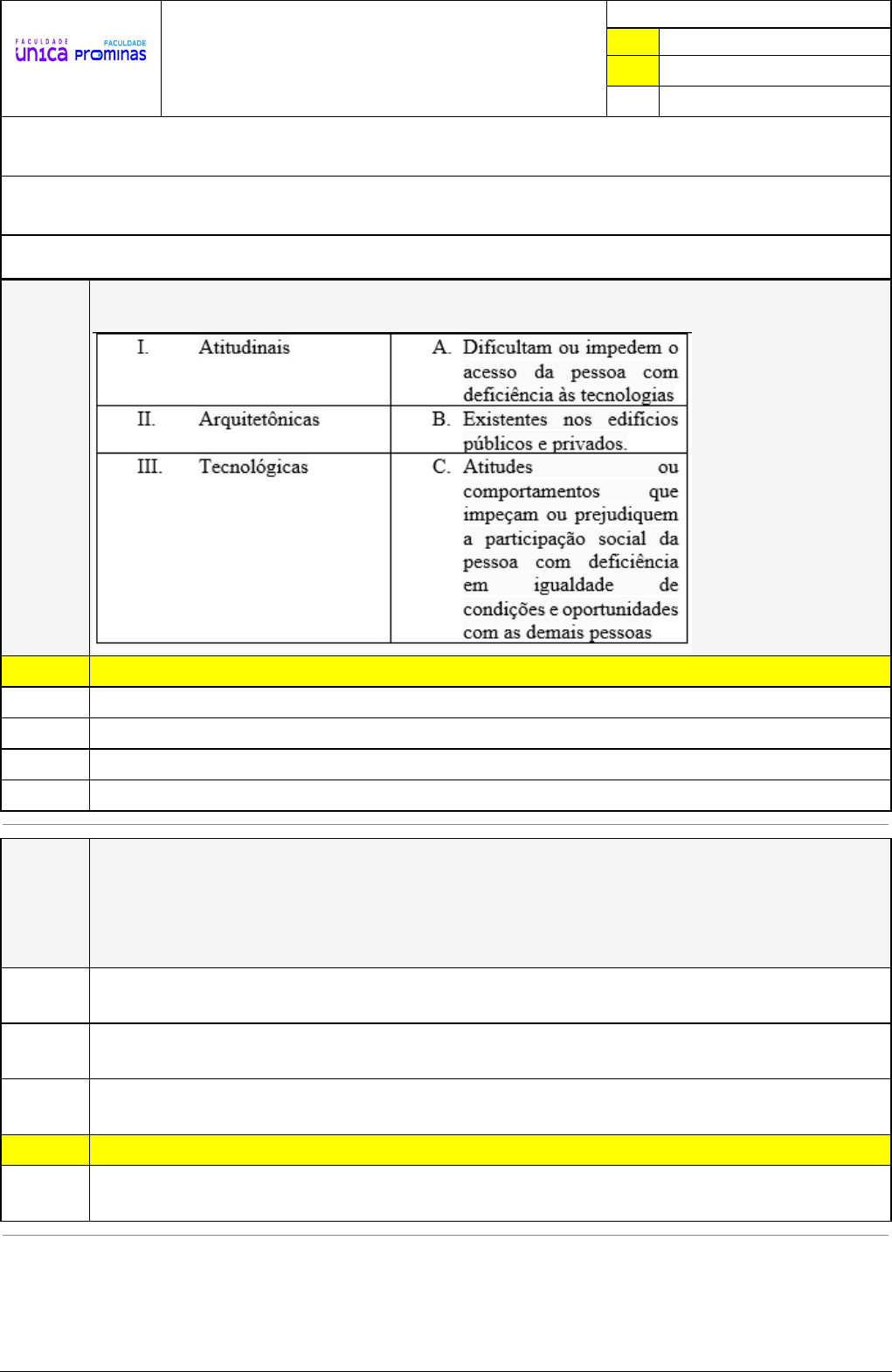<p>Pincel Atômico - 05/08/2024 01:08:22 1/7</p><p>MARIA JOSÉ NETO</p><p>Avaliação Online (Curso Online - Automático)</p><p>Atividade finalizada em 19/05/2024 20:57:21 (1442192 / 1)</p><p>LEGENDA</p><p>Resposta correta na questão</p><p># Resposta correta - Questão Anulada</p><p>X Resposta selecionada pelo Aluno</p><p>Disciplina:</p><p>EDUCAÇÃO ESPECIAL E AS POLÍTICAS EDUCACIONAIS INCLUSIVAS [986637] - Avaliação com 20 questões, com o peso total de 50,00 pontos</p><p>[capítulos - Todos]</p><p>Turma:</p><p>Segunda Graduação: Segunda Graduação 6 Meses - Licenciatura em Educação Especial - Grupo: FPD-NOVEMBRO/2023 - SGegu0A271123</p><p>[108016]</p><p>Aluno(a):</p><p>91537943 - MARIA JOSÉ NETO - Respondeu 14 questões corretas, obtendo um total de 35,00 pontos como nota</p><p>[361010_1734</p><p>49]</p><p>Questão</p><p>001</p><p>Relacione a respectiva barreira de inclusão da coluna da esquerda com a respectiva</p><p>característica na coluna da direita</p><p>I – C, II – B, III - A</p><p>I – B, II - A, III - C</p><p>I – B, II – C, III – A</p><p>X I – A, II – C, III - B</p><p>I – A, II – B, III - C</p><p>[361010_1612</p><p>61]</p><p>Questão</p><p>002</p><p>A espiritualidade é a vivência de um espírito que anima a vida, imbricada na relação</p><p>com a fé. Mas isso não necessariamente tem que está relacionado à fé ou a espaços</p><p>religiosos, por isso, cabe uma espiritualidade com laicidade e até mesmo legítima,</p><p>ateia e íntegra. A fé é um ato de crença (acreditar, confiar e entregar) que se deposita</p><p>em alguém ou coisas. A fé é:</p><p>A instrução e apreensão de poderes mentais, havendo uma preocupação secundária</p><p>com o processo ensino-aprendizagem.</p><p>A instrução e apreensão da encenação social, havendo uma preocupação secundária</p><p>com o processo ensino-aprendizagem.</p><p>A instrução e apreensão de danças e ritmos, havendo uma preocupação secundária</p><p>com o processo ensino-aprendizagem.</p><p>X Uma atitude de confiança plena naquilo que não se vê e não se tem certeza.</p><p>A instrução e apreensão de músicas, havendo uma preocupação secundária com o</p><p>processo ensino-aprendizagem.</p><p>Pincel Atômico - 05/08/2024 01:08:22 2/7</p><p>[361010_1617</p><p>14]</p><p>Questão</p><p>003</p><p>A Declaração Universal dos Direitos Humanos foi elaborada em dezembro de _____</p><p>pela ______________________, e está organizada em ____ artigos. Esta Declaração</p><p>representa ”o ideal comum a ser atingido por todos os povos e todas as nações, com o</p><p>objetivo de que cada indivíduo e cada órgão da sociedade [...] esforce-se [...] por</p><p>promover o respeito a esses ____________, e [...] por assegurar o seu</p><p>reconhecimento e a sua observância universais e efetivos, tanto entre os povos dos</p><p>próprios Países-Membros quanto entre os povos dos territórios sob sua jurisdição”.</p><p>Assinale a alternativa que preenche, correta e respectivamente, as lacunas do trecho</p><p>acima.</p><p>1945 – Organização Mundial da Saúde – 40 – deveres e liberdades</p><p>X 1948 – Organização das Nações Unidas – 30 – direitos e liberdades</p><p>1948 – Organização das nações Unidas – 40 – deveres e liberdades</p><p>1948 – Liga das Nações – 40 – direitos e liberdades</p><p>1945 – Organização das Mundial da Saúde – 30 – direitos e liberdades</p><p>[361010_1617</p><p>34]</p><p>Questão</p><p>004</p><p>(ENEM/2020 – DIGITAL) A masculinidade, assim como a feminilidade, é uma</p><p>construção histórica e cultural. Em nossa cultura, a dança caracteriza-se, no sentido</p><p>geral, como um universo predominantemente feminino. Homens que dançam são</p><p>geralmente considerados homossexuais, por não se enquadrarem dentro das normas</p><p>culturais hegemônicas de gênero e sexualidade. Por outro lado, demonstram a não</p><p>existência de um único tipo de masculinidade, enfatizando que as identidades</p><p>humanas são múltiplas e plurais. No contexto da dança, as representações</p><p>hegemônicas de gênero e as regulações sociais que essas impõem não se</p><p>manifestam de forma igual em todas as modalidades de dança. Persiste essa forte</p><p>representação cultural ocidental que associa o balé à feminilidade e à</p><p>homossexualidade. Em outras danças, ela não se revela tão forte, e os homens não</p><p>aparecem em menor número, como nas tradicionais danças folclóricas ou no moderno</p><p>hip hop.</p><p>ANDREOLI, G. S. Representações de masculinidade na dança contemporânea.</p><p>Movimento, n. 1, 2011 (adaptado).</p><p>No que tange à identidade de gênero masculina, a dança e suas modalidades</p><p>expressam o(a):</p><p>reforço de uma feminilidade hegemônica.</p><p>padronização da inserção dos homens nessas manifestações corporais.</p><p>contestação das normas sociais pelo balé.</p><p>X reconhecimento das diferentes masculinidades.</p><p>identificação de como essas práticas regulam uma única masculinidade.</p><p>[361010_1613</p><p>83]</p><p>Questão</p><p>005</p><p>Em resumo, a História da psiquiatria brasileira criou uma atmosfera psiquiátrica</p><p>saturada de conotações ideológicas. A LBHM herdou esse tipo de pensamento,</p><p>reforçando-o e desenvolvendo-o, graças à incapacidade que tiveram seus psiquiatras</p><p>em discriminar aquilo que nas suas teorias era determinado pelos preconceitos da</p><p>cultura (COSTA, Jurandir Freire. História da Psiquiatria no Brasil: Um Corte Ideológico.</p><p>Rio de Janeiro: Garamond, 2007, p.44).</p><p>Embora tenha sido criada em 1923, foi só a partir de 1926 que os psiquiatras que</p><p>compunham a Liga Brasileira de Higiene Mental começaram a construir projetos</p><p>direcionados à:</p><p>entrega de remédios.</p><p>X abolição da escravatura.</p><p>eugenia, educação de indivíduos e prevenção.</p><p>Pincel Atômico - 05/08/