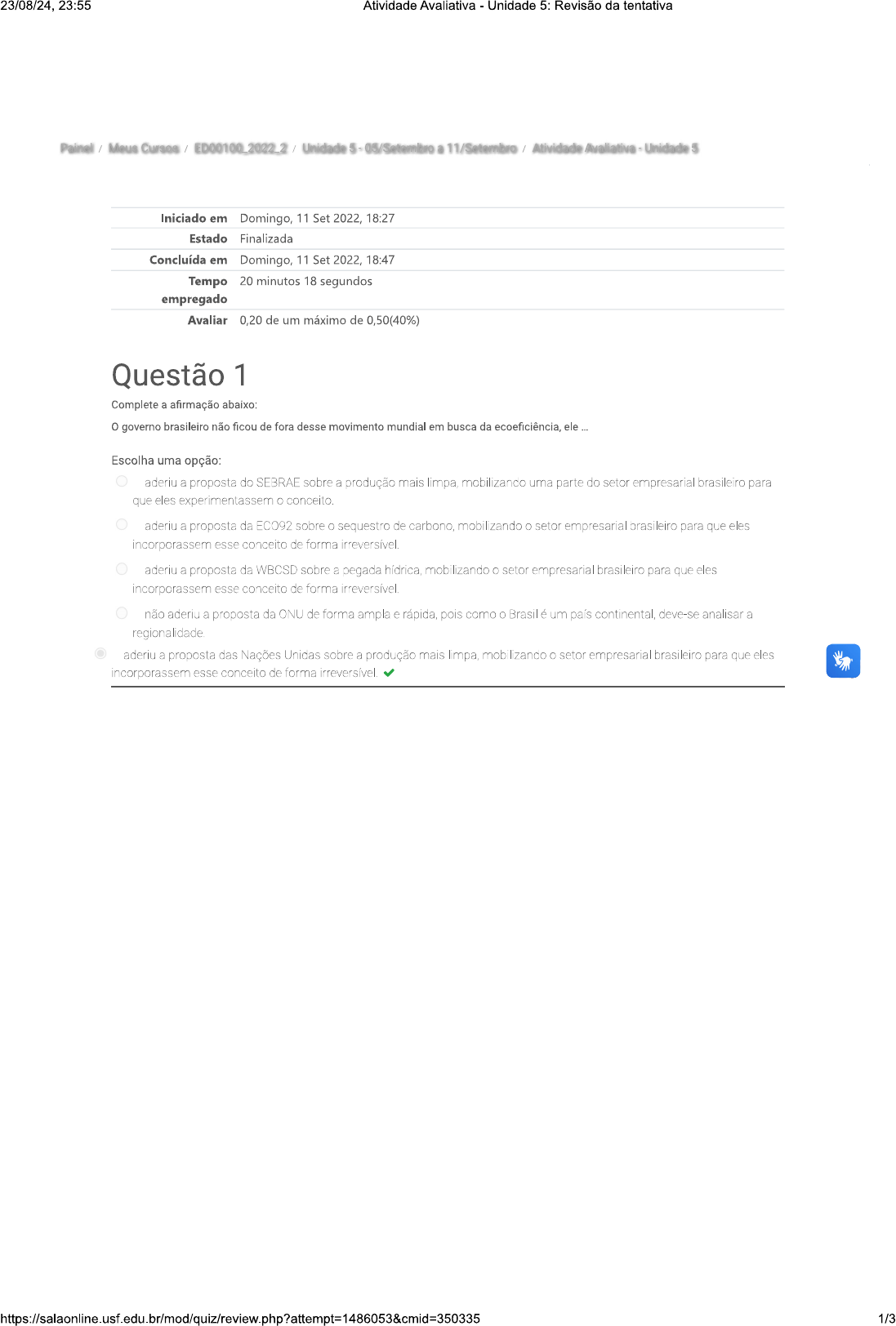 <p>23/08/24, 23:55 Atividade Avaliativa - Unidade 5: Revisão da tentativa Painel / Meus Cursos / ED00100_2022_2 / Unidade 5 05/Setembro a 11/Setembro / Atividade Avaliativa Unidade 5 Iniciado em Domingo, 11 Set 2022, 18:27 Estado Finalizada Concluída em Domingo, 11 Set 2022, 18:47 Tempo 20 minutos 18 segundos empregado Avaliar 0,20 de um máximo de 0,50(40%) Questão 1 Complete a afirmação abaixo: o governo brasileiro não ficou de fora desse movimento mundial em busca da ecoeficiência, ele ... Escolha uma opção: aderiu a proposta do SEBRAE sobre a produção mais limpa, mobilizando uma parte do setor empresarial brasileiro para que eles experimentassem conceito. aderiu a proposta da sobre sequestro de carbono, mobilizando setor empresarial brasileiro para que eles incorporassem esse conceito de forma aderiu a proposta da WBCSD sobre a pegada hídrica, mobilizando O setor empresarial brasileiro para que eles incorporassem esse conceito de forma não aderiu a proposta da ONU de forma ampla e rápida, pois como Brasil é um país continental, deve-se analisar a regionalidade. aderiu a proposta das Nações Unidas sobre a produção mais limpa, mobilizando setor empresarial brasileiro para que eles incorporassem esse conceito de forma https://salaonline.usf.edu.br/mod/quiz/review.php?attempt=1486053&cmid=350335 1/3</p><p>23/08/24, 23:55 Atividade Avaliativa Unidade 5: Revisão da tentativa Questão 2 "A ecoeficiência é uma das principais medidas que contribuem para um futuro sustentável. Este conceito se refere à disponibilização de serviços e bens capazes de satisfazer as necessidades humanas e proporcionar qualidade de vida sem causar impactos ambientais e gastando o mínimo dos recursos naturais não (e-Cycle. Disponível em: https://www.ecycle.com.br/ecoeficiencia/) Julgue em verdadeiro (V) e falso (F) para sobre as medidas de ecoeficiência que aparecem a seguir: () Minimize a geração de resíduos: Utilize descartáveis e estimule, por exemplo, o uso de papel de rascunho para impressão e outros fins, bem como que colaboradores evitem canecas de vidro ou porcelana, além disso, incentive a reciclagem e para os resíduos orgânicos, você pode fazer compostagem e ainda produzir adubo de qualidade; () Uso consciente da água: Um dos maiores desperdícios em corporações é a água. Planeje um ciclo de reutilização da água para beber, regar jardim, lavar equipamentos e outros usos. Instale nos banheiros válvulas de descarga com regulagem ecológica e temporizadores; () Uso de energia elétrica: Se você estiver ainda na fase de planejamento do seu empreendimento contemple na sua edificação a localização da portas e janelas no sentido oposto do vento local e período de insolação durante o dia para que você aproveite o máximo de iluminação e ventilação natural aumentando o uso de energia elétrica a gasto com an condicionado. Caso já esteja instalado utilize então lâmpadas frias, de LEED, que gastam menos energia ou então instale painéis solares e se esforce para manter seus aparelhos de condicionado limpos, e desligue-os 30 minutos antes do final do expediente. Se possível, utilize sistemas ecológicos de refrigeração; () Ambiente Verde: Tenha árvores ou jardins verticais dentro da empresa, e, se possível, patrocine uma área verde na comunidade. Isso ajuda com a imagem da empresa e também com a qualidade do ar; () Fornecedores: Dê preferência a fornecedores conhecidos nacionalmente mesmo que de outros Estados. Além de incentivar o desenvolvimento econômico da região, você também reduz o gasto de combustível e emissão de poluentes, além disso, quando possível escolha fornecedores e parceiros que também persigam a ecoeficiência. Responsabilidade ambiental é algo que deve estar presente em toda a cadeia produtiva Escolha uma opção: Questão 3 Analise as proposições abaixo sobre exemplos de medidas ecoeficientes. I. A respeito de exemplos de medidas Ecoeficientes Hídricas diversos são os equipamentos disponíveis atualmente que são capazes de reduzir o consumo de água, como por exemplo torneiras com arejadores, medidas que podem resultar em até 75% de redução de consumo. PORQUE II. Dependendo da sua utilização os recursos hídricos não só podem como devem ser reutilizados, a água da pia conhecida como águas cinzas, podem ser reutilizadas para lavar pátios e garagens, regar jardins entre outros. A respeito dessas asserções, assinale a opção correta: Escolha uma opção: A asserção é uma proposição falsa, e a é uma proposição verdadeira. As asserções I e II são proposições verdadeiras, e a II é uma justificativa correta da I. As asserções e II são proposições falsas. A asserção é uma proposição verdadeira, e a é uma proposição falsa. As asserções e são proposições verdadeiras, mas a II não é uma justificativa correta da I. https://salaonline.usf.edu.br/mod/quiz/review.php?attempt=1486053&cmid=350335 2/3</p><p>23/08/24. 23:55 Atividade Avaliativa Unidade 5: Revisão da tentativa Questão 4 Analise as proposições abaixo sobre a ecoeficiência, suas áreas de aplicações e exemplos. Através da incorporação do conceito de ecoeficiência na sociedade fez com que o comportamento dos consumidores mudassem, buscando estilos de vida mais sustentáveis que se justificam na expectativa da reversão dos impactos ambientais e sociais da indústria. II. A ecoeficiência aplicada ao gerenciamento de resíduos sólidos visa a ampliação de vários parâmetro, como a geração de resíduos sólidos, que se faz efetiva através da identificação, monitoramento das fontes geradoras e até a eliminação delas; geração de resíduos sólidos perigosos, buscando a substituição de insumos tóxicos; entre outros. III. Quando é analisado as fontes de produção de energia no mundo percebe-se que as fontes limpas de energia, fontes renováveis, são bem maiores em relação com as fontes não r