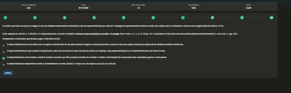 <p>Prova Nota 10 10/0 10,00 2,00 85575680 10 3 4 5 6 7 1 Os motivos que levam uma pessoa aengajar -se emuma atividade empreendedora tipo de que A tipologia de difere de ea motivação na abertura negócio (BAGGIO adaptado de K conceitos Revista de Tecnologia Passo 2015 Disponível Acesso 11 2023 as informações apresentadas, a necessidade tem origem na identificação de conseq criação deumanova empresa voltada para exploração de atividade econômica A oportunidade émotivado de situação de de emprego o(a) busca no uma tonte de social envolve de serviços que têmum impacto sociedade e envolve a intermediação de governo setor privado envolve de e serviços em uma empresa que já atua no D</p>