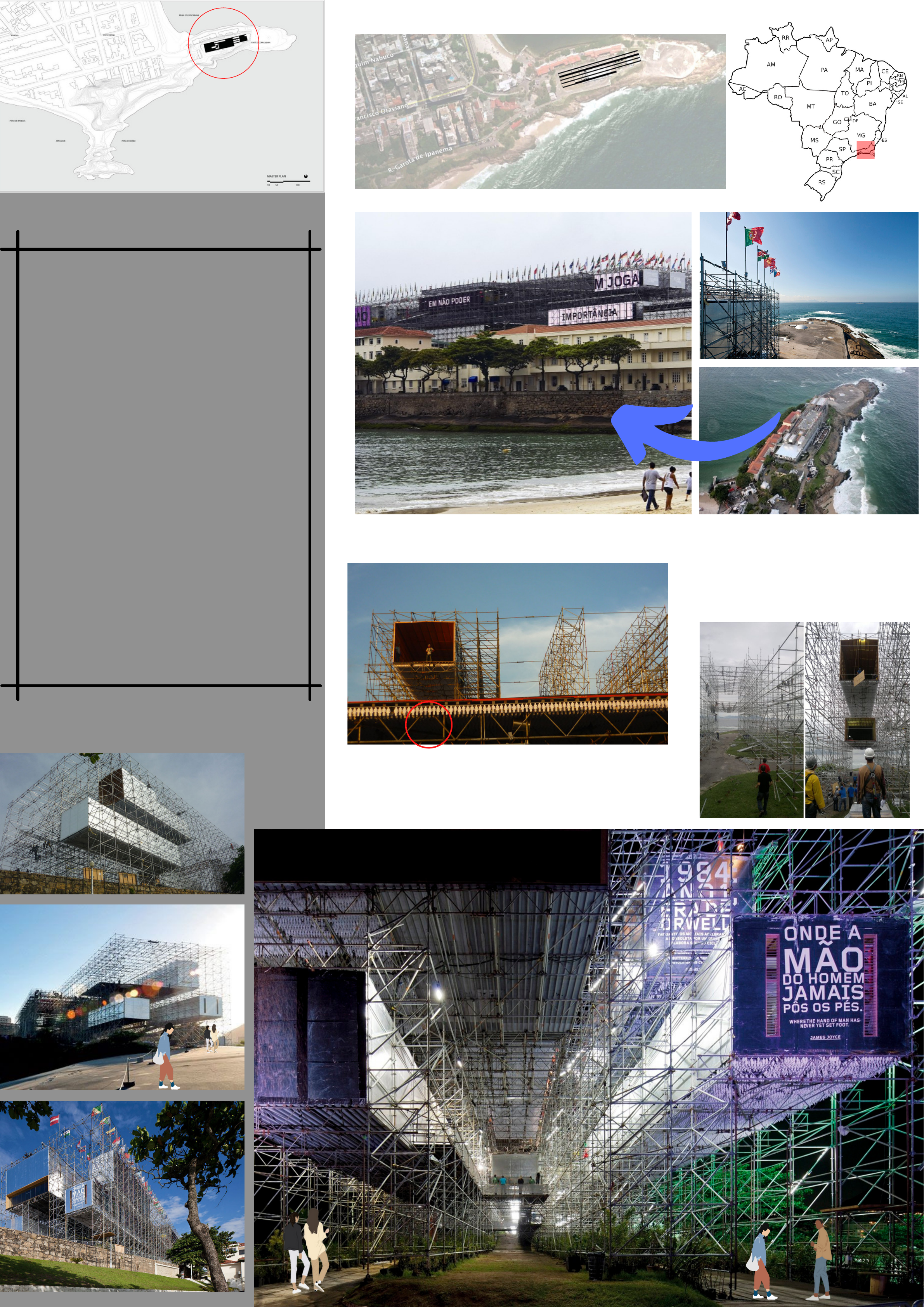 <p>HUMANIDADE</p><p>2012</p><p>Estrutura.</p><p>conceito:</p><p>Já que o evento era voltado a RIO +20, a</p><p>designer e a arquitetura não fizeram ao</p><p>relacionado a tenta e</p><p>consequentemente, não quiseram</p><p>negar a natureza. Então, elas queriam</p><p>que o pavilhão englobasse com a</p><p>natureza ao redor.</p><p>partido:</p><p>Para isso, foi pensado em um sistema</p><p>de andaimes que geraria essa sensação</p><p>de instabilidade, que no caso remetia a</p><p>instabilidade da natureza. Também os</p><p>andaimes traziam essa transparência e</p><p>essa ligação com a natureza através</p><p>dos vazios da estrutura.</p><p>LOCALIZAÇÃO.</p><p>Vista da praia de Ipanema Vista da aérea.</p><p>Planta de situação</p><p>2</p><p>1 1 1</p><p>LEGENDA:</p><p>1 Corredor de acesso à exposição.</p><p>2 Corredor para acessar a biblioteca e a sala de</p><p>conferências.</p><p>3 Corredor de acesso ao auditório.</p><p>4 Corredor de saída.</p><p>1</p><p>2</p><p>3</p><p>4</p><p>LEGENDA:</p><p>1 Salas expositivas.</p><p>2 Sala de conferência</p><p>3 Cozinha.</p><p>4 Sanitários.</p><p>5 Bar.</p><p>6 Biblioteca.</p><p>7 Palco auditório.</p><p>8 Camarim.</p><p>9 Sala de produção.</p><p>10 Estúdio de TV.</p><p>11 Rampa de saída.</p><p>12 Elevador.</p><p>4</p><p>3</p><p>6 512 7</p><p>89 12</p><p>11</p><p>10</p><p>LEGENDA:</p><p>1 Sala de exposição.</p><p>2 Biblioteca.</p><p>3 Auditório.</p><p>4 Sala de conferência.</p><p>5 Café + Pequeno auditório.</p><p>6 Banheiro.</p><p>7 Terraço.</p><p>Planta baixa - nível 0.</p><p>Planta baixa - nível 1.</p><p>Planta baixa - nível 2.</p><p>Planta baixa - nível 3.</p><p>Planta baixa - nível 4.</p>