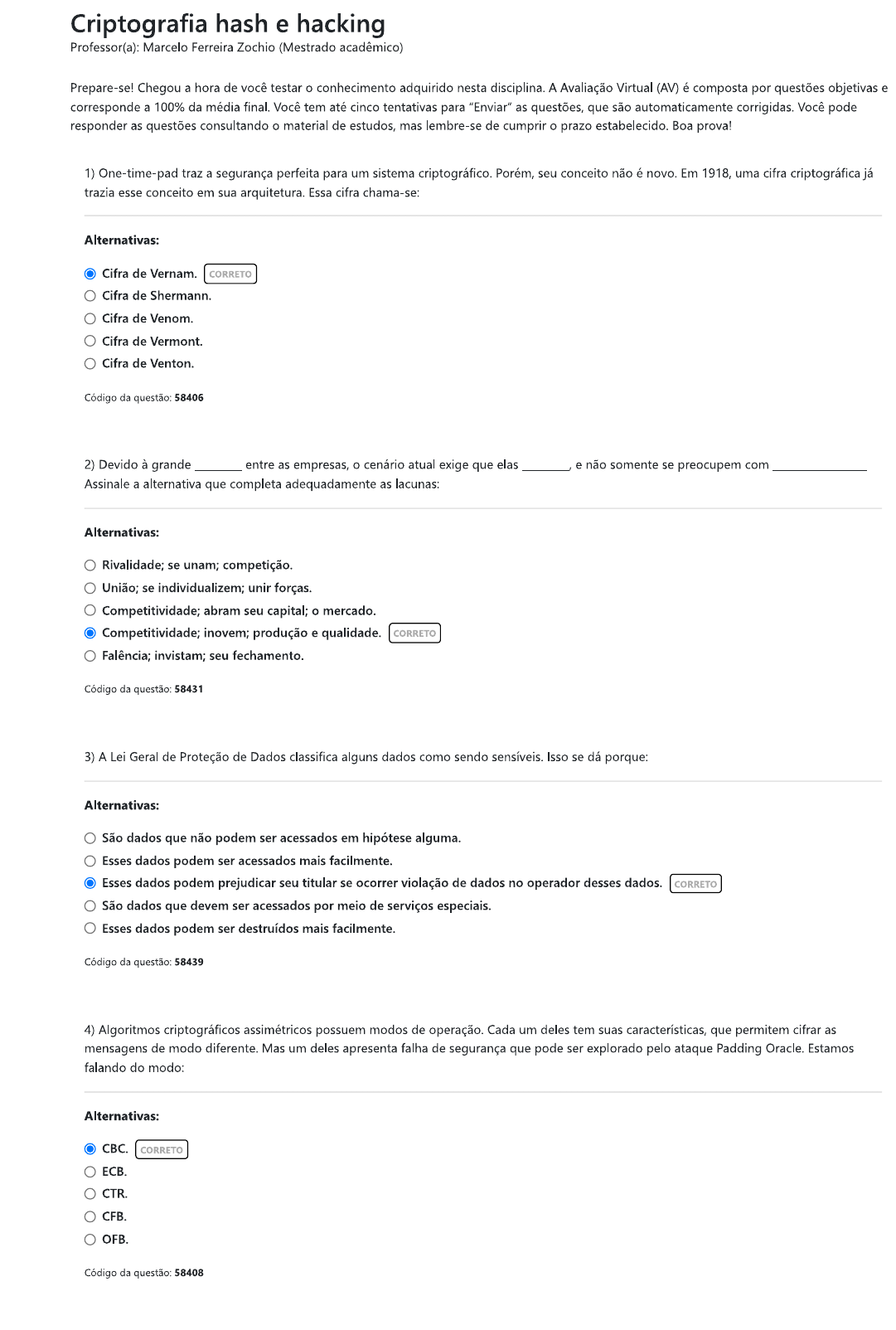 <p>Criptografia hash e hacking Professor(a): Marcelo Ferreira Zochio (Mestrado acadêmico) Prepare-se! Chegou a hora de você testar o conhecimento adquirido nesta disciplina. A Avaliação Virtual (AV) é composta por questões objetivas e corresponde a 100% da média final. Você tem até cinco tentativas para "Enviar" as questões, que são automaticamente corrigidas. Você pode responder as questões consultando o material de estudos, mas lembre-se de cumprir o prazo estabelecido. Boa prova! 1) One-time-pad traz a segurança perfeita para um sistema criptográfico. Porém, seu conceito não é novo. Em 1918, uma cifra criptográfica já trazia esse conceito em sua arquitetura. Essa cifra chama-se: Alternativas: Cifra de Vernam. CORRETO Cifra de Cifra de Venom. Cifra de Vermont. Cifra de Venton. Código da questão: 58406 2) Devido à grande entre as empresas, o cenário atual exige que elas e não somente se preocupem com Assinale a alternativa que completa adequadamente as lacunas: Alternativas: Rivalidade; se unam; competição. União; se individualizem; unir forças. Competitividade; abram seu capital; o mercado. Competitividade; inovem; produção e qualidade. CORRETO Falência; invistam; seu fechamento. Código da questão: 58431 3) A Lei Geral de Proteção de Dados classifica alguns dados como sendo Isso se dá porque: Alternativas: São dados que não podem ser acessados em hipótese alguma. Esses dados podem ser acessados mais facilmente. Esses dados podem prejudicar seu titular se ocorrer violação de dados no operador desses dados. CORRETO São dados que devem ser acessados por meio de serviços especiais. Esses dados podem ser destruídos mais facilmente. Código da questão: 58439 4) Algoritmos criptográficos assimétricos possuem modos de operação. Cada um deles tem suas características, que permitem cifrar as mensagens de modo diferente. Mas um deles apresenta falha de segurança que pode ser explorado pelo ataque Padding Oracle. Estamos falando do modo: Alternativas: CBC. CORRETO ECB. CTR. CFB. OFB. Código da questão: 58408</p><p>5) Leia e associe as duas colunas: Baiting. A. Atacante fabrica falsas situações para convencer o alvo a fornecer acesso a informações. atacante pode assumir uma identidade para fingir que é alguém de confiança da vítima. II. B. o atacante deixa ao alcance do usuário um dispositivo externo infectado com programas A intenção é despertar a curiosidade do alvo para que ele insira o dispositivo em um computador para verificar seu conteúdo. Com o arquivo malicioso instalado, o atacante tem acesso ao computador infectado. III. C. Apesar de existir há anos, ainda é muito comum devido ao alto nível de eficiência. Seu intuito é produzir comunicações falsas que podem ser entendidas como legítimas pelo alvo, por simularem confiabilidade, e conseguir informações por meio delas. Assinale a alternativa que traz a associação correta entre as duas colunas: Alternativas: - A; II C; III B. C; II III B. INCORRETO A; II B: III - C. B; A; III C. Código da questão: 58414 6) Liberdade de expressão é o direito de todo e qualquer cidadão de manifestar seu pensamento, sua opinião, atividade intelectual, artística, científica e de comunicação sem censura, como assegurado pelo artigo 5° da Constituição brasileira. Sobre este direito, podemos afirmar que: I. Ele é absoluto, ou seja, pode ser exercido independente de outras prerrogativas, pois é um direito básico de qualquer cidadão. II. Assim como todos os direitos, ele é relativo. Deve coexistir em harmonia com todos os direitos presentes na Constituição. III. Esse direito não se aplica à internet, pois ela é vigiada e pode sofrer censura. IV. Liberdade de expressão não pode ser invocada como argumento para cometer crimes tais como racismo, apologia ao crime, injúria e outros. V. Um cidadão que expressa publicamente na internet "não tolerar afrodescendentes perto de si" não pode ser processado por racismo, pois isso é enquadrado como livre expressão de pensamento, tornando qualquer ato contra tal afirmação uma censura imprópria e violação do art. 5° da Constituição brasileira. São verdadeiras: Alternativas: V. III. IV. CORRETO V. Código da questão: 58415 7) Sobre o modo de cifra CBC, considere as seguintes afirmações: Sua sigla significa cipher block chaining. É vulnerável ao ataque quadrático. É vulnerável ao ataque Padding Oracle, que usa a estrutura do banco de dados Oracle para atacar a cifra. É usado em cifras assimétricas É vulnerável ao ataque Padding Oracle, que permite testar os bytes decifrados dos blocos "perguntando ao oráculo", no caso, o servidor, se eles estão corretos ou não. Assinale a alternativa que contenha a sequência correta: Alternativas:</p><p>V-V-F-V-F CORRETO Código da questão: 58401 8) Um pentest é composto por fases em sua execução. A fase em que se coletam dados de forma não intrusiva com o objetivo de conhecer o alvo é a fase de: Alternativas: Scanning. Spying. Coleta via Nmap. Recovering. Footprint. CORRETO Código da questão: 58425 9) Sobre o profissional de testes de segurança, conhecido como pentester ou, ainda, como ethical hacker, considere as seguintes afirmações: Ele trabalha pautado na ética e na legislação de cada local onde executa suas atividades. Ele trabalha pautado apenas na legislação de cada local onde executa suas atividades. Uma de suas características é a discrição. Não precisa relatar todas as falhas que ele encontrar, apenas as que oferecem maior risco ao cliente. Precisa relatar todas as falhas que encontrar, pois isso demonstra ética em seu trabalho e honestidade em seus atos. Assinale a alternativa que contenha a sequência correta: Alternativas: CORRETO Código da questão: 58420 10) A lista dos tipos de ataque que podem ser realizados por crackers é bem extensa. Entre esses ataques, destaca-se a engenharia social. Sobre ela, assinale a alternativa corre