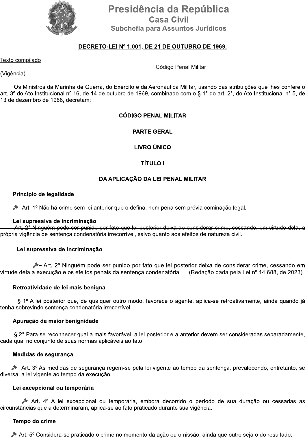 <p>Presidência da República Casa Civil Subchefia para Assuntos Jurídicos DECRETO-LEI 1.001, DE 21 DE OUTUBRO DE 1969 Texto compilado Código Penal Militar (Vigência) Os Ministros da Marinha de Guerra, do Exército e da Aeronáutica Militar, usando das atribuições que lhes confere o art. 3° do Ato Institucional 16, de 14 de outubro de 1969, combinado com o § 1° do art. do Ato Institucional n° 5, de 13 de dezembro de 1968, decretam: CÓDIGO PENAL MILITAR PARTE GERAL LIVRO ÚNICO TÍTULO DA APLICAÇÃO DA LEI PENAL MILITAR Princípio de legalidade Art. 1° Não há crime sem lei anterior que o defina, nem pena sem prévia cominação legal. Lei supressiva de incriminação Art. 2° Ninguém pode ser punido por fato que lei posterior deixa de considerar crime, em virtude dela, a própria vigência de sentença condenatória salvo quanto aos efeitos de natureza civil. Lei supressiva de incriminação Art. 2° Ninguém pode ser punido por fato que lei posterior deixa de considerar crime, cessando em virtude dela a execução e os efeitos penais da sentença condenatória. (Redação dada pela Lei n° 14.688, de 2023) Retroatividade de lei mais benigna § 1° A lei posterior que, de qualquer outro modo, favorece o agente, aplica-se retroativamente, ainda quando já tenha sobrevindo sentença condenatória Apuração da maior benignidade § 2° Para se reconhecer qual a mais favorável, a lei posterior e a anterior devem ser consideradas separadamente, cada qual no conjunto de suas normas aplicáveis ao fato. Medidas de segurança Art. 3° As medidas de segurança regem-se pela lei vigente ao tempo da sentença, prevalecendo, entretanto, se diversa, a lei vigente ao tempo da execução. Lei excepcional ou temporária Art. 4° A lei excepcional ou temporária, embora decorrido o período de sua duração ou cessadas as circunstâncias que a determinaram, aplica-se ao fato praticado durante sua vigência. Tempo do crime Art. 5° Considera-se praticado o crime no momento da ação ou omissão, ainda que outro seja o do resultado.</p><p>Lugar do crime Art. 6° Considera-se praticado o fato, no lugar em que se desenvolveu a atividade criminosa, no todo ou em parte, e ainda que sob forma de participação, bem como onde se produziu ou deveria produzir-se o resultado. Nos crimes omissivos, o fato considera-se praticado no lugar em que deveria realizar-se a ação omitida. Territorialidade, Extraterritorialidade Art. 7° Aplica-se a lei penal militar, sem prejuízo de convenções, tratados e regras de direito internacional, ao crime cometido, no todo ou em parte no território nacional, ou fora dêle, ainda que, neste caso, o agente esteja sendo processado ou tenha sido julgado pela justiça estrangeira. Território nacional por extensão § 1° Para os efeitos da lei penal militar consideram-se como extensão do território nacional as aeronaves e os navios brasileiros, onde quer que se encontrem, sob comando militar ou militarmente utilizados ou ocupados por ordem legal de autoridade competente, ainda que de propriedade privada. Ampliação a aeronaves ou navios estrangeiros § 2° É também aplicável a lei penal militar ao crime praticado a bordo de aeronaves ou navios estrangeiros, desde que em lugar sujeito à administração militar, e o crime atente contra as instituições militares. Conceito de navio § 3° Para efeito da aplicação dêste Código, considera-se navio tôda embarcação sob comando militar. Pena cumprida no estrangeiro Art. 8° A pena cumprida no estrangeiro atenua a pena imposta no Brasil pelo mesmo crime, quando diversas, ou nela é computada, quando idênticas. Crimes militares em tempo de paz Art. 9° Consideram-se crimes militares, em tempo de paz: os crimes de que trata êste Código, quando definidos de modo diverso na lei penal comum, ou nela não previstos, qualquer que seja o agente, salvo disposição especial; crimes previstos neste Código, embora também sejam com igual definição na lei penal comum, quando praticados: os crimes previstos neste Código e os previstos na legislação penal, quando praticados: (Redação dada pela Lei n° 13.491, de 2017) a) por militar em situação de atividade ou assemelhado, contra militar na mesma situação ou assemelhado; a) por militar da ativa contra militar na mesma situação; (Redação dada pela Lei n° 14.688, de 2023) b) por militar em situação de atividade ou assemelhado, em lugar sujeito à administração militar, contra militar da reserva, ou reformado, ou assemelhado, ou civil; b) por militar da ativa, em lugar sujeito à administração militar, contra militar da reserva ou reformado ou contra civil; (Redação dada pela Lei 14.688, de 2023) e) por militar em serviço, em comissão de natureza militar, ou em formatura, ainda que fora do lugar sujeito a administração militar contra militar da reserva, ou reformado, ou assemelhado, ou civil; c) por militar em serviço ou atuando em razão da função, em comissão de natureza militar, ou em formatura, ainda que fora do lugar sujeito à administração militar contra militar da reserva, ou reformado, ou civil; (Redação dada pela Lei n° 9.299, de 8.8.1996) d) por militar durante período de manobras ou contra da ou ou assemelhado, ou civil; d) por militar, durante o período de manobras ou exercício, contra militar da reserva ou reformado ou contra civil; (Redação dada pela Lei n° 14.688, de 2023)</p><p>e) por militar em de atividade, ou assemelhado, contra patrimônio sob administração militar, ou a ordem administrativa militar; e) por militar da ativa contra o patrimônio sob a administração militar ou contra a ordem administrativa militar; (Redação dada pela Lei n° 14.688, de 2023) f) por militar em situação de atividade ou assemelhado que, embora não estando em serviço, use armamento de propriedade militar ou qualquer material bélico, sob guarda, fiscalização ou administração militar, para a prática de ato ilegal; f) rev
