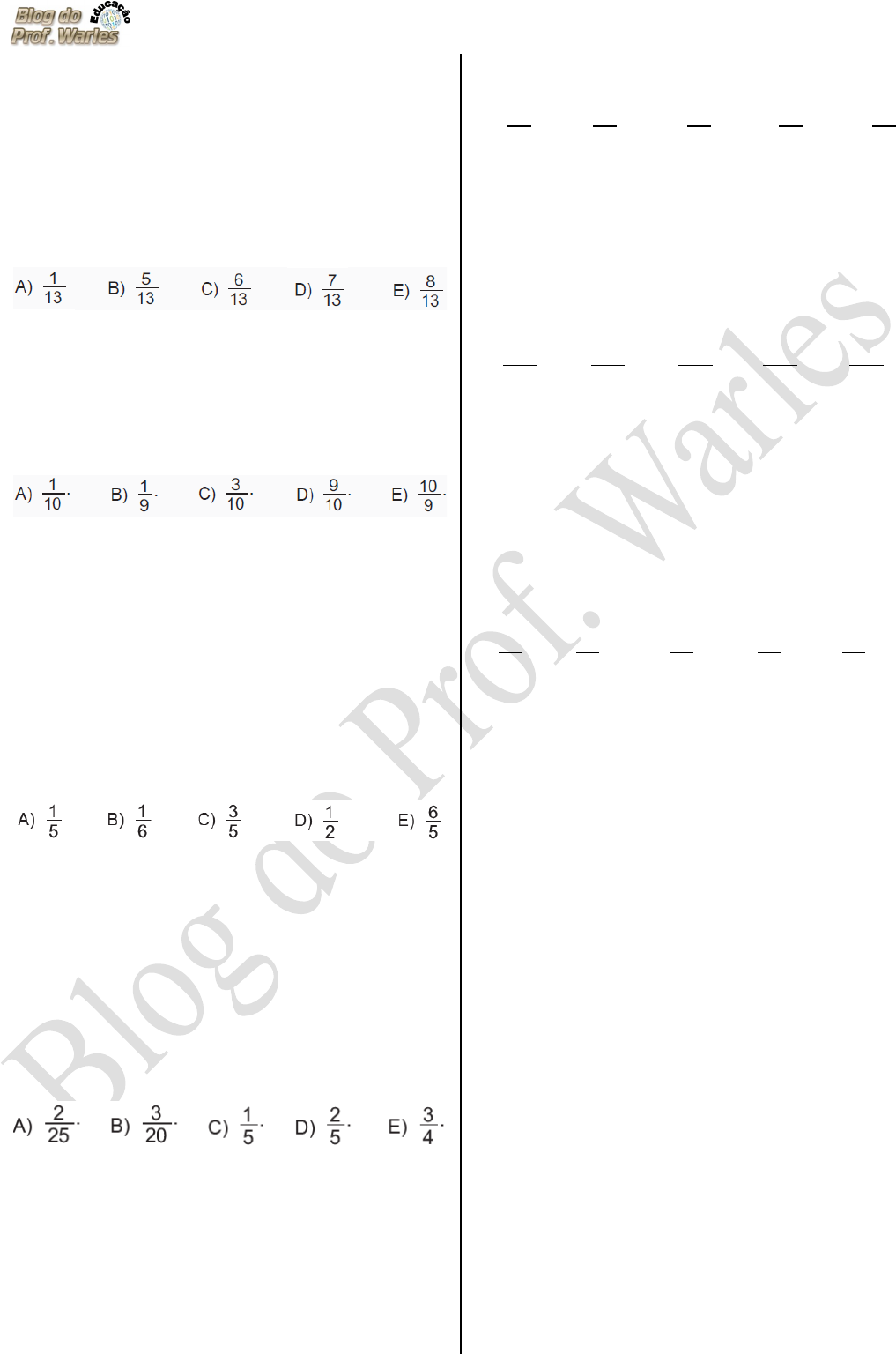 <p>D33 – Calcular a probabilidade de um evento.</p><p>-----------------------------------------------------------------------</p><p>(SAEPE). Um professor de Matemática dividiu os alunos de sua turma em 13 grupos diferentes para apresentarem um trabalho. Para determinar a ordem das apresentações dos grupos, ele colocou em uma urna 13 cartões idênticos, numerados de 1 a 13, que foram sorteados aleatoriamente.</p><p>Qual é a probabilidade do primeiro cartão retirado da urna ser um número maior que 8? (Resp. B)</p><p>-----------------------------------------------------------------------</p><p>(PAEBES). Para realizar um sorteio, Rosana vai utilizar uma urna contendo 10 bolinhas idênticas numeradas de 1 a 10.</p><p>Qual é a probabilidade de a primeira bolinha retirada por Rosana dessa urna ser a de número 3? (Resp. A)</p><p>-----------------------------------------------------------------------</p><p>(SAEPE). Em um projeto social, 500 crianças foram cadastradas para praticarem vôlei, futebol ou essas duas modalidades esportivas. Para o vôlei, foram cadastradas 200 crianças; 400 foram cadastradas para o futebol e 100 optaram pelas duas modalidades. Entre todas essas crianças, uma foi sorteada e ganhou um uniforme completo para o treino.</p><p>Sabendo que a criança sorteada está cadastrada no vôlei, qual é a probabilidade de ela também estar cadastrada no futebol? (Resp. A)</p><p>-----------------------------------------------------------------------</p><p>(SAEPE). Uma empresa realizou um processo seletivo e entrevistou um total de 200 candidatos. Um quarto dos candidatos entrevistados tem no máximo 30 anos de idade, um quinto possui curso superior e, dos que possuem curso superior, 24 têm no máximo 30 anos de idade. Escolheu-se aleatoriamente um desses candidatos. (Resp. B)</p><p>A probabilidade de esse candidato ter mais que 30 anos de idade, sendo que ele possui curso superior, é</p><p>-----------------------------------------------------------------------</p><p>(PAEBES). Um professor de Matemática dividiu os alunos de sua turma em 13 grupos diferentes para apresentarem um trabalho. Para determinar a ordem das apresentações dos grupos, ele colocou em uma urna 13 cartões idênticos, numerados de 1 a 13, que foram sorteados aleatoriamente.</p><p>Qual é a probabilidade do primeiro cartão retirado da urna ser um número maior que 8?</p><p>A) B) C) D) E)</p><p>-----------------------------------------------------------------------</p><p>(PAEBES). Uma escola tem 320 alunas e 280 alunos. O diretor dessa escola vai sortear uma bolsa de estudos integral na faculdade da cidade para um de seus alunos.</p><p>Qual é a probabilidade de uma aluna ganhar esse sorteio?</p><p>A) B) C) D) E)</p><p>-----------------------------------------------------------------------</p><p>(SPAECE). Um professor de Matemática dividiu os alunos de sua turma em 13 grupos diferentes para apresentarem um trabalho. Para determinar a ordem das apresentações dos grupos, ele colocou em uma urna 13 cartões idênticos, numerados de 1 a 13, que foram sorteados aleatoriamente.</p><p>Qual é a probabilidade do primeiro cartão retirado da urna ser um número maior que 8?</p><p>A) B) C) D) E)</p><p>-----------------------------------------------------------------------</p><p>(SPAECE). Um congresso de Medicina terá seu próximo evento realizado no Brasil. Para selecionar o estado que sediará o congresso, será realizado um sorteio entre todos os estados que se inscreveram. Dentre eles, 1 está localizado na região Norte, 3 na região Sul, 2 na região Centro-Oeste, 4 na região Sudeste e 5 estados na região Nordeste.</p><p>Qual é a probabilidade de um dos estados da região Sul sediar esse congresso?</p><p>A) B) C) D) E)</p><p>-----------------------------------------------------------------------</p><p>(SAEPB). Em um saco havia 15 bolas idênticas numeradas de 1 a 15. Uma bola foi retirada aleatoriamente.</p><p>Qual é a probabilidade da bola retirada estar marcada com um número maior que 9?</p><p>A) B) C) D) E)</p><p>-----------------------------------------------------------------------</p><p>Em uma escola, há 400 estudantes do sexo masculino e 800 do sexo feminino. Escolhendo-se ao acaso um estudante dessa escola, qual a probabilidade de ele ser do sexo feminino?</p><p>(A)</p><p>(B)</p><p>(C)</p><p>(D)</p><p>(E)</p><p>-----------------------------------------------------------------------</p><p>Uma empresa tem 16 funcionários solteiros e 14 casados. O dono dessa empresa vai sortear uma viagem para um desses funcionários.</p><p>Qual é a probabilidade de um funcionário solteiro ganhar esse sorteio?</p><p>(A) (B) (C) (D) (E)</p><p>-----------------------------------------------------------------------</p><p>Uma urna contém 100 bolas numeradas de 1 a 100. Uma bola é extraída ao acaso da urna, e seu número é observado.</p><p>A probabilidade de o número ser um quadrado perfeito é:</p><p>(A)</p><p>(B)</p><p>(C)</p><p>(D)</p><p>(E)</p><p>-----------------------------------------------------------------------</p><p>Uma urna contém 10 bolas identificadas pelas letras, A, B, ..., J. Uma bola é extraída ao acaso da urna, e sua letra é observada.</p><p>A probabilidade de a letra ser uma vogal é:</p><p>(A) 10%</p><p>(B) 5%</p><p>(C) 30 %</p><p>(D) 50%</p><p>(E) 40%</p><p>-----------------------------------------------------------------------</p><p>No lançamento de um dado, qual é a probabilidade de se obter um número par maior ou igual a 4?</p><p>(A) .</p><p>(B) .</p><p>(C) .</p><p>(D) .</p><p>(E) 1.</p><p>-----------------------------------------------------------------------</p><p>Paulo está tentando se lembrar do número de telefone de um amigo, mas não se lembra do último dígito, sabe apenas que é um número ímpar. Sendo assim, resolve escolher um dígito ímpar qualquer como último dígito e tentar ligar.</p><p>Qual a probabilidade de Paulo conseguir acertar o telefone de seu
