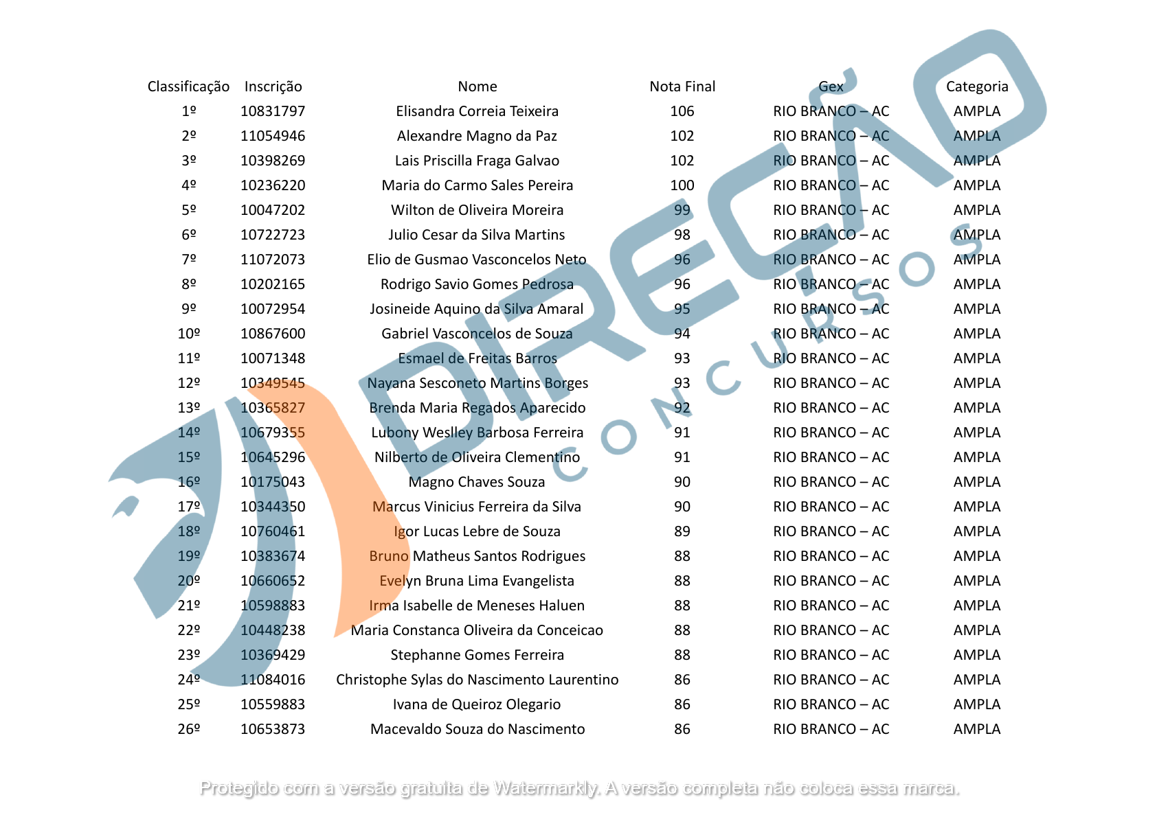 <p>Classificação Inscrição Nome Nota Final Gex Categoria</p><p>1º 10831797 Elisandra Correia Teixeira 106 RIO BRANCO – AC AMPLA</p><p>2º 11054946 Alexandre Magno da Paz 102 RIO BRANCO – AC AMPLA</p><p>3º 10398269 Lais Priscilla Fraga Galvao 102 RIO BRANCO – AC AMPLA</p><p>4º 10236220 Maria do Carmo Sales Pereira 100 RIO BRANCO – AC AMPLA</p><p>5º 10047202 Wilton de Oliveira Moreira 99 RIO BRANCO – AC AMPLA</p><p>6º 10722723 Julio Cesar da Silva Martins 98 RIO BRANCO – AC AMPLA</p><p>7º 11072073 Elio de Gusmao Vasconcelos Neto 96 RIO BRANCO – AC AMPLA</p><p>8º 10202165 Rodrigo Savio Gomes Pedrosa 96 RIO BRANCO – AC AMPLA</p><p>9º 10072954 Josineide Aquino da Silva Amaral 95 RIO BRANCO – AC AMPLA</p><p>10º 10867600 Gabriel Vasconcelos de Souza 94 RIO BRANCO – AC AMPLA</p><p>11º 10071348 Esmael de Freitas Barros 93 RIO BRANCO – AC AMPLA</p><p>12º 10349545 Nayana Sesconeto Martins Borges 93 RIO BRANCO – AC AMPLA</p><p>13º 10365827 Brenda Maria Regados Aparecido 92 RIO BRANCO – AC AMPLA</p><p>14º 10679355 Lubony Weslley Barbosa Ferreira 91 RIO BRANCO – AC AMPLA</p><p>15º 10645296 Nilberto de Oliveira Clementino 91 RIO BRANCO – AC AMPLA</p><p>16º 10175043 Magno Chaves Souza 90 RIO BRANCO – AC AMPLA</p><p>17º 10344350 Marcus Vinicius Ferreira da Silva 90 RIO BRANCO – AC AMPLA</p><p>18º 10760461 Igor Lucas Lebre de Souza 89 RIO BRANCO – AC AMPLA</p><p>19º 10383674 Bruno Matheus Santos Rodrigues 88 RIO BRANCO – AC AMPLA</p><p>20º 10660652 Evelyn Bruna Lima Evangelista 88 RIO BRANCO – AC AMPLA</p><p>21º 10598883 Irma Isabelle de Meneses Haluen 88 RIO BRANCO – AC AMPLA</p><p>22º 10448238 Maria Constanca Oliveira da Conceicao 88 RIO BRANCO – AC AMPLA</p><p>23º 10369429 Stephanne Gomes Ferreira 88 RIO BRANCO – AC AMPLA</p><p>24º 11084016 Christophe Sylas do Nascimento Laurentino 86 RIO BRANCO – AC AMPLA</p><p>25º 10559883 Ivana de Queiroz Olegario 86 RIO BRANCO – AC AMPLA</p><p>26º 10653873 Macevaldo Souza do Nascimento 86 RIO BRANCO – AC AMPLA</p><p>27º 10916823 Mackdowgla Costa da Silva 86 RIO BRANCO – AC AMPLA</p><p>28º 10369322 Sheilly Raquelly Prado de Paula 86 RIO BRANCO – AC AMPLA</p><p>1º 11369570 Douglas Fernando Carvalho Sol 84 RIO BRANCO – AC PCD</p><p>2º 11038271 Eurimar Araujo de Lima 75 RIO BRANCO – AC PCD</p><p>1º 10236220 Maria do Carmo Sales Pereira 100 RIO BRANCO – AC NEGROS</p><p>2º 10047202 Wilton de Oliveira Moreira 99 RIO BRANCO – AC NEGROS</p><p>3º 11072073 Elio de Gusmao Vasconcelos Neto 96 RIO BRANCO – AC NEGROS</p><p>4º 10175043 Magno Chaves Souza 90 RIO BRANCO – AC NEGROS</p><p>5º 11084016 Christophe Sylas do Nascimento Laurentino 86 RIO BRANCO – AC NEGROS</p><p>6º 10653873 Macevaldo Souza do Nascimento 86 RIO BRANCO – AC NEGROS</p><p>7º 10916823 Mackdowgla Costa da Silva 86 RIO BRANCO – AC NEGROS</p><p>8º 11369570 Douglas Fernando Carvalho Sol 84 RIO BRANCO – AC NEGROS</p><p>9º 10253492 Joao Paulo Batista de Freitas 82 RIO BRANCO – AC NEGROS</p><p>10º 11068653 Gerciane Costa de Souza 80 RIO BRANCO – AC NEGROS</p><p>11º 10108767 Larissa Batista Leite 80 RIO BRANCO – AC NEGROS</p><p>12º 10762638 Marcos da Silva Melo 79 RIO BRANCO – AC NEGROS</p><p>13º 10295031 Mayara Suellen Araujo Casara Vidal 79 RIO BRANCO – AC NEGROS</p><p>1º 10679082 Joao Victor de Souza Vieira 110 MACEIÓ – AL AMPLA</p><p>2º 10247309 Thaynara Andrade Aguiar 109 MACEIÓ – AL AMPLA</p><p>3º 10958784 Arielle Ribeiro Bezerra 108 MACEIÓ – AL AMPLA</p><p>4º 10743686 Samuel Ferreira da Silva Rocha 107 MACEIÓ – AL AMPLA</p><p>5º 10778155 Cristiano Gomes Figueiredo 106 MACEIÓ – AL AMPLA</p><p>6º 10271895 Sirlene Souza Silva 105 MACEIÓ – AL AMPLA</p><p>7º 10263663 Lauriany Maria Ferreira Araujo 104 MACEIÓ – AL AMPLA</p><p>8º 10781853 Gustavo Paffer Cruz de Gusmao 102 MACEIÓ – AL AMPLA</p><p>9º 10498596 Joalan Klinger da Silva 102 MACEIÓ – AL AMPLA</p><p>10º 10256561 Maria Adriana da Cunha Franca 102 MACEIÓ – AL AMPLA</p><p>11º 10207640 Carlos Andre da Silva Ferreira 101 MACEIÓ – AL AMPLA</p><p>12º 10791923 Maxwell Valdivino Vicente 101 MACEIÓ – AL AMPLA</p><p>13º 10283932 Fabiana Ramalho dos Santos 100 MACEIÓ – AL AMPLA</p><p>14º 10207497 Hayde Saldanha de Oliveira Neta 100 MACEIÓ – AL AMPLA</p><p>15º 10765200 Marcos Antonio da Silva 100 MACEIÓ – AL AMPLA</p><p>16º 10141712 Nathalia Del Rio Silva 100 MACEIÓ – AL AMPLA</p><p>17º 11156693 Paula Marques Fernandes 100 MACEIÓ – AL AMPLA</p><p>18º 10478918 Alessandro Duarte Lins Guerrera 99 MACEIÓ – AL AMPLA</p><p>19º 10274405 David Rafael Santana Sacramento 99 MACEIÓ – AL AMPLA</p><p>20º 10263612 Heberton Luig Lima Feitoza 99 MACEIÓ – AL AMPLA</p><p>21º 10446772 Kamilla Mariana Chagas 99 MACEIÓ – AL AMPLA</p><p>22º 10233052 Rodrigo Henrique de Oliveira Silva 99 MACEIÓ – AL AMPLA</p><p>23º 10038758 Bruno Batolomeu da Silva Sena 98 MACEIÓ – AL AMPLA</p><p>24º 10495742 Felipe Rocha Pinto 98 MACEIÓ – AL AMPLA</p><p>25º 10653381 Israel Silva da Conceicao 98 MACEIÓ – AL AMPLA</p><p>26º 10056236 Joao Guilherme Cordeiro Acioli 98 MACEIÓ – AL AMPLA</p><p>27º 10186561 Luiz Emanuel de Araujo Oliveira 98 MACEIÓ – AL AMPLA</p><p>28º 10001963 Rhayssa Germanna Silva Higino 98 MACEIÓ – AL AMPLA</p><p>29º 10690240 Iara Kelly de Moura Correia 97 MACEIÓ – AL AMPLA</p><p>30º 10521584 Jose Marcondes de Araujo 97 MACEIÓ – AL AMPLA</p><p>31º 10260530 Maria Betania Lopes do Nascimento 97 MACEIÓ – AL AMPLA</p><p>32º 10287711 Michel Santos Silva 97 MACEIÓ – AL AMPLA</p><p>33º 10454260 Eliezer de Melo Korevaar 96 MACEIÓ – AL AMPLA</p><p>34º 10218310 Erik Morais do Nascimento 96 MACEIÓ – AL AMPLA</p><p>35º 10984362 Isaac Rafael Laurindo da Conceicao 96 MACEIÓ – AL AMPLA</p><p>36º 10995115 Jackson Santos da Silva 96 MACEIÓ – AL AMPLA</p><p>37º 10667973 Leonardo Barros Leite 96 MACEIÓ – AL AMPLA</p><p>38º 10259740 Marcio L