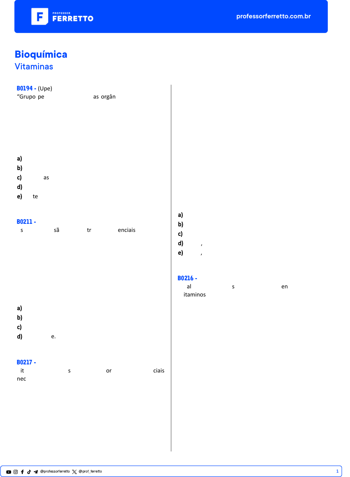 <p>1@professorferretto @prof_ferretto</p><p>Bioquímica</p><p>Vitaminas</p><p>B0194 - (Upe)</p><p>“Grupo peculiar de substâncias orgânicas indispensáveis</p><p>ao organismo, apesar de necessárias em quan�dades</p><p>rela�vamente pequenas, com função reguladora. Em</p><p>geral, não são fabricadas em nosso corpo e são ob�das</p><p>através da alimentação. São absorvidas no intes�no,</p><p>dissolvidas em água ou em gorduras.” O texto refere-se a</p><p>a) Oligossacarídeos.</p><p>b) Dipep�deos.</p><p>c) Vitaminas.</p><p>d) Lipídios.</p><p>e) Proteínas.</p><p>B0211 - (Unp)</p><p>As vitaminas são micronutrientes essenciais em nossa</p><p>dieta. Elas podem ser classificadas em dois grupos,</p><p>hidrossolúveis e lipossolúveis. No grupo das</p><p>hidrossolúveis temos a vitamina C e as vitaminas do</p><p>complexo B, que podem, em alguns processos biológicos,</p><p>desempenhar função de coenzima. A carência de</p><p>vitaminas do complexo B pode provocar algumas</p><p>enfermidades. Qual das doenças abaixo pode ser</p><p>decorrente de carência de vitaminas do complexo B?</p><p>a) Beribéri.</p><p>b) Raqui�smo.</p><p>c) Xero�almia.</p><p>d) Esterilidade.</p><p>B0217 - (Facisa)</p><p>Vitaminas são substâncias orgânicas essenciais</p><p>necessárias em pequenas quan�dades para as a�vidades</p><p>metabólicas do organismo humano e que não são</p><p>produzidas por ele. A ingestão insuficiente de vitaminas</p><p>pode causar as chamadas avitaminoses/hipovitaminoses.</p><p>Sintomas das avitaminoses/hipovitaminoses abaixo são</p><p>provocadas pela deficiência na ingestão das vitaminas.</p><p>Após a análise das sentenças a seguir, estabeleça a</p><p>associação correta:</p><p>1. Problemas nos dentes, ossos fracos contribuem para o</p><p>raqui�smo.</p><p>2. Hemorragias</p><p>3. Doenças da pele, distúrbios nervosos, inércia e</p><p>extrema apa�a.</p><p>4. Perda de ape�te, fadiga muscular, nervosismo.</p><p>5. Anemia perniciosa, distúrbios nervosos.</p><p>(_) vitamina D</p><p>(_) vitamina K</p><p>(_) vitamina B6</p><p>(_) vitamina B1</p><p>(_) vitamina B12</p><p>A sequência correta de associação e:</p><p>a) 2, 3, 4, 5, 1.</p><p>b) 1, 3, 2, 4, 5.</p><p>c) 1, 2, 3, 4, 5.</p><p>d) 2, 5, 1, 3, 4.</p><p>e) 1, 2, 5, 3, 4.</p><p>B0216 - (Ufpr)</p><p>A falta de vitaminas pode causar doenças chamadas</p><p>avitaminoses, cujos sintomas dependem do �po de</p><p>vitamina que está deficiente. Em um estudo realizado em</p><p>diferentes populações humanas, foram constatados os</p><p>seguintes sintomas e doenças relacionados a</p><p>avitaminoses: (1) raqui�smo, (2) escorbuto, (3)</p><p>hemorragias e (4) cegueira noturna. Assinale a alterna�va</p><p>com a dieta correta para o tratamento de cada uma das</p><p>quatro avitaminoses acima iden�ficadas.</p><p>2@professorferretto @prof_ferretto</p><p>a) (1) cenoura, abóbora e �gado como fontes de vitamina</p><p>D. – (2) frutas cítricas como fontes de vitamina C. – (3)</p><p>peixe como fonte de vitamina A. – (4) vegetais com</p><p>folhas verdes como fontes de vitamina K.</p><p>b) (1) peixe, leite e gema de ovo como fontes de vitamina</p><p>D. – (2) frutas cítricas como fontes de vitamina C. – (3)</p><p>vegetais com folhas verdes como fonte de vitamina K.</p><p>– (4) abóbora, �gado e cenoura como fontes de</p><p>vitamina A.</p><p>c) (1) peixe, leite e gema de ovo como fonte de vitamina</p><p>K. – (2) frutas cítricas como fontes de vitamina A. – (3)</p><p>vegetais com folhas verdes como fonte de vitamina D.</p><p>– (4) cenoura, abóbora e �gado como fonte de</p><p>vitamina C.</p><p>d) (1) cenoura, abóbora e �gado como fontes de</p><p>vitamina D. – (2) peixe, leite e gema de ovo como</p><p>fontes de vitamina K. – (3) vegetais com folhas verdes</p><p>como fonte de vitamina A. – (4) frutas cítricas como</p><p>fontes de vitamina C.</p><p>e) (1) vegetais com folhas verdes como fonte de vitamina</p><p>D. – (2) cenoura, abóbora e �gado como fontes de</p><p>vitamina C. – (3) frutas cítricas como fontes de</p><p>vitamina K. – (4) peixe, leite e gema de ovo como</p><p>fontes de vitamina A.</p><p>B0204 - (Upe)</p><p>BEBÊ ANENCÉFALO COMPLETA NOVE MESES E ESTÁ BEM</p><p>DE SAÚDE</p><p>(...) Superando todas as expecta�vas médicas, a menina</p><p>M. de J. F. chegou ao seu nono mês de vida. Ela nasceu</p><p>portadora de anencefalia. Ao nascer, segundo os</p><p>médicos, a garo�nha teria apenas algumas horas de vida,</p><p>mas ela con�nua crescendo e se desenvolvendo (...)</p><p>Fonte: CN No�cias – Patrocínio Paulista,</p><p>SPno�cias.cancaonova.com/no�cia.LucianoBa�sta (...)</p><p>Anencefalia é uma desordem cerebral, que resulta de</p><p>defeito no tubo neural... Acredita-se que a dieta da mãe e</p><p>sua ingestão de vitaminas possam ter alguma influência.</p><p>Estudos recentes têm mostrado que a suplementação de</p><p>vitamina _____ ou _____ na dieta da mulher em idade</p><p>reprodu�va possa reduzir significa�vamente a incidência</p><p>de defeitos no tubo neural (...).</p><p>Fonte: www.revistaneurociencias.com.br/edicoes/2010.</p><p>Assinale a alterna�va que preenche corretamente as</p><p>lacunas que contêm a vitamina envolvida na formação do</p><p>tubo neural.</p><p>a) Vitamina A ou re�nol.</p><p>b) Vitamina B3 ou niacina.</p><p>c) Vitamina B5 ou ácido pantotênico.</p><p>d) Vitamina B9 ou ácido fólico.</p><p>e) Vitamina C ou ácido ascórbico.</p><p>B0198 - (Enem)</p><p>A obesidade, que nos países desenvolvidos já é tratada</p><p>como epidemia, começa a preocupar especialistas no</p><p>Brasil. Os úl�mos dados da Pesquisa de Orçamentos</p><p>Familiares, realizada entre 2002 e 2003 pelo IBGE,</p><p>mostram que 40,6% da população brasileira estão acima</p><p>do peso, ou seja, 38,8 milhões de adultos. Desse total,</p><p>10,5 milhões são considerados obesos. Várias são as</p><p>dietas e os remédios que prometem