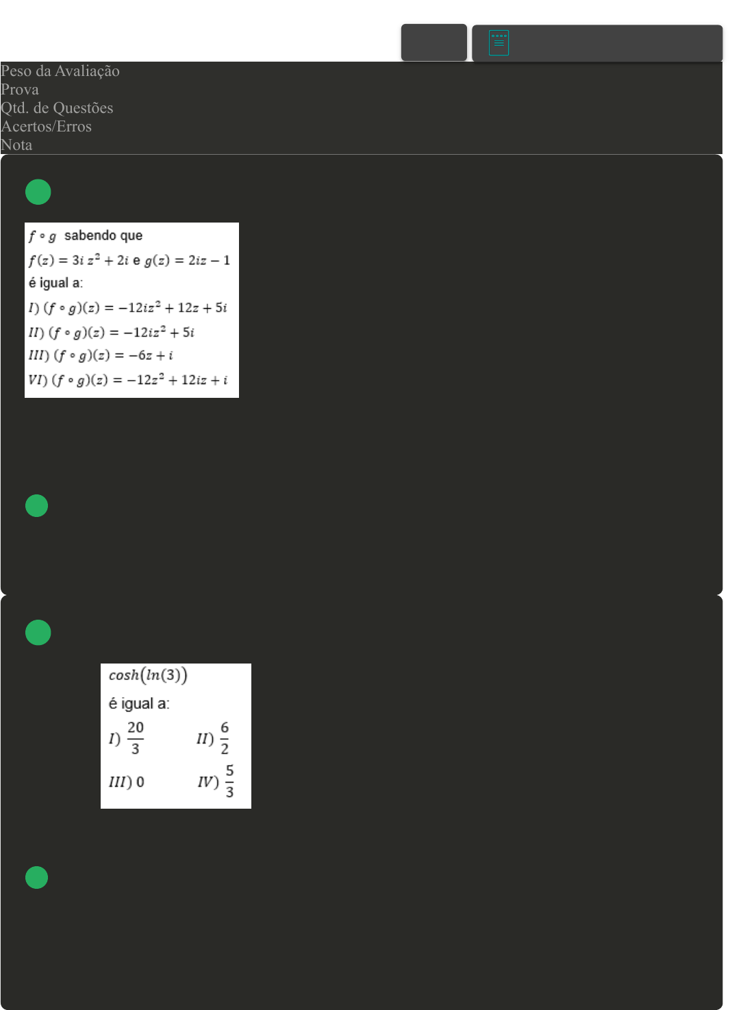 <p>Prova Impressa</p><p>GABARITO | Avaliação I - Individual (Cod.:992164)</p><p>Peso da Avaliação 2,00</p><p>Prova 85337802</p><p>Qtd. de Questões 10</p><p>Acertos/Erros 10/0</p><p>Nota 10,00</p><p>Da mesma maneira que fazemos a composição de duas funções com variáveis reais, podemos</p><p>também fazer a composição de duas funções com variáveis complexas. Então a composição</p><p>A Somente a opção IV está correta.</p><p>B Somente a opção II está correta.</p><p>C Somente a opção I está correta.</p><p>D Somente a opção III está correta.</p><p>A fórmula de Euler permite reescrever as funções trigonométricas e trigonométricas hiperbólicas</p><p>como soma de funções exponenciais. Utilizando a representação na forma exponencial, podemos</p><p>afirmar que</p><p>A Somente a opção II está correta.</p><p>B Somente a opção IV está correta.</p><p>C Somente a opção III está correta.</p><p>D Somente a opção I está correta.</p><p>VOLTAR</p><p>A+ Alterar modo de visualização</p><p>1</p><p>2</p><p>Uma função é contínua se satisfaz três condições, estar definida em todos pontos, o limite existir</p><p>para todos os pontos e o limite ser igual ao valor da função. A função</p><p>A Somente a opção I está correta.</p><p>B Somente a opção III está correta.</p><p>C Somente a opção II está correta.</p><p>D Somente a opção IV está correta.</p><p>Sabendo a forma algébrica de um número complexo, podemos reescrevê-lo também na forma</p><p>trigonométrica. A forma trigonométrica do número complexos</p><p>A Somente a opção IV está correta.</p><p>B Somente a opção II está correta.</p><p>C Somente a opção I está correta.</p><p>D Somente a opção III está correta.</p><p>3</p><p>4</p><p>Para resolver divisões entre números complexos, utiliza-se de uma estratégia algébrica que possui o</p><p>nome de conjugado.</p><p>Coniderando a forma de determiná-lo, assinale a alternativa CORRETA:</p><p>A Subtraindo pela parte imaginária.</p><p>B Dividindo pela parte imaginária.</p><p>C Trocar o sinal da parte imaginária.</p><p>D Multiplicar pela parte imaginária.</p><p>Utilizando as propriedades de limite de funções complexas, temos que o limite</p><p>A Somente a opção I está correta.</p><p>B Somente a opção III está correta.</p><p>C Somente a opção IV está correta.</p><p>D Somente a opção II está correta.</p><p>O número complexo i é definido como sendo a raiz quadrada de - 1, sabemos que no conjunto</p><p>dos números reais essa raiz quadrada não tem solução, por isso a necessidade de aumentarmos o</p><p>conjunto dos números reais. Determine as raízes da equação do segundo grau x² - 4x + 5 = 0 e</p><p>assinale a alternativa CORRETA:</p><p>A As raízes são 1 e 3.</p><p>B As raízes são - 2 + i e - 2 - i.</p><p>C As raízes são - 1 e - 3.</p><p>D As raízes são 2 + i e 2 - i.</p><p>5</p><p>6</p><p>7</p><p>Uma função é contínua se satisfaz três condições, estar definida em todos pontos, o limite existir</p><p>para todos os pontos e o limite ser igual ao valor da função. A função</p><p>A Somente a opção I está correta.</p><p>B Somente a opção III está correta.</p><p>C Somente a opção IV está correta.</p><p>D Somente a opção II está correta.</p><p>Utilizando as propriedades de operações de números complexos escritos na forma complexa,</p><p>calcule o valor de 2z + 3iw, sabendo que z = - 2 + i e w = 3 + 2i. Não esqueça que i² = - 1.</p><p>A 10 - 11i.</p><p>B 2 + 11i.</p><p>C - 10 + 11i.</p><p>D 2 - 7i.</p><p>O conjunto dos números complexos foi criado com o intuito de resolver equações que envolvem</p><p>raízes de números negativos.</p><p>Qual a denotação que representa a unidade imaginária e a dos conjuntos desses números?</p><p>A Z ; N</p><p>B Q ; i</p><p>C C ; a</p><p>D i ; C</p><p>8</p><p>9</p><p>10</p><p>Imprimir</p>