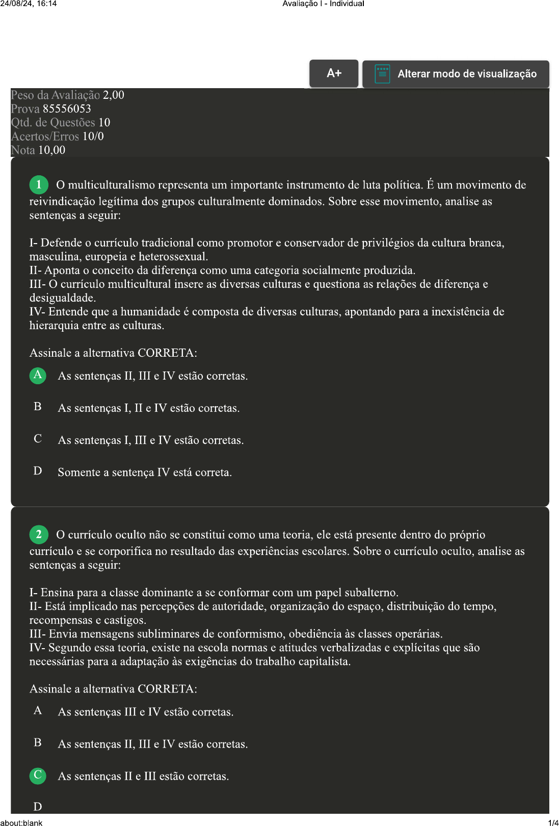 <p>24/08/24, 16:14 Avaliação Individual A+ Alterar modo de visualização Peso da Avaliação 2,00 Prova 85556053 Qtd. de Questões 10 Acertos/Erros 10/0 Nota 10,00 1 O multiculturalismo representa um importante instrumento de luta política. É um movimento de reivindicação legítima dos grupos culturalmente dominados. Sobre esse movimento, analise as sentenças a seguir: I- Defende currículo tradicional como promotor e conservador de privilégios da cultura branca, masculina, europeia e heterossexual. II- Aponta conceito da diferença como uma categoria socialmente produzida. III- O currículo multicultural insere as diversas culturas e questiona as relações de diferença e desigualdade. Entende que a humanidade é composta de diversas culturas. apontando para a inexistência de hierarquia entre as culturas. Assinale a alternativa CORRETA: A As sentenças II, III e IV estão corretas. B As sentenças I, II e IV estão corretas. C As sentenças I, III e IV estão corretas. D Somente a sentença IV está correta. 2 O currículo oculto não se constitui como uma teoria, ele está presente dentro do próprio currículo e se corporifica no resultado das experiências escolares. Sobre currículo oculto, analise as sentenças a seguir: Ensina para a classe dominante a se conformar com um papel subalterno. II- Está implicado nas percepções de autoridade, organização do espaço, distribuição do tempo, recompensas e castigos. III- Envia mensagens subliminares de conformismo. obediência às classes operárias. Segundo essa teoria, existe na escola normas e atitudes verbalizadas e explícitas que são necessárias para a adaptação às exigências do trabalho capitalista. Assinale a alternativa CORRETA: A As sentenças III e IV estão corretas. B As sentenças II, III e IV estão corretas. As sentenças II e III estão corretas. D about:blank 1/4</p><p>24/08/24 16:14 Avaliação Individual As sentenças I e IV estão corretas. 3 Sabemos que é possível verificar que currículo não é um instrumento passivo ou Ele está delineado nos documentos oficiais, nas disciplinas, no dia a dia dos professores, nas instituições de ensino, nos alunos. Sobre esse tema, assinale a alternativa CORRETA: A O currículo está permeado de relações de poder de disputa, de verdades e de diferentes atuações e opiniões de um grupo social. B O currículo está permeado de relações de disputas, de inverdades e de diferentes significados de um grupo social. O currículo está permeado de relações de poder, de verdades e de diferentes significados de um grupo social. D O currículo está permeado de relações de poder, de verdades e de indiferentes significados de um grupo cultural. 4 Paulo Reglus Neves Freire nasceu em Recife em 1921 e faleceu em Foi um importante educador brasileiro, cujas obras, apesar de não terem desenvolvido uma teorização sobre têm implicações importantes para essa teorização. Sobre quais são os dois principais questionamentos dos quais parte Paulo Freire, assinale a alternativa CORRETA: A O que é crescer e que significa aprender. B O que é ensinar e que significa conhecer. C O que é falar e que significa crescer. D O que é descobrir e que significa desvendar. 5 No século XIX, a escola pública foi criada pelos privilegiados para atender à massa. Nos Estados Unidos, essa instituição era dirigida pelo Estado e teve que atender ao grande número de imigrantes (POPKEWITZ, 1997). Sobre a escola de massa, analise as sentenças a seguir: I- Foi também uma alternativa para a redução do crime e dos conflitos, a fim de introduzir a tranquilidade interna nas cidades. II- A filosofia da escola americana dessa época teve a razão e a racionalidade como alavancas para progresso. III- Seus currículos eram profundamente americanos e visavam ao individualismo. IV- Fez críticas à memorização e contra método do aprender fazendo. Assinale a alternativa CORRETA: FONTE: Thomas Reforma educacional: uma política sociológica: poder e conhecimento em educação. Porto Alegre: Artes Médicas, 1997. A As sentenças I, II e IV estão corretas. about:blank 2/4</p><p>24/08/24, 16:14 Avaliação Individual B As sentenças III e IV estão corretas. C As sentenças I, II e III estão corretas. D As sentenças II, III e IV estão corretas. 6 O nosso sistema educativo/social. conforme Sacristán (2000), está dividido em oito subsistemas, nos quais se expressam as práticas relacionadas ao currículo. Há um subsistema que é constituído de formadores, especialistas e pesquisadores em educação. Esses profissionais criam os conceitos, sistematizam as informações, criam linguagens e produzem conhecimentos sobre a realidade educativa para distribuir a prática curricular e as formas de realizá-la. Com base no exposto, assinale a alternativa CORRETA que indica subsistema mencionado: FONTE: O Currículo: uma reflexão sobre a prática. 3. ed. Porto Alegre: Artmed, 2000 A Subsistema prático-pedagógico. B Subsistema de participação e de controle. C Subsistema de inovação. D Subsistema técnico-pedagógico. 7 Existe uma teoria que surgiu na Alemanha no século XIX. Ela pretendia conduzir a humanidade a uma organização social sem classes, sem explorados nem exploradores. Sobre qual é essa teoria, assinale a alternativa CORRETA: A Marxismo. B Iluminismo. C Evolucionismo. D Materialismo. 8 O conceito de currículo e a sua construção são fatores que influenciam a qualidade educacional e a formação de alunos e professores, pois currículo permeia aspectos importantes. Com base no exposto, assinale a alternativa CORRETA que contempla todos esses aspectos: A O que ensinar e como ensinar. B O que ensinar, como ensinar, por que ensinar e quando avaliar. about:blank 3/4</p><p>24/08/24, 16:14 Avaliação - Individual C Como ensinar e por que ensinar. D Como ensinar, por que ensinar e quando avaliar. 9 Em certo nível de decisão curricular, ocorre contexto da ação educativa 