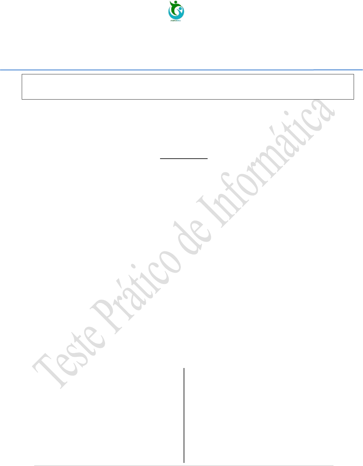 <p>Governo Distrital de Massinga</p><p>Associação para a Promoção de Agronegócio e do Empreendedorismo para Jovens AGROEMJ - Massinga</p><p>SECRETARIA SEDE-AGROEMJ</p><p>DEPARTAMENTO DE INFORMÁTICA</p><p>1º Teste Prática de Informática Básica (Word)</p><p>Este teste contem 4 perguntas Práticos para efeito de avaliação. O mesmo é uma chance para reflitir sobre como podemos moldar um futuro digital mais justo e aberto. “A informatica basica não se trata apenas de aprender a usar ferramentas, é sobre entender o poder e a ética por trás do software que controla nossa vida digital. “ Don Norman””</p><p>1. Crie uma pasta no Ambiente do Trabalho com o seu Teste - Nome Completo. (1 val)</p><p>a) Crie um documento no Word e digite o Texto1 veja abaixo o texto utilize a mesma formatação que você está vendo no papel, após digitado salve o seu documento com o nome Exercício1, dentro da pasta criada anteriormente. (2 val)</p><p>Texto 1</p><p>Coisas da Vida</p><p>A sabedoria não se encontra no topo de nenhuma montanha nem no último ano de um curso superior. É num pequeno monte de areia do recreio do jardim-de-infância que se pode aprender tudo o que é necessário na vida:</p><p>· Partilhar</p><p>· Respeitar as regras do jogo</p><p>· Não bater em ninguém</p><p>· Guardar as coisas nos sítios onde estavam</p><p>· Manter tudo sempre limpo</p><p>· Não mexer nas coisas dos outros</p><p>· Pedir desculpa quando se magoa alguém</p><p>· Viver uma vida equilibrada: estudar, pensar, desenhar, pintar, cantar, dançar, brincar,</p><p>· Trabalhar, fazer de tudo um pouco, todos os dias.</p><p>Robert Fulghum</p><p>Exercício 2</p><p>2. Crie um novo documento no Word com o seguinte texto Texto 2 (Objectivo: Colunas) (6 val)</p><p>N</p><p>Av. Acordos de Lusaka, Bairo 21 de Abril - Massinga • Telel. +25 87 695 1206 • Whatsapp +258 85 201 7590 • e-mail: agroemj@gmail.com • http://agroemj.co.mz</p><p>as Ilhas de Salomão, no Pacífico Sul, os nativos descobriram um estranho método de derrubar árvores. Se houver um tronco suficientemente grosso para se cortar com um machado, cortam-no aos gritos. Lenhadores dotados de poderes misteriosos sobem de manhãzinha a uma árvore e, de repente, põem-se aos berros. E continuam a fazê-lo durante trinta e seis dias consecutivos.</p><p>A árvore morre e acaba por cair por terra. A explicação, dizem eles, é que, com tamanha gritaria matam o espírito da árvore. Garantem que o método nunca falha. .......................................... … é possível que os nativos das ilhas Salomão tenham feito uma grande descoberta: os seres vivos em geral, pessoas ou árvores, são extremamente sensíveis aos gritos. O grito pode acabar por matar o espírito que habita em cada ser vivo. Com paus e pedras podemos partir ossos, mas com palavras partimos os corações.</p><p>b) Guarde o documento com o nome Exercício2, dentro da pasta Exercícios de Word.</p><p>Exercício 3</p><p>3. Crie um documento no Word com a seguinte tabela: (1,5 val)</p><p>Informática Básico</p><p>Alunos</p><p>Número</p><p>Nome</p><p>Português</p><p>Matemática</p><p>Informática</p><p>01</p><p>Ana Castro</p><p>10</p><p>10</p><p>19</p><p>02</p><p>Sandra Neves</p><p>12</p><p>12</p><p>15</p><p>03</p><p>António Maia</p><p>14</p><p>10</p><p>17</p><p>04</p><p>Rui Victor</p><p>11</p><p>11</p><p>15</p><p>05</p><p>Carlos Silva</p><p>15</p><p>14</p><p>12</p><p>06</p><p>Nuno Rodrigo</p><p>12</p><p>15</p><p>11</p><p>07</p><p>Daniela Lopes</p><p>15</p><p>13</p><p>10</p><p>08</p><p>José Pinto</p><p>18</p><p>12</p><p>11</p><p>09</p><p>Helena Cunha</p><p>14</p><p>11</p><p>15</p><p>10</p><p>Joana Nunes</p><p>10</p><p>12</p><p>11</p><p>a) Insira uma nova coluna para incluir notas de outra disciplina e mais duas linhas para incluir dois novos alunos. (1,5 val)</p><p>b) Guarde o documento na directoria Seu Nome Completo com o nome Exercício3. (1 val)</p><p>Exercício 4</p><p>4. Inicie o processamento de figura de ilustração</p><p>a) Utilizando os conhecimentos adquiridos, crie as ilustrações abaixo: (5 val)</p><p>b) Salve o documento em sua pasta criada em 1 com o nome Exercicio 4</p><p>NB: Lembre-se de todas as regras no que diz respeito as margen do documento, e use a mesma formatação usado no teste (Fonte: Times New Roman, Tamanho: 12, Alinhamento: Justificado e espaçamento: 1.5).</p><p>PARABÉNS, agora tudo depende de você</p><p>Formador: António Zefanias Cumbane</p><p>Cobrança</p><p>Valor</p><p>Tipo de Cobrança</p><p>Cliente</p><p>Tipo de Seeviço</p><p>Data de Vecimento</p><p>Director</p><p>Gerente Financeiro</p><p>Depto A</p><p>Depto B</p><p>Gerente de Marketing</p><p>Presidente</p><p>Gerente Financeiro</p><p>Gerente de Vendas</p><p>image1.jpeg</p>