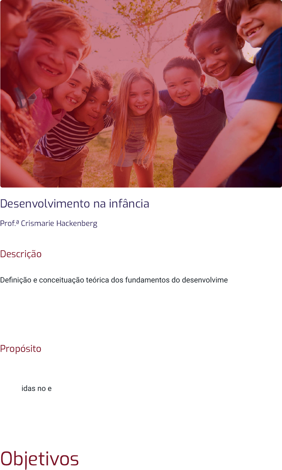 <p>Desenvolvimento na infância</p><p>Prof.ª Crismarie Hackenberg</p><p>Descrição</p><p>Definição e conceituação teórica dos fundamentos do desenvolvimento</p><p>infantil, e das transformações físicas, cognitivas, emocionais e</p><p>psicossociais envolvidas, com segmentação nos três períodos da</p><p>infância e suas faixas etárias respectivas.</p><p>Propósito</p><p>O conhecimento sobre as teorias de desenvolvimento humano</p><p>envolvidas no estudo da fase da infância amplia a visão do psicólogo</p><p>em sua prática profissional clínica e institucional, tornando mais eficaz</p><p>sua prática e pesquisa com profundidade.</p><p>Objetivos</p><p>Módulo 1</p><p>Desenvolvimento físico</p><p>Reconhecer os conceitos teóricos e os aspectos do crescimento e do</p><p>desenvolvimento físico, bem como as diferenças e similaridades da</p><p>primeira, segunda e terceira infâncias.</p><p>Módulo 2</p><p>Desenvolvimento cognitivo</p><p>Identificar os pensadores do desenvolvimento infantil e os</p><p>fundamentos do desenvolvimento cognitivo na primeira, segunda e</p><p>terceira infâncias.</p><p>Módulo 3</p><p>Marcos de desenvolvimento</p><p>Reconhecer os marcos de desenvolvimento da infância e as</p><p>características dos marcos motores, sociais e emocionais.</p><p></p><p>Introdução</p><p>O campo do desenvolvimento humano é constituído por estudos</p><p>científicos de avaliação sobre as mudanças nas pessoas, bem</p><p>como a observação das características que permanecem</p><p>relativamente estáveis durante toda a vida. Desde que os seres</p><p>humanos existem, o interesse pelo desenvolvimento humano tem</p><p>ocorrido. Contudo, o seu estudo científico formal é relativamente</p><p>novo. Desde o início do século XIX, diversas tendências e</p><p>especialidades acadêmicas, tanto da saúde como da educação,</p><p>preparam o caminho para o estudo científico do desenvolvimento</p><p>infantil. Platão, na Grécia Antiga, já mencionava os ciclos de 7 em</p><p>7 anos no desenvolvimento humano, mas foi no século XX que as</p><p>mudanças puderam ser organizadas e estabelecidas em</p><p>mudanças e marcos relacionados mais especificamente com o</p><p>avanço da idade.</p><p>Sobre a visão do ciclo da vida, Papalia, Olds e Feldman (2006)</p><p>descrevem o ciclo vital em oito períodos: pré-natal; primeira</p><p>infância; segunda infância; terceira infância; adolescência; jovem</p><p>adulto; meia-idade; e terceira idade. De outra forma, muitos</p><p>autores propuseram utilizar divisões um pouco diferentes,</p><p>pensando as etapas do ciclo em forma de marcos etários</p><p>distintos.</p><p>O enfoque deste conteúdo será a abordagem da infância,</p><p>especificamente da primeira, segunda e terceira infâncias, com a</p><p>divisão etária proposta por Papalia, Olds e Feldman (2006). Essas</p><p>fases serão explicadas e relacionadas dentro de três temas</p><p>centrais: o desenvolvimento físico, o desenvolvimento cognitivo e</p><p>a apresentação dos marcos de desenvolvimento na infância.</p><p>Nosso olhar também abordará algumas considerações sobre o</p><p>desenvolvimento dos repertórios emocional e social.</p><p>1 - Desenvolvimento físico</p><p>Ao �nal deste módulo, você será capaz de reconhecer os conceitos</p><p>teóricos e os aspectos do crescimento e do desenvolvimento físico,</p><p>bem como as diferenças e similaridades da primeira, segunda e</p><p>terceira infâncias.</p><p>Conceito de infância</p><p>O conceito da infância como um período especial de desenvolvimento,</p><p>em que o indivíduo deverá ser protegido, cuidado e supervisionado é um</p><p>evento bastante recente quando consideramos a história da ciência. Se</p><p>pensarmos historicamente, até o século XVII, predominava um conceito</p><p>de que a criança era um adulto em miniatura. Dessa forma, acreditava-</p><p>se que tanto os sentimentos quanto o raciocínio, até mesmo as ações</p><p>infantis, possuíam a mesma semelhança dos elementos básicos dos</p><p>adultos. A ideia de uma criança ser um adulto em miniatura se refletiu</p><p>na arte. Se olharmos as pinturas medievais, encontraremos crianças</p><p>retratadas com as proporções corporais dos adultos (CARVALHO, 2015).</p><p>Toda essa concepção influenciou profundamente o tratamento que a</p><p>sociedade dispensou ao longo da civilização para crianças. Sabemos,</p><p>por registros históricos, que as crianças recebiam cuidados especiais</p><p>até os sete anos de idade. Depois dessa fase, um novo ciclo começava</p><p>e elas ingressavam na comunidade dos adultos e participavam das</p><p>mesmas atividades que eles.</p><p>Existia uma diferença de classes sociais, e a vida das crianças também</p><p>era impactada dependendo do nível social. Em classes menos</p><p>privilegiadas, as crianças trabalhavam no campo, vendiam produtos nos</p><p>mercados e irremediavelmente aprendiam um ofício. Elas não recebiam</p><p>nenhum tratamento especial e, muito pelo contrário, eram alvo de todo</p><p>tipo de atrocidade por parte dos adultos.</p><p>Nos ambientes de famílias mais abastadas, também se fazia pouca</p><p>distinção entre a infância e a idade adulta. A escolarização era mais</p><p>comum nesse ambiente social, e as crianças começavam a estudar aos</p><p>quatro ou cinco anos de idade. O ensino era quase sempre</p><p>enciclopédico, e nessas tarefas de leituras acadêmicas eram</p><p>desenvolvidas as faculdades mentais de atenção, memória e abstração.</p><p>As classes escolares eram compostas por indivíduos de todas as</p><p>idades, e ninguém se espantava ao encontrar meninos de sete anos ao</p><p>lado de jovens de dezoito recitando juntos uma lição.</p><p>Gradativamente, o conceito de infância foi mudando a partir do século</p><p>XVII. A educação familiar passou a separar as crianças dos assuntos</p><p>dos adultos, e a presença delas em festas coletivas e populares passou</p><p