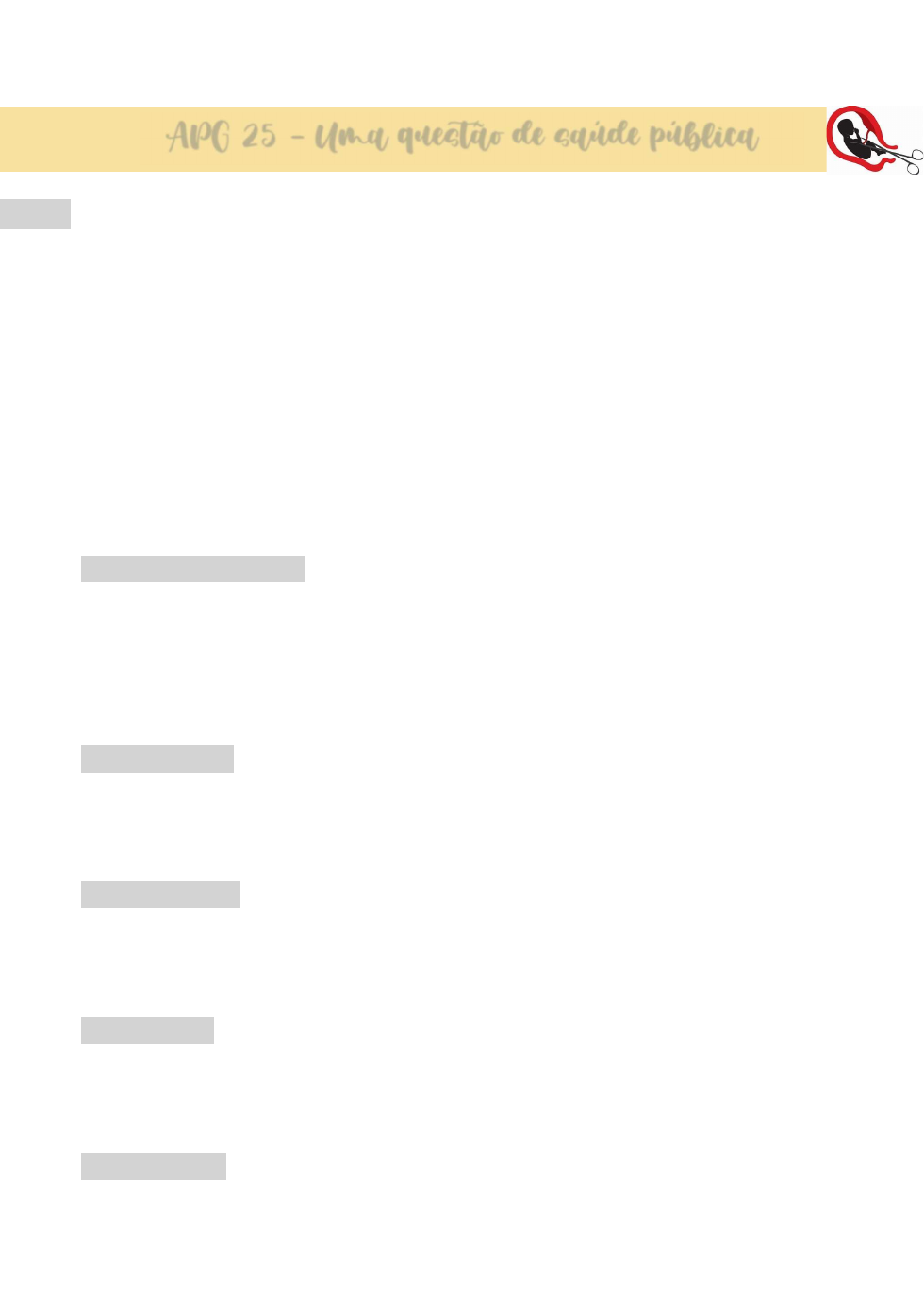 <p>1</p><p>S13P1</p><p>Carolina descobriu que estava grávida, ao contar a novidade para seu namorado, foi surpreendida</p><p>com o fim do relacionamento. Pressionada por ele aceitou interromper a gravidez de forma insegura. Com</p><p>12 semanas de gestação tomou o medicamento abortivo, porém o abortamento não foi completo, ��tive</p><p>infecção séria, perdi muito sangue e quase morri” relembra.</p><p>Essa história é compartilhada por milhares de mulheres, estima-se que ocorram anualmente no</p><p>Brasil cerca de 1 milhão de abortos ilegais, conforme dados do Ministério de Saúde.</p><p>Independente de serem induzidos ou espontâneo, os abortamentos demandam acompanhamento</p><p>médico. Sangramentos e a eliminação parcial do conteúdo da gestação, demandam procedimentos</p><p>específicos para garantir saúde dessas mulheres já fragilizadas.</p><p>1- PALAVRAS CHAVES:</p><p> - Interromper a gravidez.</p><p>- Infecção séria, muito sangue.</p><p>- Sangramentos e a eliminação parcial.</p><p>- Saúde fragilizadas.</p><p>2- PROBLEMA</p><p>- Em quais casos pode ser considerado legal?</p><p>- Quais os riscos?</p><p>3- HIPÓSTESE</p><p>- Casos de anencefalia, violência e risco para a mãe.</p><p>- Hemorragia, sepse e morte.</p><p>4- RESUMO</p><p>Aborto é a interrupção precoce da gestação antes que o feto seja capaz de sobreviver fora</p><p>do corpo da mãe.</p><p>5- OBJETIVO</p><p>- Compreender sobre a classificação e epidemiologia do aborto.</p><p>- Explicar a apresentação clínica do aborto (completa, incompleta, retida, infectada, inevitável e</p><p>habitual.</p><p>- Compreender o tratamento farmacológico e mecânico do aborto.</p><p>- Discutir sobre a legislação do aborto.</p><p>RENATA RAYANA DA SILVA OLIVEIRA</p><p>MEDICINA / 4 PERÍODO</p><p>SOI – IV / AFYA</p><p>APG 25 – Uma questão de saúde pública</p><p>2</p><p>O abortamento é a expulsão de feto pesando menos de 500 g ou com menos de 20 (22*)</p><p>semanas de gestação (Organização Mundial da Saúde [OMS], 1976; Fédération Internationale de</p><p>Gynécologie et d’Obstétrique [FIGO], 1976), podendo ser espontâneo ou provocado.</p><p>Abortamento é definido como a interrupção da gravidez, tanto induzida quanto espontânea, antes</p><p>que o feto seja viável, e aborto é o produto do abortamento (embrião ou feto e anexos).</p><p>Observação: Contudo, esses critérios são contraditórios até certo ponto, visto que o peso médio</p><p>ao nascer de um feto de 20 semanas é de 320 g enquanto o peso de 500 g é a média dos fetos de 22</p><p>a 23 semanas.</p><p>• No início da gestação, o abortamento é um evento comum. A maioria das perdas precoces se</p><p>origina de anormalidades genéticas ou de razões ainda não identificadas. Assim, a possibilidade de</p><p>prevenção é atualmente pequena.</p><p>• As mulheres com aborto mais tardio ou com abortos recorrentes têm mais chance de apresentar</p><p>uma causa repetitiva que pode ser modificada.</p><p>• Além dessas perdas espontâneas, pode-se optar pela interrupção da gestação. Tanto no caso de</p><p>abortamento induzido como no de abortamento espontâneo, evoluções no manejo levaram a opções</p><p>cirúrgicas e medicamentosas, e os profissionais devem compreender essas técnicas e as possíveis</p><p>complicações.</p><p>ETIOLOGIA</p><p>1. Alterações cromossômicas (aneuploidia - sindrome de turner*, trissomia do cromossomo 13, 16,</p><p>18, 21 e 22 - triploidia, tretraploidia);</p><p>2. Exposição materna a solventes;</p><p>3. Infecções (parasitas, ITU, vírus);</p><p>4. Diabetes, obesidade, doenças da tireoide, LES;</p><p>5. Consumo de café (>4 xícaras por dia);</p><p>6. Tabagismo;</p><p>7. Nutrição;</p><p>8. Exposição a raio X;</p><p>9. Incompetência cervical (inabilidade do colo de manter-se ocluído);</p><p>10. Miomas;</p><p>11. Uso de cocaína;</p><p>12. Ingestão de álcool (3 ou mais doses/dia);</p><p>13. Traumatismos maternos;</p><p>14. Síndrome dos ovários policísticos;</p><p>15. Sindrome antifosfolípide (abortamento, restrição do cresc. uterino, prematuridade,</p><p>descolamento prematuro de placenta e doença hipertensiva específica da gestação).</p><p>Observação: A idade materna e paterna avançada aumentam a incidência de alterações</p><p>cromossômicas.</p><p>PATOGÊNESE</p><p>• Patogenicamente, o primeiro evento que leva ao sangramento é a hemorragia na decídua basal,</p><p>com posterior necrose tecidual: atua como foco irritante e estimula as contrações miometriais que deter</p><p>minam maior descolamento placentário.</p><p>1. Abortamento anembrionado: Não contém elementos embrionários identificáveis na USG.</p><p>2. Abortamentos embrionados: Apresentam alguma anormalidade do desenvolvimento do embrião,</p><p>do feto, da vesícula vitelina ou, às vezes, da placenta.</p><p>3</p><p>CLASSIFICAÇÃO DO ABORTO</p><p>1. Precoce ou tardio: O abortamento é considerado precoce se ocorre até a 12ª semana e tardio</p><p>se ocorre entre a 12ª e 20ª semana.</p><p>2. Espontâneo ou provocado: O espontâneo ocorre sem nenhum tipo de intervenção externa,</p><p>podendo ser causado por doenças da mãe ou anormalidades do feto. O provocado decorre de uma</p><p>interrupção externa e intencional que acarreta na interrupção da gestação. Esta representa custos altos</p><p>para o Sistema Único de Saúde em consequência das suas complicações, principalmente, quando há</p><p>evolução para aborto infectado.</p><p>3. Esporádico ou habitual/recorrente: Os abortamentos esporádicos têm como principal causa as</p><p>anormalidades cromossômicas que chegam a abranger 50- 80% dos abortamentos esporádicos, sendo as</p><p>aneuploidias aquelas que representam maior frequência, seguidas das triploidias e tetraploidias. Chama-se</p><p>abortamento habitual aquele que ocorre 3 vezes ou mais na mesma gestante, neste caso, as principais</p><p>causas são: incompetên