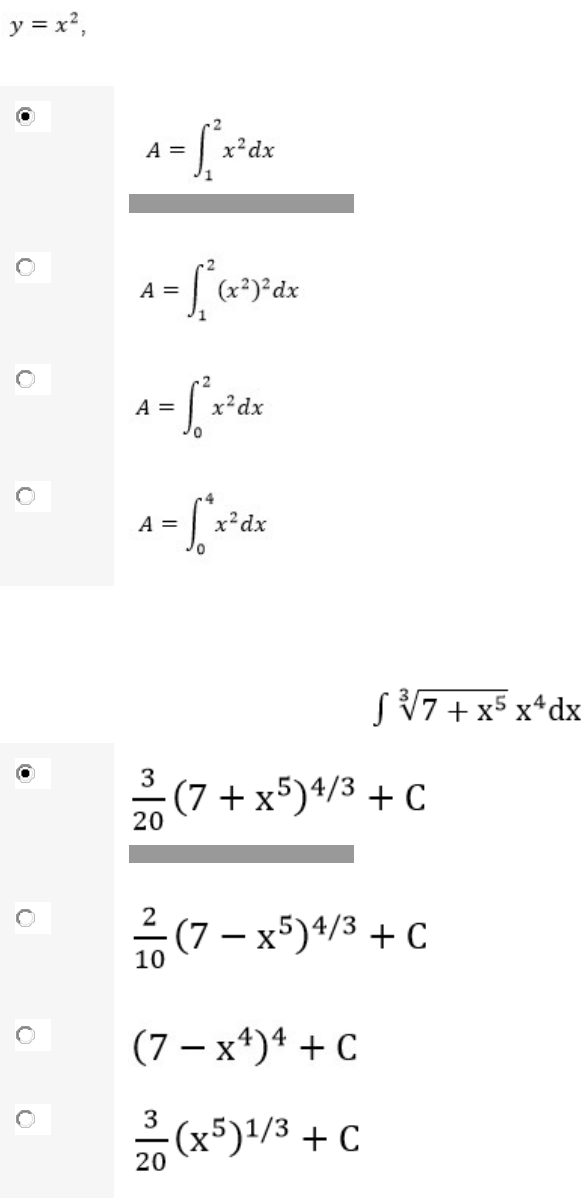 <p>Questão 1/10 - Cálculo Diferencial e Integral a Uma Variável</p><p>Como escrever a integral para calcular a área entre o eixo x, a reta x = 1, a reta x = 2 e a parábola</p><p>usando o eixo x como referência?</p><p>A</p><p>Você assinalou essa alternativa (A)</p><p>B</p><p>C</p><p>D</p><p>Questão 2/10 - Cálculo Diferencial e Integral a Uma Variável</p><p>Calcule a seguinte integral indefinida</p><p>A</p><p>Você assinalou essa alternativa (A)</p><p>B</p><p>C</p><p>D</p><p>Questão 3/10 - Cálculo Diferencial e Integral a Uma Variável</p><p>Calcule a seguinte integral definida</p><p>A</p><p>B</p><p>C</p><p>Você assinalou essa alternativa (C)</p><p>D</p><p>Questão 4/10 - Cálculo Diferencial e Integral a Uma Variável</p><p>Determinar a área entre as curvas</p><p>A</p><p>28/3 u.a.</p><p>B</p><p>64/3 u.a.</p><p>Você assinalou essa alternativa (B)</p><p>C</p><p>58/3 u.a.</p><p>D</p><p>67/3 u.a.</p><p>Questão 5/10 - Cálculo Diferencial e Integral a Uma Variável</p><p>Calcule a seguinte integral indefinida</p><p>A</p><p>B</p><p>C</p><p>D</p><p>Você assinalou essa alternativa (D)</p><p>Questão 6/10 - Cálculo Diferencial e Integral a Uma Variável</p><p>Ache os pontos críticos da função f definida por f(x)=x³+7x²-5x.</p><p>A</p><p>Você assinalou essa alternativa (A)</p><p>B</p><p>C</p><p>D</p><p>Questão 7/10 - Cálculo Diferencial e Integral a Uma Variável</p><p>Calcule a seguinte integral indefinida</p><p>A</p><p>B</p><p>C</p><p>Você assinalou essa alternativa (C)</p><p>D</p><p>Questão 8/10 - Cálculo Diferencial e Integral a Uma Variável</p><p>Calcule a seguinte integral definida</p><p>A</p><p>B</p><p>Você assinalou essa alternativa (B)</p><p>C</p><p>D</p><p>Questão 9/10 - Cálculo Diferencial e Integral a Uma Variável</p><p>Calcule a seguinte integral definida</p><p>A</p><p>Você assinalou essa alternativa (A)</p><p>B</p><p>C</p><p>D</p><p>Questão 10/10 - Cálculo Diferencial e Integral a Uma Variável</p><p>Uma escada de 6m de comprimento está apoiada em uma parede vertical. Se a base da escada começa a deslizar horizontalmente, à razão de 0,5 m/s, com que velocidade o topo da escada percorre a parede, quando está a 5m do solo?</p><p>A</p><p>-0,7856 m/s</p><p>B</p><p>-0,3316 m/s</p><p>Você assinalou essa alternativa (B)</p><p>C</p><p>-0,5472 m/s</p><p>D</p><p>-0,5077 m/s</p><p>image5.png</p><p>image6.png</p><p>image7.png</p><p>image8.png</p><p>image9.png</p><p>image10.png</p><p>image11.png</p><p>image12.png</p><p>image13.png</p><p>image14.png</p><p>image15.png</p><p>image16.png</p><p>image17.png</p><p>image18.png</p><p>image19.png</p><p>image20.png</p><p>image21.png</p><p>image22.png</p><p>image23.png</p><p>image24.png</p><p>image1.png</p><p>image25.png</p><p>image26.png</p><p>image27.png</p><p>image28.png</p><p>image29.png</p><p>image2.wmf</p><p>image30.png</p><p>image31.png</p><p>image32.png</p><p>image33.png</p><p>image34.png</p><p>image35.png</p><p>image36.png</p><p>image37.png</p><p>image38.png</p><p>image39.png</p><p>image40.png</p><p>image3.png</p><p>image41.png</p><p>image42.png</p><p>image4.wmf</p>