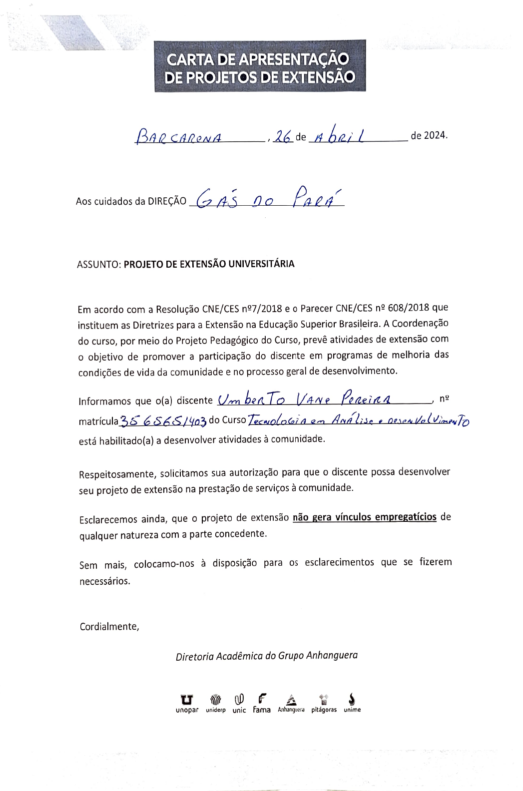 <p>CARTA DE APRESENTAÇÃO</p><p>DE PROJETOS DE EXTENS</p><p>BAe cARenA</p><p>Aos cuidados da DIREÇÃO</p><p>26 de_ beil</p><p>ASSUNTO: PROJETO DE EXTENSÃO UNIVERSITÁRIA</p><p>Em acordo com a Resolução CNE/CES n7/2018 e o Parecer CNE/CES n 608/2018 que</p><p>instituem as Diretrizes para a Extensão na Educação Superior Brasileira. A Coordenação</p><p>do curso, por meio do Projeto Pedagógico do Curso, prevê atividades de extensão com</p><p>o objetivo de promover a participação do discente em programas de melhoria das</p><p>condições de vida da comunidade e no processo geral de desenvolvimento.</p><p>Informamos que o(a) discente (mhenlo lane Leaeira</p><p>Cordialmente,</p><p>de 2024.</p><p>matríicula 3,66S6S/y3 do Curso ZecaQloGia ea Análise Desea talLiauTo</p><p>está habilitado(a) a desenvolver atividades à comunidade.</p><p>Respeitosamente, solicitamos sua autorização para que o discente possa desenvolver</p><p>seu projeto de extensão na prestação de serviços à comunidade.</p><p>n</p><p>Esclarecemos ainda, que o projeto de extensão não gera vínculos empregatícios de</p><p>qualquer natureza com a parte concedente.</p><p>Sem mais, colocamo-nos à disposição para os esclarecimentos que se fizerem</p><p>necessários.</p><p>Diretoria Acadêmica do Grupo Anhanguera</p><p>Unopar uniderp unic fama Anhanguera pitágoras unime</p><p>Organização:</p><p>TERMO DE AUTORIZAÇAO PARA</p><p>REALIZAÇAO DAS ATIVIDADES</p><p>EXTENSIONISTAS</p><p>CNPI: O8 454 44LLoot-Zs</p><p>Endereço Completo da Organização: Seadeoa lemas3 sGb</p><p>Nome do Representante da Organização: AGo 24 Sa CarValho</p><p>Considerando que a Instituição de Ensino Superior desenvolve projetos de extensão</p><p>com o objetivo de aplicar o conhecimento acadêmico em contextos práticos e promover</p><p>o desenvolvimento profissional dos estudantes, a Organização reconhece a importância</p><p>da colaboração com as instituições educacionais e está disposta a apoiar iniciativas que</p><p>contribuam para o desenvolvimento educacional e profissional de estudantes</p><p>universitários.</p><p>Este Termo tem por objeto a autorização concedida pela Organização para a realização</p><p>do projeto de extensão universitária denominado ume là SieAi[icaIA</p><p>em nossas dependências.</p><p>A Organização se compromete a fornecer o acesso às suas instalações, equipamentos e</p><p>recursos necessários para a realização do projeto de extensão, e designará um</p><p>funcionário como ponto de contato para facilitar a comunicaç�o e o apoio ao projeto.</p><p>Este Termo vigorará a partir da data de sua assinatura até a conclusão do projeto de</p><p>extensão, conforme cronograma acordado.</p><p>[Representante da Organização]</p><p>(Nome e Cargol: Jnisio Gsngeno CaEDENa doe</p><p>[Carimbo da Organização]</p><p>Unopar uniderp unic fama Anhanguera pitágoras unime</p><p>ManuräNGo.</p><p>1</p><p>DADOS DO ALUNO:</p><p>Aluno: [Nome completo]</p><p>UMBERTO VANE PEREIRA</p><p>RA: [Número do RA do aluno]</p><p>3565651403</p><p>POLO / UNIDADE:</p><p>BARCARENA/PARÁ</p><p>CURSO:</p><p>CST EM ANÁLISE E DESENVOLVIMENTO DE SISTEMAS</p><p>COMPONENTE CURRICULAR:</p><p>PROJETO DE EXTENSÃO I - ANÁLISE E DESENVOLVIMENTO DE SISTEMAS</p><p>PROGRAMA DE EXTENSÃO:</p><p>PROGRAMA DE CONTEXTO À COMUNIDADE.</p><p>FINALIDADE E MOTIVAÇÃO:</p><p>A finalidade da extensão no Programa de Contexto à Comunidade do Curso Superior</p><p>de Tecnologia em Análise e Desenvolvimento de Sistemas é dedicar-se a área</p><p>educacional e o transferir do saber, desenvolvendo e capacitando a comunidade</p><p>local e agregando conhecimentos por meio de projetos e atividades pedagógicas</p><p>extensionistas. Nesse programa é possível a ministração de palestras, aulas de</p><p>monitoria, cursos, aulas de educação básica, educação financeira, língua estrangeira,</p><p>debates da comunidade local, participação em projetos sociais, projetos coletivos</p><p>multidisciplinar e trabalhos voluntários. Os locais que poderão contemplar esse</p><p>projeto extensionistas podem ser: parcerias com a prefeitura; associações de</p><p>bairros, escolas, empresas públicas e privadas, igrejas, ONGs e por meio de redes de</p><p>internet.</p><p>COMPETÊNCIAS:</p><p>I - Interpretar e elaborar gráficos, tabelas e diagramas;</p><p>II - Desenvolver programas de computador empregando linguagens de programação</p><p>e raciocínio lógico;</p><p>III - Projetar e implementar o armazenamento e o tratamento de dados em sistemas</p><p>computacionais.</p><p>PERFIL DO EGRESSO:</p><p>O perfil do egresso idealizado pela IES para o Curso Superior de Tecnologia em Análise</p><p>e Desenvolvimento de Sistemas possibilita a formação de um profissional crítico,</p><p>reflexivo, criativo, visão holística, humanista e ético, capaz de aplicar tecnologias</p><p>inerentes à sua área de atuação, sendo que pelas atividades extensionistas vinculadas</p><p>ao Programa de Extensão Contexto à Comunidade, esse egresso poderá desenvolver</p><p>2</p><p>habilidades e capacidade para conduzir atividades pedagógicas e de ensino referentes</p><p>à compreensão da realidade social, ser capaz de reconhecer as necessidades dos</p><p>usuários, adotar perspectivas multidisciplinares e transdisciplinares em sua prática,</p><p>considerar aspectos políticos, econômicos, sociais do meio em que está inserido,</p><p>direcionando suas ações para a transformação da realidade e para o desenvolvimento</p><p>social.</p><p>SOFT SKILLS (COMPETÊNCIAS SOCIOEMOCIONAIS):</p><p>Criatividade e inovação</p><p>Comunicação Interpessoal</p><p>Planejamento e organização</p><p>OBJETIVOS DE APRENDIZAGEM:</p><p>Os objetivos da extensão no Curso Superior de Tecnologia em Análise e</p><p>Desenvolvimento de Sistemas vinculados ao Programa de Contexto à Comunidade</p><p>estão relacionados com a disseminação do saber da área de ciências para a</p><p>