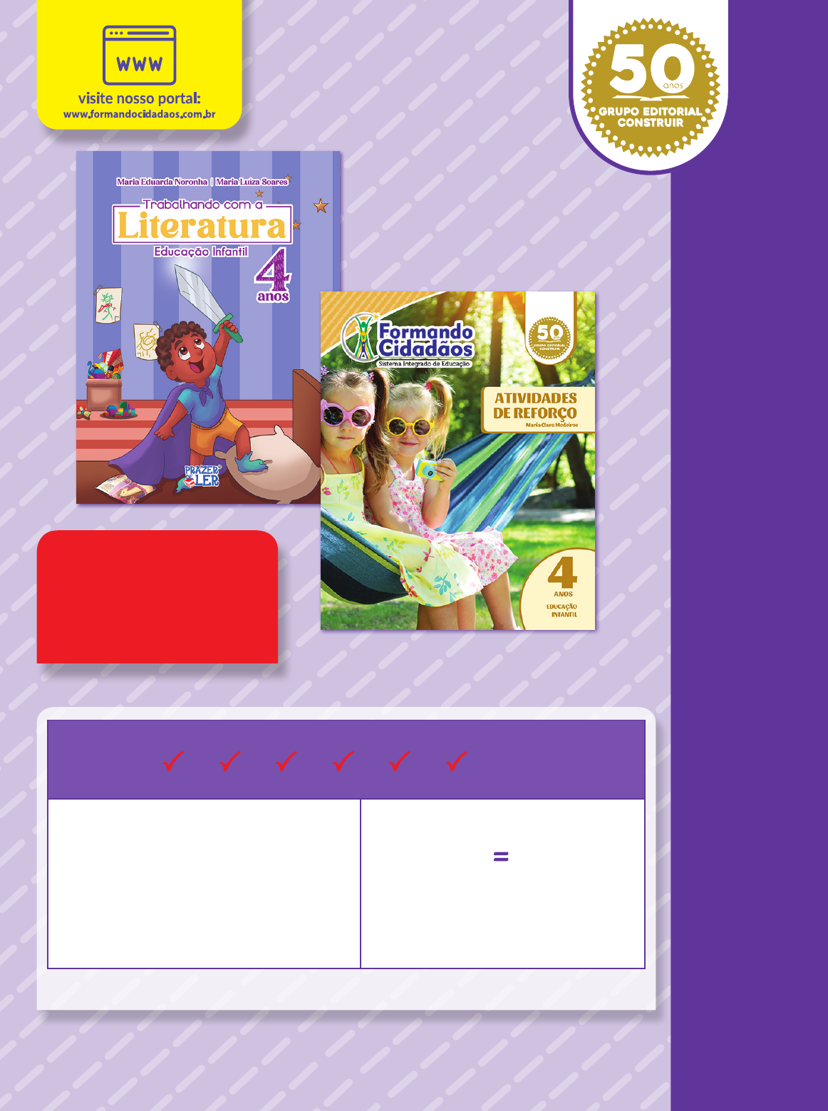 <p>M</p><p>AN</p><p>UA</p><p>L D</p><p>O</p><p>ED</p><p>UC</p><p>AD</p><p>O</p><p>R</p><p>FO</p><p>RM</p><p>AÇ</p><p>ÃO</p><p>C</p><p>ON</p><p>TI</p><p>NU</p><p>AD</p><p>A</p><p>PREÇO GARANTIDO POR 8 ANOS:</p><p>2018 • 2019 • 2020 • 2021 • 2022 • 2023 • 2024 • 2025</p><p>DE 1º DE SETEMBRO DE 2017 ATÉ 31 DE AGOSTO DE 2025.</p><p>KIT C – 4 ANOS</p><p>2 Livros: Trabalhando com a Literatura +</p><p>Atividades de Reforço</p><p>2 livros = 128 páginas</p><p>R$ 0,24 por página.</p><p>R$ 30,70</p><p>EDIÇÃO</p><p>2024-2025-2026</p><p>FC_ME_KIT_C_2ASa5A.indd 3 28/06/23 15:58</p><p>Maria Clara Medeiros</p><p>MANUAL DO</p><p>EDUCADOR</p><p>4ANOS</p><p>EDUCAÇÃO INFANTIL</p><p>FORMAÇÃO CONTINUADA</p><p>ATIVIDADES DE REFORÇO</p><p>TRABALHANDO COM A LITERATURA</p><p>FC_ME_KIT_C_4AS_EI.indd 1 20/06/2023 17:26</p><p>Maria Clara Medeiros</p><p>Atividades de Reforço</p><p>Trabalhando com a Literatura</p><p>4 anos - Educação Infantil</p><p>Reprodução proibida.</p><p>Art. 184 do Código Penal e Lei no 9.610, de 19 de fevereiro de 1998.</p><p>Fizeram-se todos os esforços para localizar os detentores dos direitos das fotos,</p><p>das ilustrações e dos textos contidos neste livro.</p><p>A Formando Cidadãos Editora pede desculpas se houve alguma omissão e,</p><p>em edições futuras, terá prazer em incluir quaisquer créditos faltantes.</p><p>ISBN: 978-85-403-2186-1</p><p>2a edição</p><p>Manual do Educador</p><p>Formação Continuada</p><p>COORDENAÇÃO EDITORIAL</p><p>DIREITOS RESERVADOS À</p><p>MULTI MARCAS EDITORIAIS LTDA.</p><p>Rua Neto Campelo Júnior, 37</p><p>Mustardinha - Recife / PE</p><p>CEP: 50760-330</p><p>Fone: (81) 3447.1178</p><p>CNPJ: 00.726.498/0001-74</p><p>IE: 0214538-37</p><p>EDITORAS</p><p>Isabela Nóbrega</p><p>Márcia Regina Silva</p><p>Solange Duarte</p><p>REVISÃO DE TEXTO</p><p>Elenita Maciel</p><p>PROJETO GRÁFICO</p><p>Mirai Design e Comunicação Ltda.</p><p>EDITORAÇÃO ELETRÔNICA</p><p>Alexsandro J. de Santana</p><p>Roseane R. Nascimento</p><p>IMAGENS VETORIAIS</p><p>Freepik.com</p><p>Shutterstock.com</p><p>FC_ME_KIT_C_4AS_EI.indd 2FC_ME_KIT_C_4AS_EI.indd 2 21/06/2023 17:47:4821/06/2023 17:47:48</p><p>Atividades de Reforço</p><p>Trabalhando com a Literatura</p><p>4 anos - Educação Infantil</p><p>Apresentação</p><p>Prezado educador,</p><p>Não basta saber, é preciso também aplicar;</p><p>não basta querer, é preciso também fazer.</p><p>Johann Wolfgang Von Goethe</p><p>Organizamos, de maneira simples e criativa, seu Manual, que faz parte do Kit C.</p><p>Sabemos que a sua competência poderá trazer mais sugestões para sua sala de</p><p>aula, além das que estamos oferecendo.</p><p>Lembrando que todo educador sempre será luz na vida de todos que passarem em</p><p>sua vida. Gratidão por fazer parte do grupo de educadores especiais.</p><p>Neste Manual, apresentamos Atividade de Reforço e Literatura Infantil com os se-</p><p>guintes títulos: Mãozinha feliz; O pequeno gatinho xadrez; O monstrinho do dente e Hora</p><p>do banho, hora feliz.</p><p>Nele, você encontrará orientações didáticas, fundamentações e embasamento teóri-</p><p>co para sua prática diária, pois acreditamos que serão de grande importância para você.</p><p>Esperamos contribuir para suas aulas, tornando-as mais encantadoras e envolventes.</p><p>Tenha um excelente ano letivo!</p><p>Grande abraço,</p><p>Maria Clara Medeiros</p><p>FC_ME_KIT_C_4AS_EI.indd 3FC_ME_KIT_C_4AS_EI.indd 3 21/06/2023 10:14:3021/06/2023 10:14:30</p><p>Sumário</p><p>Trabalhando com a Literatura</p><p>Sugestões de como trabalhar as Literaturas</p><p>Fundamentação: A roda de conversa</p><p>Atividades de Reforço</p><p>Sugestões de como trabalhar as Atividades de Reforço</p><p>Fundamentação: Inteligências múltiplas</p><p>5</p><p>6</p><p>10</p><p>11</p><p>12</p><p>16</p><p>ar</p><p>le</p><p>e</p><p>/ s</p><p>to</p><p>ck</p><p>.a</p><p>do</p><p>be</p><p>.c</p><p>om</p><p>4</p><p>FC_ME_KIT_C_4AS_EI.indd 4 20/06/2023 17:26</p><p>A leitura é uma arma de sobrevivência do homem. Quem lê vive melhor. Assim, as crianças</p><p>precisam ler, de todas as maneiras. Devem ter acesso à literatura infantil, com seu texto ou</p><p>imagens. Precisam também ouvir histórias contadas pelos adultos. E têm direito à informa-</p><p>ção garantida pelos meios de comunicação. Direito de ler o mundo.</p><p>Elizabeth D’ Angelo Serra</p><p>anos</p><p>Maria Eduarda Noronha | Maria Luíza Soares</p><p>Trabalhando_com_a_literatura_4as_CCc.indd 1 27/01/2023 10:19</p><p>Trabalhando com a Literatura</p><p>5</p><p>FC_ME_KIT_C_4AS_EI.indd 5 20/06/2023 17:26</p><p>Sugestões de como trabalhar as Literaturas</p><p>Hora da historinha</p><p>Promova uma troca de leitura entre os alu nos, em que as turmas mais velhas possam ler para as</p><p>turmas mais novas. É possível trabalhar fábulas ou livros infantis adequados à idade da turma. É</p><p>interessante trabalhar fábulas clássi cas, pois todas possuem uma lição de moral, que serve para</p><p>criar debates com os alunos e promover a criticidade. Você também pode incentivar a criação</p><p>artística por meio de dese nhos e pinturas das personagens retratadas.</p><p>Ambientando a leitura</p><p>Para trabalhar a literatura Mãozinha feliz, promova uma atividade a respeito do hábito de lavar as</p><p>mãos e da importância dele. Con feccione de forma criativa ou desenhe uma torneira com água</p><p>e afixe-a em algum ponto da sala de aula. Depois, cante com os alunos a música Lavar as mãos,</p><p>de Arnaldo Antunes, incentivando que cada um fique por um tempo embaixo da torneira que você</p><p>criou.</p><p>Lavar as Mãos</p><p>Uma</p><p>Lava outra, lava uma (mão).</p><p>Lava outra, lava uma (mão).</p><p>Lava outra (mão), lava uma mão.</p><p>Lava outra (mão).</p><p>Lava uma.</p><p>Depois de brincar no chão de areia a tarde inteira.</p><p>Antes de comer, beber, lamber, pegar na mamadeira.</p><p>Lava uma (mão), lava outra (mão).</p><
