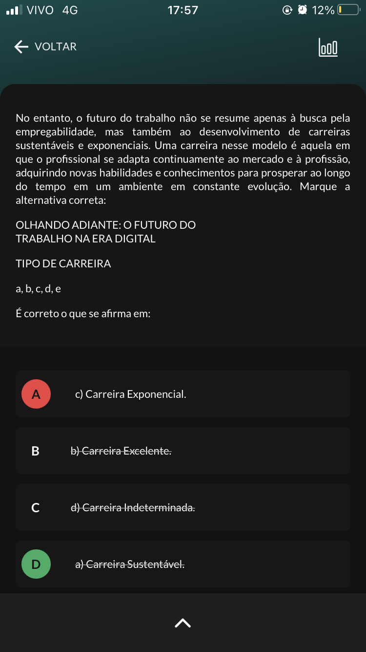 <p>VIVO 4G 17:57 12% VOLTAR No entanto, futuro do trabalho não se resume apenas à busca pela empregabilidade, mas também ao desenvolvimento de carreiras sustentáveis e exponenciais. Uma carreira nesse modelo é aquela em que profissional se adapta continuamente ao mercado e à profissão, adquirindo novas habilidades e conhecimentos para prosperar ao longo do tempo em um ambiente em constante evolução. Marque a alternativa correta: OLHANDO ADIANTE: O FUTURO DO TRABALHO NA ERA DIGITAL TIPO DE CARREIRA a, b, C, d, e É correto que se afirma em: A c) Carreira Exponencial. B Indeterminada. D a) Carreira Sustentável.</p>