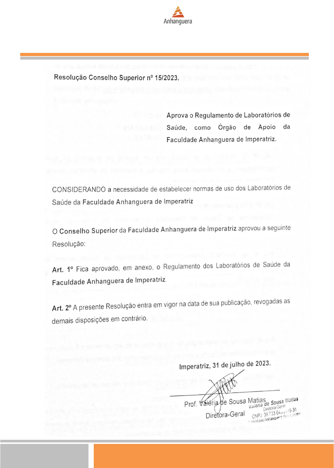 <p>Faculdade Anhanguera de Imperatriz</p><p>Rua Barão do Rio Branco, 300 – Centro – Imperatriz/MA</p><p>Cep: 65.900-430Telefone: (99) 2101-6000</p><p>Faculdade Anhanguera de Imperatriz</p><p>Rua Barão do Rio Branco, 300 – Centro – Imperatriz/MA</p><p>Cep: 65.900-430Telefone: (99) 2101-6000</p><p>REGULAMENTO DOS LABORATÓRIOS DE SAÚDE DA FACULDADE</p><p>ANHANGUERA DE IMPERATRIZ</p><p>(ANEXO DA RESOLUÇÃO nº15/2023)</p><p>TÍTULO I</p><p>DISPOSIÇÕES GERAIS</p><p>Art. 1º Os laboratórios de Saúde são um suporte no processo de ensino-</p><p>aprendizagem, a ser utilizado pelos docentes e discentes de diferentes cursos da</p><p>Faculdade Anhanguera de Imperatriz.</p><p>Art. 2º O Regulamento deve ser seguido por todos os colaboradores que atuam nos</p><p>Laboratórios de Saúde da Faculdade Anhanguera de Imperatriz, para o</p><p>aperfeiçoamento de suas funções e deveres na Instituição.</p><p>Art. 3º As atividades desenvolvidas no Laboratório de Saúde devem estar</p><p>relacionadas ao desenvolvimento de estudos de natureza teórica e/ou metodológica</p><p>e/ou aplicada.</p><p>CAPÍTULO I</p><p>DOS OBJETIVOS</p><p>Art. 4º Esse regulamento origina-se com o objetivo de regulamentar o funcionamento</p><p>dos Laboratórios de Saúde e atender às necessidades dos alunos e docentes.</p><p>Art. 5º O regulamento deve ser seguido por todos que utilizam os laboratórios.</p><p>Art. 6º A finalidade do laboratório é possibilitar ao aluno a realização de atividades</p><p>práticas que venham a complementar seu aprendizado teórico e assim incrementar</p><p>sua formação e a produção de trabalhos acadêmicos.</p><p>Faculdade Anhanguera de Imperatriz</p><p>Rua Barão do Rio Branco, 300 – Centro – Imperatriz/MA</p><p>Cep: 65.900-430Telefone: (99) 2101-6000</p><p>Art. 7º Possibilitar o desenvolvimento de estudos e pesquisas, tanto básicas como</p><p>aplicadas, no sentido de proporcionar o avanço no conhecimento dos temas definidos</p><p>no projeto pedagógico.</p><p>CAPÍTULO II</p><p>ESTRUTURA FUNCIONAL</p><p>Art. 8º Na estrutura funcional dos Laboratórios de Saúde devem atuar:</p><p>I. Técnico de Laboratório</p><p>II. Coordenador de Laboratório</p><p>III. Professores</p><p>IV. Coordenadores de curso</p><p>V. Gerência Operacional</p><p>Parágrafo Único: O Técnico de Laboratório responde para o Coordenador de</p><p>Laboratório e este responde diretamente ao Gerente Operacional. Os Coordenadores</p><p>de curso e Professores são clientes da equipe dos Laboratórios, não tendo autonomia</p><p>para interferir nos processos dos Laboratórios. O Coordenador de Laboratório pode</p><p>acionar a Gerência Operacional para auxílio em questões operacionais dos</p><p>laboratórios.</p><p>TÍTULO II</p><p>NORMAS DE FUNCIONAMENTO</p><p>CAPÍTULO I</p><p>EXPEDIENTES</p><p>Art. 9º O Laboratório de Saúde deve seguir o horário das aulas da Faculdade</p><p>Anhanguera de Imperatriz, podendo ser alterado conforme a necessidade acadêmica.</p><p>CAPÍTULO II</p><p>Faculdade Anhanguera de Imperatriz</p><p>Rua Barão do Rio Branco, 300 – Centro – Imperatriz/MA</p><p>Cep: 65.900-430Telefone: (99) 2101-6000</p><p>COMPETÊNCIAS</p><p>Art. 10º Compete ao coordenador de curso:</p><p>I. Orientar os professores quanto às normas de utilização dos laboratórios;</p><p>II. Enviar disciplinas práticas do próximo semestre ao Coordenador de laboratório</p><p>para início do processo de compra de materiais;</p><p>III. Elaborar a grade de ocupação dos laboratórios junto com o Coordenador de</p><p>laboratório;</p><p>IV. Encaminhar avaliações sobre o laboratório ao Coordenador de laboratório;</p><p>V. Orientar Professores sobre a dinâmica de uso do laboratório, junto com o</p><p>Coordenador de laboratório;</p><p>VI. Participar de reuniões semestrais com o Coordenador de laboratório e</p><p>professores das aulas práticas, a fim de adquirir conhecimento e informações</p><p>sobre a utilização dos laboratórios e seu bom andamento nas aulas práticas.</p><p>Art. 11º Compete ao professor especialista:</p><p>I. Transmitir os conhecimentos utilizando os materiais disponíveis para a aula</p><p>prática;</p><p>II. Orientar os alunos que o uso dos laboratórios somente é permitido conforme</p><p>as normas de segurança ali descritas, sendo o principal exemplo a todos;</p><p>III. Verificar a dinâmica da aula com o Técnico antes do iniciar a aula,</p><p>preferencialmente sem alunos dentro do laboratório;</p><p>IV. Relatar qualquer ocorrência ao técnico de maneira discreta;</p><p>V. Manter a organização dos laboratórios após o término de aula;</p><p>VI. Enviar os roteiros de aulas práticas datados para o Coordenador de laboratório</p><p>no início do semestre letivo.</p><p>Faculdade Anhanguera de Imperatriz</p><p>Rua Barão do Rio Branco, 300 – Centro – Imperatriz/MA</p><p>Cep: 65.900-430Telefone: (99) 2101-6000</p><p>Art. 12º Compete ao Coordenador de laboratório:</p><p>I. Participar de reuniões semestrais com os coordenadores de curso e</p><p>professores de aulas práticas, para repassar informações sobre a utilização dos</p><p>laboratórios e bom andamento das aulas práticas;</p><p>II. Participar de reuniões bimestrais com os técnicos para discutir e repassar</p><p>soluções para o bom andamento da equipe e das aulas práticas;</p><p>III. Elaborar a grade de ocupação dos laboratórios, todo início de semestre, com a</p><p>colaboração dos coordenadores de curso;</p><p>IV. Realizar o processo de compras e manter a planilha de controle de estoque</p><p>sempre atualizada;</p><p>V. Os materiais a serem comprados devem ser definidos conforme os roteiros das</p><p>aulas práticas que serão ministradas no semestre em que se refere, por isso</p><p>devem pedir auxílio à Coordenação dos cursos de Saúde e obter essa</p><p>informação;</p><p>VI. Adquirir os roteiros de aulas práticas e verificar os materiais de estoque para</p><p>definir qu